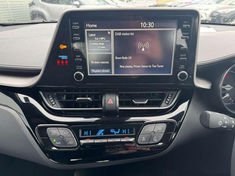 4.2" coloured TFT screen for multi-information display, Adaptive cruise control, Apple car play and Android auto, Bluetooth connectivity, E-call, Electric power steering, Hybrid system indicator, Lane departure alert with steering control, Lane trace assist, Push button start, Push button tailgate release, Remote boot door release in cabin, Remote boot door release in key, Reversing camera, Road sign assist - RSA, Smart voice assist, Trip computer, Voice recognition, Vehicle Stability Control (VSC), 6 speakers, AM/FM radio, DAB Radio (Digital Audio Broadcasting), Toyota touch 2 multimedia system with 8" display, USB connector, Wi-fi connectivity, Anti-jam protection on power windows, Auto high beam, Auto up and down function on all power windows, Automatic headlights, Automatic headlights cut-off, Black and body coloured rear bumper, Black lower front grille, Black upper front grille, Body colour door handles, Body colour door mirrors, Body colour front spoiler lip, Body coloured front bumper, Boot door release with push button, Electric heated door mirrors, Follow me home headlights, Front and rear power windows, Front fog lights, Headlight cut off reminder, Honeycomb lower front grille, LED daytime running lights, LED High mounted stop light, LED rear brake lights, LED rear combination lights, Manual headlight levelling, Manually retractable door mirrors, Noise reduction layer on front windows and windscreen, Power adjustable door mirrors, Rear side wing doors, Rear spoiler, Rear tailgate, Rear window defogger, Rear window wiper, Reflective LED headlights, Shark fin antenna, UV-filter on driver and passenger windows, UV-filter on rear windows, Variable front intermittent wipers, 12v power outlet - front, 3 rear headrests, 3 seat bench in 2nd row, 3 spoke leather steering wheel, 60/40 split folding 2nd row rear seats, Adjustable rear headrests, Adjustable speed limiter switch on steering wheel, Assist grips front and centre pillar, Audio and telephone switches on steering wheel, Black front door assist grips, Boot light, Chrome interior door handles, Cloth upholstery, Driver and front passenger personal light, Driver and front passenger Whiplash Injury Lessening seats, Dual zone automatic air conditioning, Floor mats, Front cupholders, Front head restraints, Front sports seats, Glovebox with internal light, Hard tonneau cover, Hooks for luggage holding net, Humidifying Nanoe air purifier, Illuminated entry system, Isofix attachments on outer rear seats, Leather gearshift, Light on driver sun visor, Light on passenger sun visor, Manual telescopic steering wheel, Manual tilt steering wheel, Manually adjustable lumbar support on driver seat, Manually height adjustable driver seat, Manually height adjustable front passenger seat, Manually reclining driver seat, Manually reclining front passenger seat, Manually sliding driver seat, Manually sliding front passenger seat, Microphone on front personal light, Mirror on driver sun visor, Mirror on passenger sun visor, Multimedia switches on steering wheel, Pollen filter, Shopping bag hooks, Single front passenger seat, Slow opening on lower glovebox, Voice recognition switch on steering wheel, 16 Disk front wheel brake, 3x3 point rear seatbelts, ABS+EBD+Brake assist, Electronic parking brake, Front and rear seatbelt reminder, Front passenger airbag on/off switch, Hill start assist control (HAC), Pre collision system with pedestrian detection, Pre-tensioners and force limiters, Rear door child safety locks, SRS Airbags - Driver + Front passenger, front side, front and rear curtain and driver's knee airbags, Toyota safety sense, Tyre pressure monitoring system, Tyre pressure warning system, Acoustic vehicle alert system (AVAS), Glass-breaking alarm sensors, Immobiliser, Intrusion alarm, Intrusion sensor, Motion sensor alarm, Power door locks, Power passenger window lock, Remote central locking, Black lower dashboard, Black upper dashboard, Grey deco line on upper dashboard, Matte black centre console, Tyre repair kit,