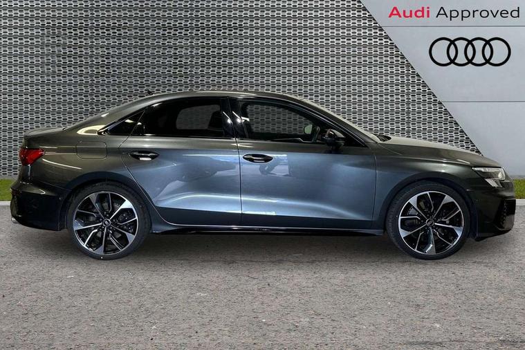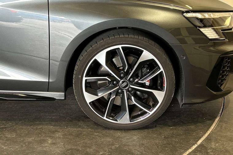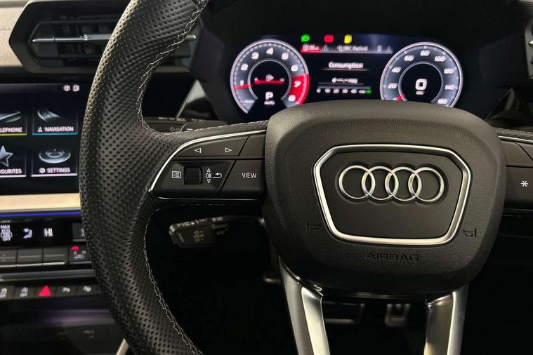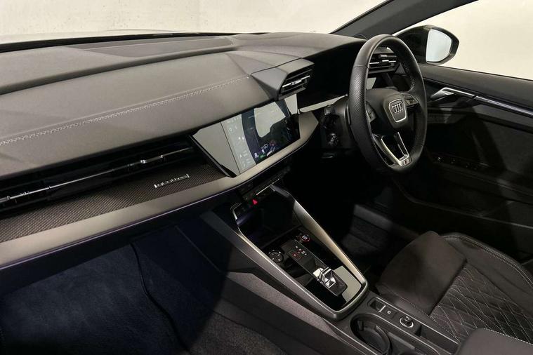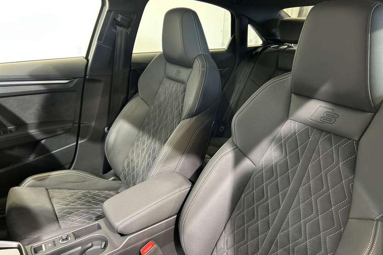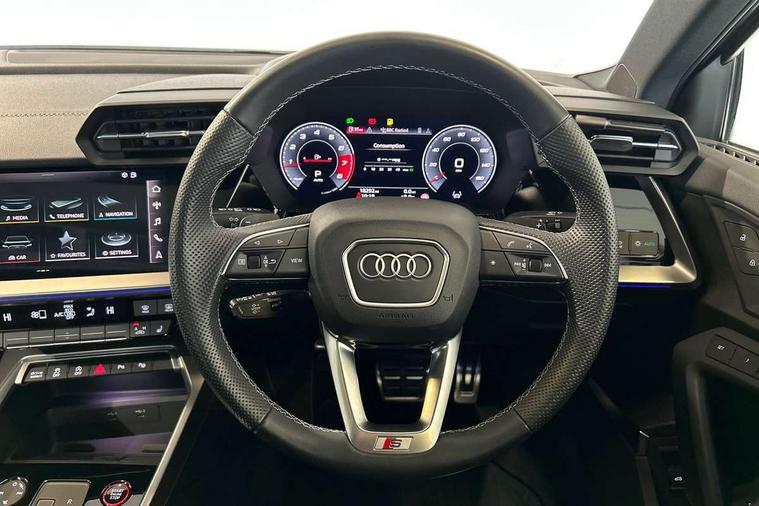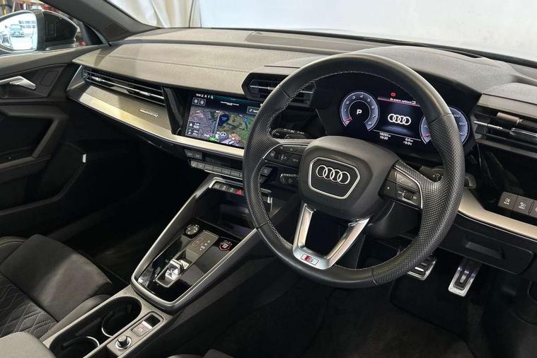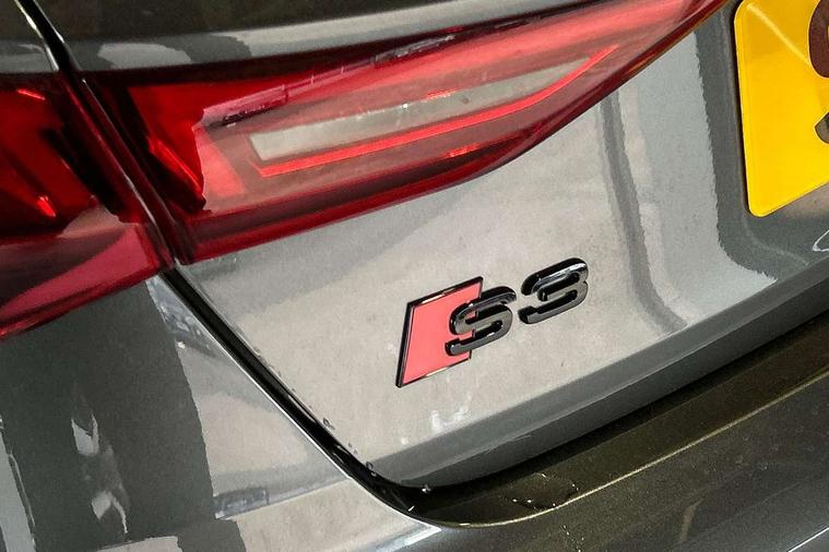 Audi connect emergency call and service, Audi drive select (Auto, Comfort, Dynamic, Efficiency and Individual), Audi smartphone interface, Audi virtual cockpit plus - 12.3" dynamic digital instrument cluster, Automatic start/stop system with recuperation, Bluetooth interface, Collision avoidance assistant, Head up Display, Lane change assistant with exit warning system and rear cross traffic alert, Lane departure warning system, MMI Navigation Plus with high resolution 10.1" colour touch screen display, Power operated tailgate - Luggage compartment lid opens electrically, Progressive steering, Service indicator, Voice control system with natural language interaction, Quattro permanent all wheel drive, S suspension with damper control, 2x USB Type C ports (for charging and data transfer), CD player, DAB Digital radio, 3rd brake light, Acoustic glass windscreen, Audi Beam uses LEDs to project Vorsprung onto the ground as you exit your S3, Auto dimming frameless rear view mirror, Carbon door mirror housings, Dual branch oval twin tailpipes in chrome plated finish, Electrically adj heated/folding + automatically dimming exterior mirrors with memory + automatic kerb side function for passenger side exterior mirror, Front electric windows, Headlight washers, Heat insulating glass windscreen, Illuminated door sills with aluminium inserts at the front with S logo, Integrated LED indicators in door mirrors, LED daytime running lights, Light and rain sensors, Model and engine designation badges at rear, Privacy glass - dark tinted rear window, rear door and side windows, Rear boot, Rear electric windows, Rear side wing doors, 12V socket and storage compartment in front centre console, 3 seat bench in 2nd row, 3 spoke leather multifunction steering wheel with gear shift paddles, 4 way electrically adjustable lumbar support for driver and front passenger, 60/40 split folding rear seat bench, Black cloth headlining, Dual zone electronic climate control, Fine Nappa leather upholstery with front sports seats S embossed logo, Front and rear centre armrest in leather, Front and rear headrests, Front/rear floor mats, Height and reach adjustable steering wheel, Interior lighting - glove compartment light and right hand side, Luggage compartment floor covering, Single front passenger seat, Stainless steel pedals and front footrest in black, Aluminium interior elements pack - A3, Black styling pack - A3 Saloon Vorsprung, Body styling design pack - S3, Driver assistance pack - A3/S3 S Tronic, Extended ambient lighting pack - A3/S3 Saloon, Storage pack - A3/S3 Saloon, Technology pack pro with 360 camera - A3 Saloon/Voursprung, 3x3 point rear seat belts, Driver and front passenger airbag with passenger airbag deactivation, Electronic Stabilisation Control (ESC) including ABS, ASR and EDL, First aid kit with warning triangle and 2 safety vests, Front side airbags with head airbags and interaction airbag, Pre-sense front with pedestrian and cyclist detection, Seatbelt monitoring, Tyre pressure loss indicator, Anti theft alarm, Anti-theft wheel bolts, Electronically operated child locks, Immobiliser, Remote control central locking, Aluminium air vent surrounds, Carbon inlays, accent surfaces in the dashboard and centre console in platinum grey silk effect paint finish,