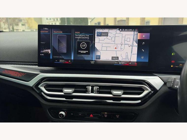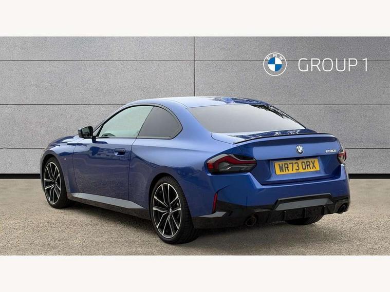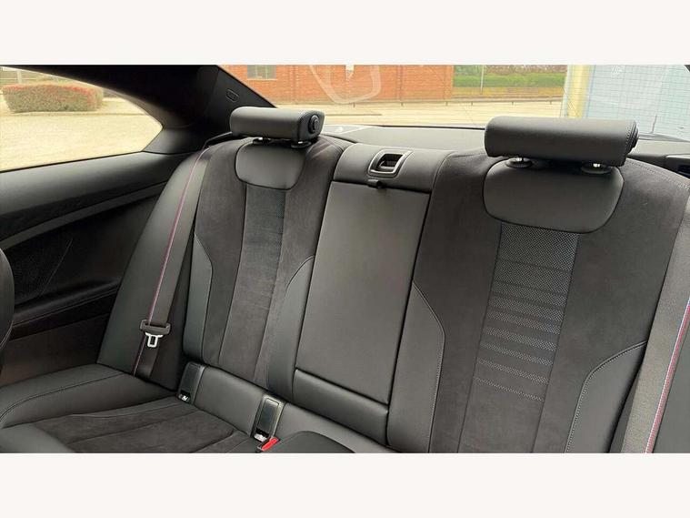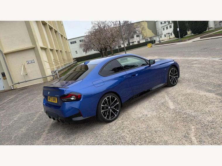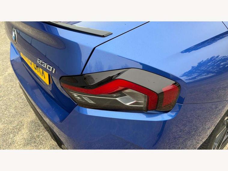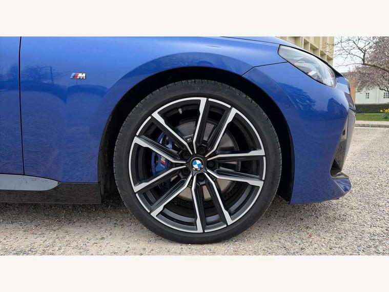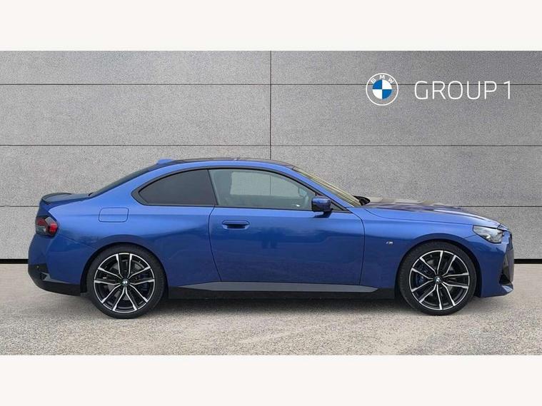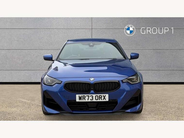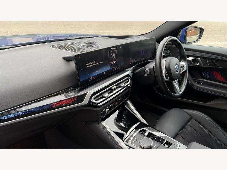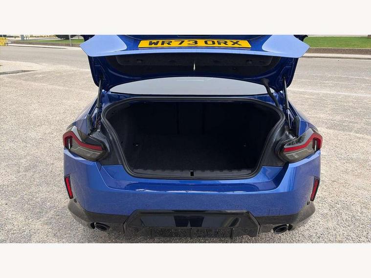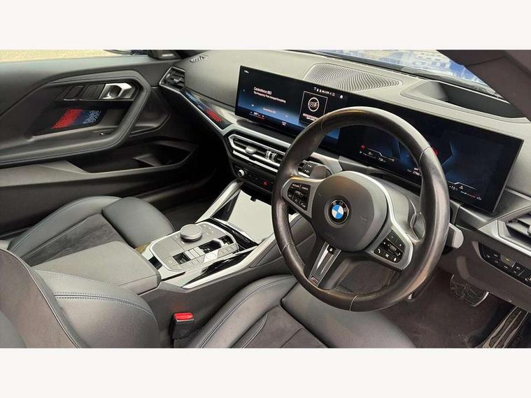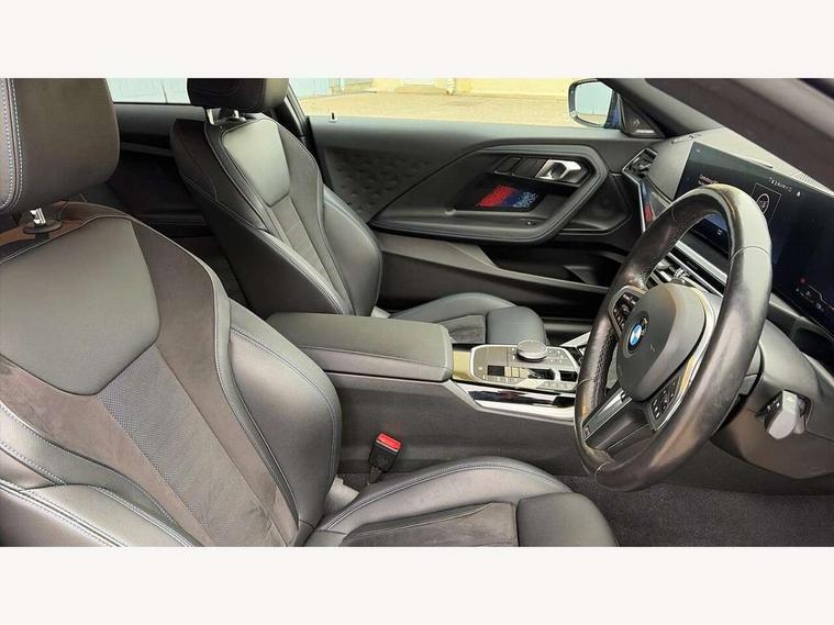 2 USB connections for charging and transferring data, 4G LTE connectivity with hard wired 4G network sim card, Attentiveness assist, Bluetooth with USB, BMW ConnectedDrive online services, BMW Intelligent Personal Assistant, BMW operating system 8 with variable, configurable widgets display information in real time, BMW Teleservices, Check Control warning system for monitoring of lights and door/luggage compartment open warning, Direct selection buttons, Drive off assistant, Eco pro mode, Electric power steering, Front and rear parking sensors, Front/rear Parking distance control, iDrive controller with turn and press function, Integrated owners handbook, Intelligent functions, Live cockpit plus with nav function 12.3" instrument cluster and 14.9" centre display, Oil sensor for level and grade, Optimum shift indicator, Personal Profile, Touch operation on control display, Variable sport steering, Widescreen multi-media display, WiFi interface for wireless connection of mobile terminal devices, Aluminium lightweight construction, Balancer shaft, BMW TwinPower Turbo four-cylinder petrol engine, Double VANOS, Drive performance control with ECO PRO comfort + sport mode, Electronic differential lock, High precision injection, M sport suspension, Petrol Particulate Filter, Sport automatic steptronic transmission with gearshift paddles, manual gearshift time display, launch control, coasting idle ECO PRO/COMFORT modes, Twin scroll turbocharger with Valvetronic, DAB tuner, Acoustic windscreen wipers for reduced driving noise, Adaptive LED Headlights, Automatic windscreen wipers and automatic headlight, Automatically dimming rear view mirror, Body colour door handles flush with door surface, Body colour door mirrors, Body colour front and rear bumpers, Daytime running lights, Electric windows - front and rear, with open/close fingertip control and trap release, Exhaust tailpipes x2 - 90mm in left and right, Fading support, Front and rear bumper system with replaceable deformation elements, Front door sill finishers in black plastic with BMW designation, Front windscreen wipers with integrated washer jets, Green tinted heat protection glazing, High beam assistant, High gloss black sill, bumper trim sides and diffuser insert, High gloss shadowline exterior trim in mirror triangle cover, mirror cover panel, mirror bezel and window border, High level third brake light, Indicators integrated int mirror housing, LED registration plate light, LED technology rear tail lights, brake lights and turn indicators, Lightweight engineering, Model designation on right side of tailgate, One piece kidney grille with hight gloss chrome surround, Rear boot, Rear fog lights, Reversing light in rear light cluster, Shark fin antenna, Single part LED rear lights with smoked glass components, Trailer stabilisation logic, Visible VIN plate, 12V power socket in front centre console with blanking plug, 2 cupholders in front centre console, 2 zone automatic air conditioning, Ambient lighting, Compartment in front of cupholder, Conditioned based service, Driver seat backrest width adjustment, Front and rear side armrests integrated into door trim, Front armrest, Front door pockets, Front head restraints, Front sport seats, Heated front seats, Illuminated glove compartment with separate small compartment, M headliner Anthracite, M sport leather steering wheel, Manually adjustment steering wheel column, Rear seat backrest with manual 40:20:40 split folding, Rear seat centre foldable armrest with integrated cup holder, Single front passenger seat, Storage compartment between rear seats, Storage tray and compartment with cover in centre console, Sun visors with vanity mirrors and insert tab, Through loading system with 40/20/40 split folding 2 rear seat in 2nd row, Two folding rear seat headrests, Velour floor mats, Additional storage compartment pack without USB - 2 Series Coupe, Connected pack professional - 2 Series Coupe, Interior and exterior mirror pack - 2 Series Coupe, M Sport exterior styling aerodynamics pack - 2 Series Coupe, 2 tone horn, Anti lock braking system (ABS) with cornering brake control, Automatic Stability Control (ASC), BMW emergency call, Brake drying, Child seat ISOFIX attachment for the two outer rear seats, Crash sensor activating of airbags, Unlocking doors, hazard warning lights, fuel cut off, interior lighting+activation of safety battery terminal clamp, Deactivation of fuel pump in the event of a crash, Driver and front passenger airbags, Driver and front passenger side airbags, integrated in the door side seat backrest bolsters for all seat variants, Dynamic brake control, Dynamic stability control + (DSC+), Dynamic Traction Control - DTC, Electrically operated hand brake including automatic hold function and automatic release when driving off, Front and rear disc brakes, Head airbags for all 4 outer seats, Manual deactivation of front passenger airbag, Seat belt security check for driver and front passenger, Seatbelt warning, Side impact protection, Three point seat belts on 4 seats including front belt stopper, pyrotechnic belt tensioners and belt force limiters, Tyre pressure sensor, Warning triangle and first aid kit, Alarm system (Thatcham 1) with remote control and electronic engine immobiliser, Central locking switch for all doors, fuel filler cap and luggage compartment, Deadlocking function system to all doors, Drive away locking system on all doors and luggage compartment, Locking wheel bolts, Start/Stop button (illuminated) in centre console with keyless engine start and Auto Start-Stop deactivation button, Two remote control key with integrated key - one button for open and close doors/fuel flap/tailgate and separate button for unlock luggage compartment, BMW mobility tyre sealing system, Electrically powered 12V compressor, Reduced rolling resistance tyres,