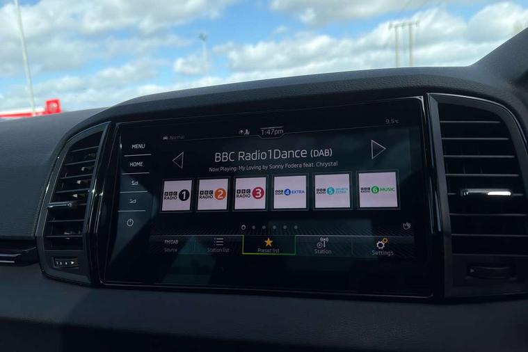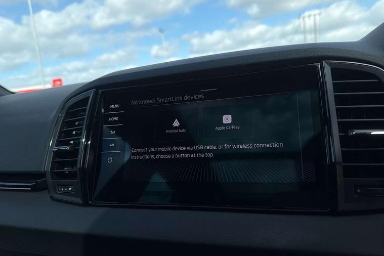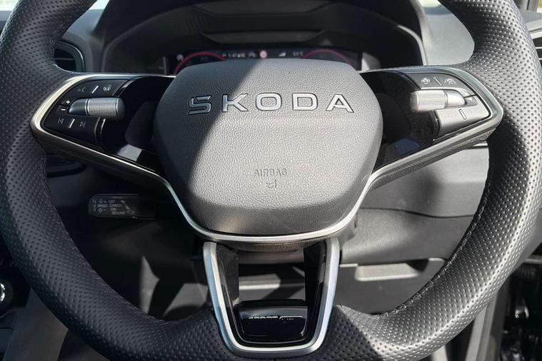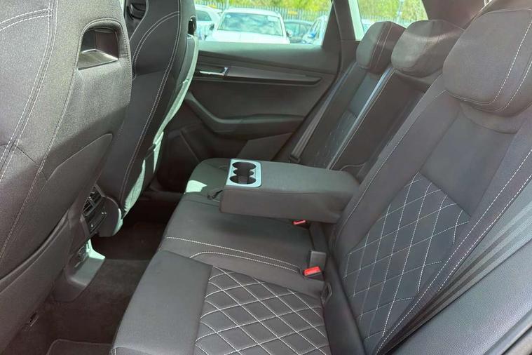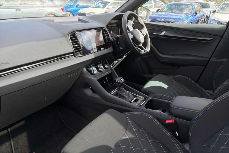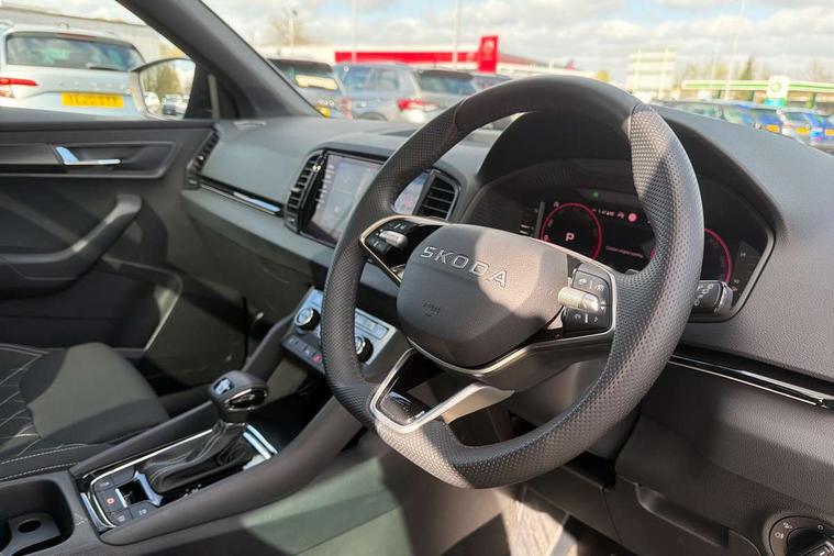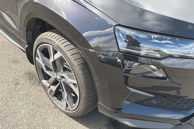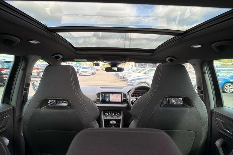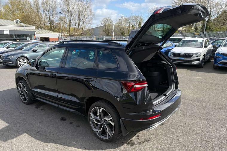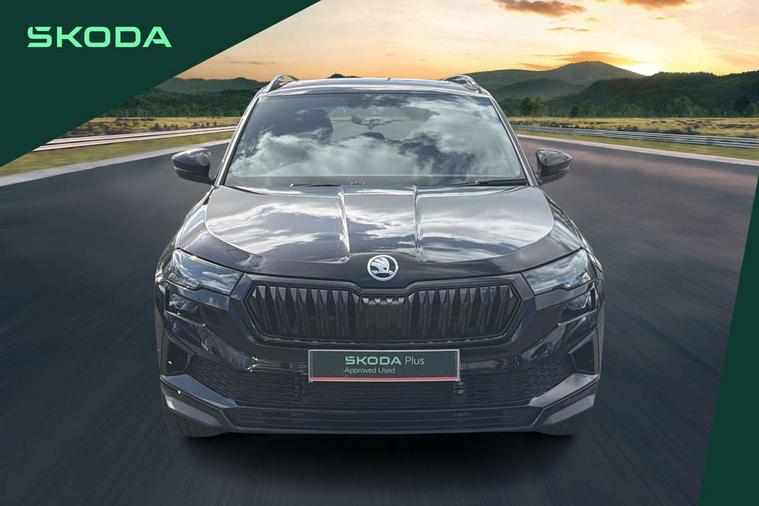 Advanced driver attention and drowsiness monitor, Emergency services call system, Outside temperature gauge, Sensor for driver assistance systems, Service interval indicator, SmartLink wireless for Apple and wired for Android, Start/stop system with regenerative braking, Traffic sign recognition, USB C Port x 2 in front centre console, Virtual Cockpit - 10.25" digital display, Virtual pedal with electrically operated boot door, Wireless smartphone charging, DAB radio with Bluetooth, USB connection, Acoustic glass, Aero front windscreen wipers with intermittent function, Auto dimming rear view mirror with light and rain sensors, Black door mirrors, Black electric window control buttons, Black radiator grille, Black roof rails, Body colour door handles, Electric front and rear windows with child proof lock, Extended rear roof spoiler, Front door steps with SportLine logo, Heated rear windscreen, LED daytime running lights, LED rear lights with high functionality welcome effect and dynamic indicators, Light assistant (coming/leaving home/tunnel light), Panoramic sliding sunroof, Plastic scuff plates in door apertures, Privacy glass, Protective door side sills in body colour, Rear diffuser, Rear side wing doors, Rear window wiper with washer system and intermittent control, Safety reflectors on front doors, Skoda lettering on tailgate in black, Sportline badge on front fender, Sports front and rear bumpers, Third brake light, Unique dark chrome design logo on alloy wheels, 1.5 litre bottle holders in driver and front passenger door panels, 12V socket in boot, 12v socket in front centre armrest with storage compartment and rear air vents, 2 x Tablet holder, 3 rear height adjustable headrests, 3 seat bench in 2nd row, 3 spoke sports leather heated multifunction steering wheel with DSG paddles, 4 foldable roof handles with rear coat hooks, Black floor carpet, Cargo elements in boot, Chrome inner door handles, Foldable hooks in the boot, Front head restraints, Height adjustable front three point seats belts with tensioners, Height/reach adjust steering wheel, Ice scraper, Illuminated glovebox, Illuminated luggage compartment, Isofix child seat preparation for front passenger seat, Isofix child seat preparation outer rear, Manual lumbar support for front seats, Pen holder, Pollen filter, Rear backrest release from boot, Rear boot cover, Rear package tray, Rear reading lights, Rear seats fixed folding and divided 60:40, Rubbish bin door, Safety vest holder, Single front passenger seat, Skoda lettering on steering wheel, Sportline decorative inserts, Storage box in upper central dashboard closed, Sunvisors with illuminated vanity mirrors, Textile floor mats, Ticket holder, Titan black interior ceiling, Umbrella under passenger seat, Under passenger seat storage compartment, Columbus pack - Karoq, LED Interior lighting pack with Skoda welcome logo - Karoq, Light Pack - Karoq, Non Smokers pack, Performance pack - Karoq, Winter plus pack with heated front and rear seats - Karoq, Automatic door unlocking in case of crash, Automatic fuel cut off in case of crash, Driver airbag, Electronic parking brake with auto hold function, Emergency rear braking signal, ESC (incl. ABS+MSR+ASR+EDS+HBA+DSR+RBS+MKB), Front side airbags, Head airbags, Hill hold control, Knee airbags, Passenger airbag with switch-off function, Pedestrian monitor, Power operated child safety locks, Seatbelt reminder signalisation and pretensioner for all seats, Three point seatbelts rear, Two tone horn, Tyre pressure monitor, Alarm with interior monitoring, back up horn and tilt sensor with safe function, Electronic engine immobiliser, Keyless entry and start/stop, Remote central locking with 2 remote folding keys, Black air vent surround, Black centre console, carbon door decor, Satin black dashboard, Satin black door trim, 19" Sagittarius anthracite alloy wheels, Anti-theft wheel bolts protection, Breakdown and tool kit,