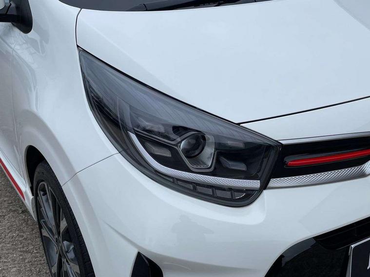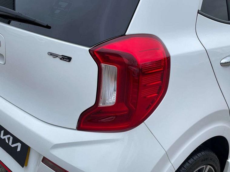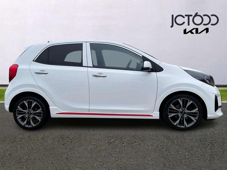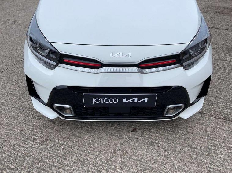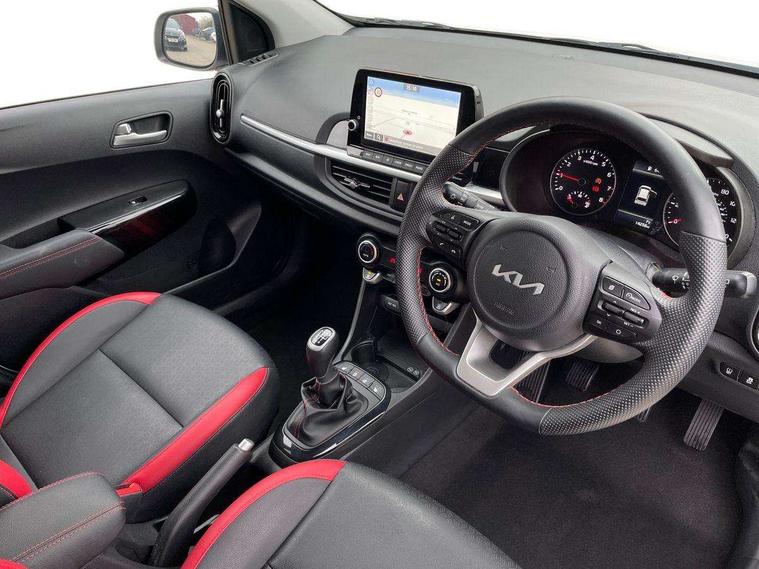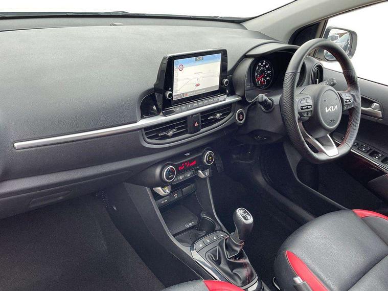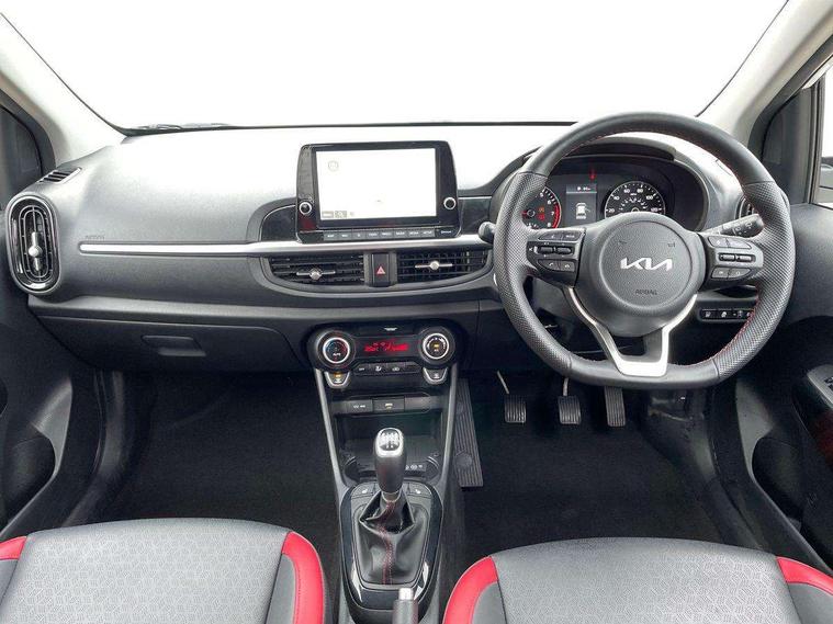 8" touch screen satellite naviagtion with RDS and DAB with telematics, Apple car play/Android Auto with voice control, Cruise control + speed limiter, Emergency call service, Emergency stop signalling system, External temperature gauge, Kia Connect (UVO), Motor driven power steering, Rear parking sensors, Reversing camera system with dynamic guidelines (Integrated into centre fascia screen), Tachometer, Trip computer, Wireless Smartphone charger, 6 speaker audio system, Bluetooth with music streaming, Steering wheel mounted controls, USB ports for connection of a media device, Automatic headlight control system, Bi-function projection headlights, Black beltline mouldings, Black grille with silver surround, Body colour B pillars, Body colour bumpers, Body colour side sill mouldings, Body coloured mirrors and chrome exterior handles, Day/night rear view mirror, Electric adjustable/heated/folding door mirrors with LED indicators lights, Front and rear electric windows with drivers's auto up/down function, Front fog lights, Headlamp levelling, Heated rear window, High mount brake light, LED daytime running lights, LED rear fog lights, Privacy glass - Rear windows and tailgate, Rain sensor, Rear side wing doors, Rear wash/wipe, Speed variable front wipers, Sports front and rear bumpers with gloss black skid plates twin exhaust, Tinted glass, Visible VIN plate, Welcome and follow-me home light functionality, 1 x rear coat hook, 12V power point front, 2 seat bench in 2nd row, 3 x passenger assist grips, 60/40 split/folding 2nd row of seats, All round height adjustable headrests, Automatic air conditioning, Black and red accents front door armrest, Centre Console with Storage Box and Sliding Armrest, Cupholders in centre console, D-cut steering wheel with red stitching, Driver and front passenger sunvisors with driver's side illuminated vanity mirrors, Driver seat height adjust, Faux leather upholstery, Front cabin lights, Glovebox, Heated front seats, Heated steering wheel, High gloss lower centre fascia trim, door armrest and air vents, ISOFIX Child seat top tethers and anchor fixings, Leather trimmed steering wheel and gearshift, Luggage area light, Luggage area parcel shelf, Passenger front seatback pockets, Satin chrome interior door handles, Single front passenger seat, Slide/reclining front seats, Tilt adjustable steering wheel, Advanced Driver Assistance Pack - Picanto, 2 x 3-point rear seatbelts, ABS/EBD, Automatic unlocking of doors in case of impact, Dual front airbags, ESC + BAS + VSM + HAC, Front passenger airbag cut-off switch, Front seatbelt height adjusters, Front seatbelt pretensioners + load limiters, Hill hold control, Knee airbags, Rear child proof door locks, Seatbelt warning, Side impact protection, Torque vectoring brake based and straight line stability (SLS), Traction control, Twin curtain airbags, Twin front side airbags, Tyre pressure monitoring system, Anti theft alarm, Engine immobiliser, Locking wheel nuts, Smart key with engine start/stop button, 16" alloy GT-Line wheels, Tyre mobility kit,