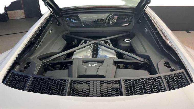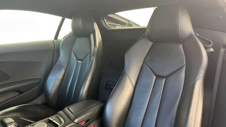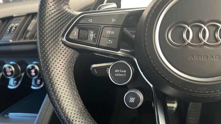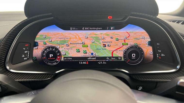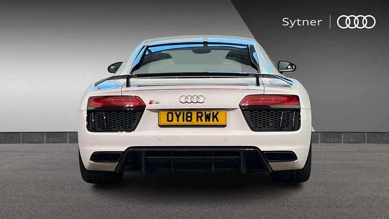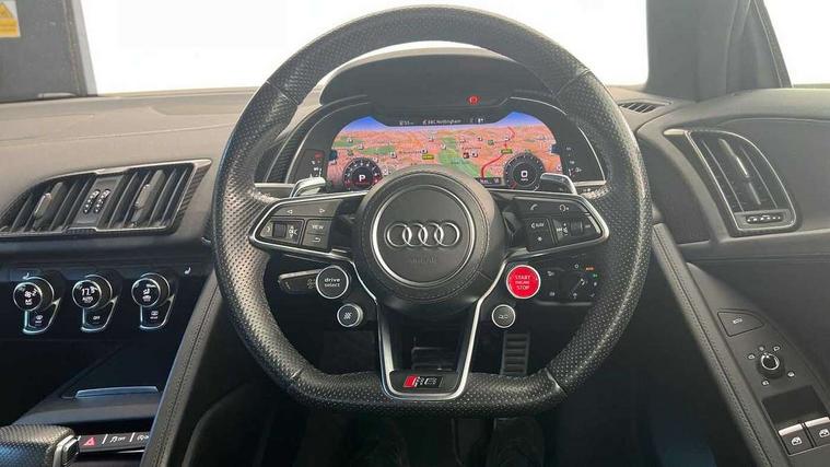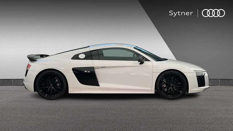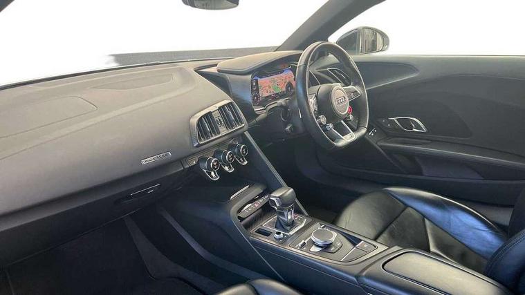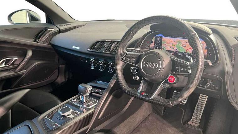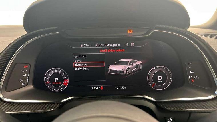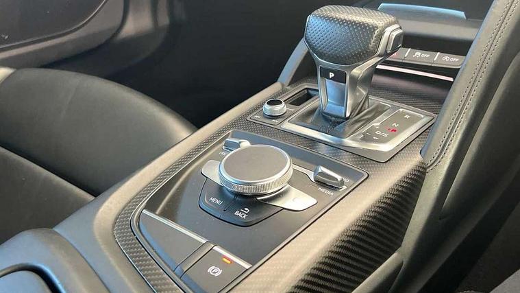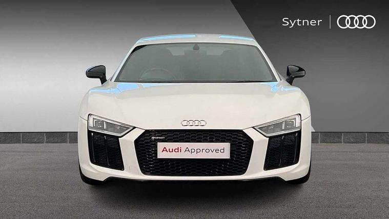 Audi connect, Audi drive select with performance mode, Audi parking system plus with front and rear sensors, Audi virtual cockpit - 12.3" high-resolution LCD display with fully customisable instrument cluster, Bluetooth connectivity with voice control, Cruise control + speed limiter, Driver's information system, MMI navigation plus with DVD, SD card reader, 10GB music storage, MMI touch panel, Service interval indicator, V10 Plus sports suspension, 2 USB ports, Audi music interface, Auxiliary input socket, DAB Digital radio, Air inlet in Anthracite gloss black, Aluminium fuel cap, Audi Beam uses LEDs to project the Audi Sport logo, Auto dimming rear view mirror with light and rain sensors, Body colour bumpers, Electric front windows, Electrically adjustable and heated door mirrors, Folding door mirrors, Gloss anthracite black air outlets, Gloss Carbon rear spoiler, Green tinted glass, Heat insulating glass, Heated rear window, Laminated windscreen, LED daytime running lights, 3 spoke flat bottomed multifunction performance leather steering wheel with 4 operating satellites, Adjustable steering column, Aluminium gear selector, Aluminium gear shift paddles, Ambient lighting, Deluxe climate control, Driver and passenger footwell lighting, Electric front seat height adjustment, Engine Compartment Light, Illuminated door pockets, Illuminated glovebox, Integrated front head restraints, Interior light with delay, Luggage compartment lighting, Reading lights, Stainless steel pedals and foot rest, ABS/EBD, ASR, Ceramic brakes, Curtain Airbag, Driver/front passenger airbag, EDL traction control, ESP, Front passenger airbag deactivation, Front side airbags, Gloss anthracite brake calipers, Hill hold control, Tyre pressure monitoring system, Warning triangle and first aid kit, Advanced key, Anti theft system, Electronic immobiliser, Locking wheel bolts, Preparation for tracking system, Remote central locking, Valet parking key, Extended inlays in matt Carbon surrounded for Audi virtual cockpit and air vents, Matt carbon inlay, Tyre repair kit,