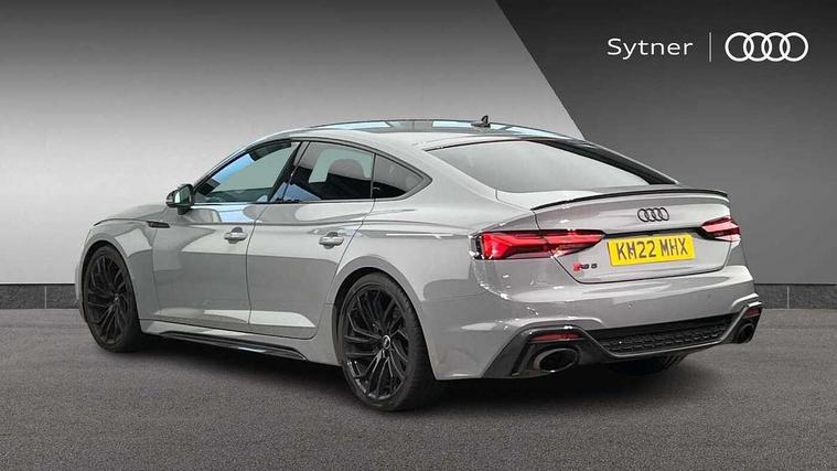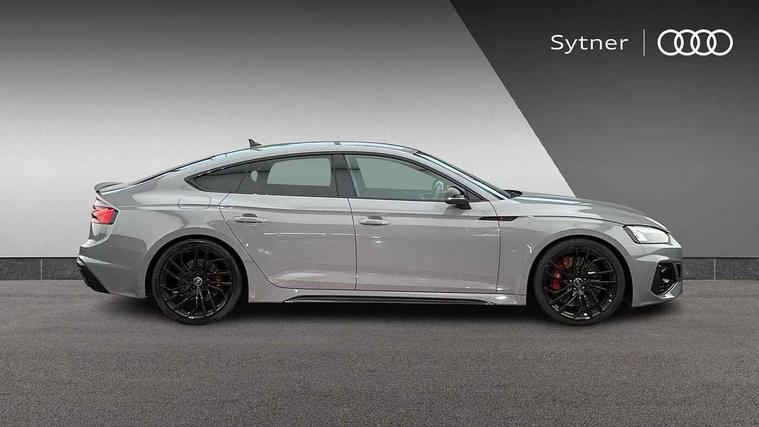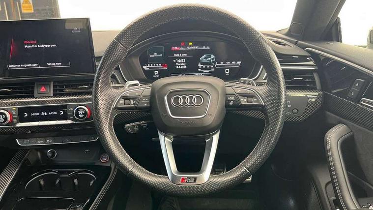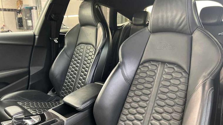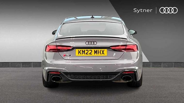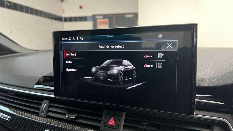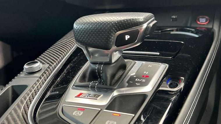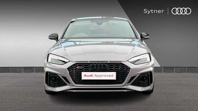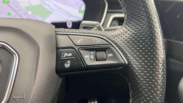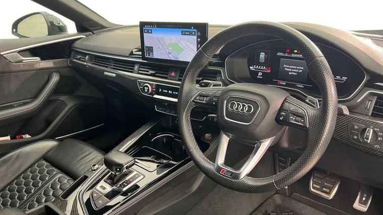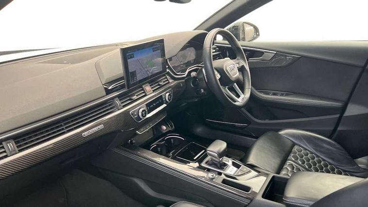 Audi connect safety and service (e-call), Audi connect with Amazon Alexa Integration, Audi parking system plus with front and rear sensors, Audi side assist, Audi smartphone interface, Audi Virtual Cockpit with RS specific design and 12.3" display, Automatic start-stop system with coasting functionality and efficiency programme, Bluetooth interface, Electromechanical power steering, Email, calendar and text messages displayed via MMI, MMI Navigation plus with MMI touch includes 10.1" high resolution colour MMI display, 3D map, Rear view camera, RS Audi drive select, RS drive modes on steering wheel, Service interval indicator, Voice control system, Quattro sports differential, Audi sound system, DAB digital radio reception, Audi Beam uses LEDs to project the RS logo, Audi matrix LED headlights with LED rear lights + dynamic front and rear indicators, Audi rings and lettering glossy black, Auto dimming rear view mirror, Body colour door handles, Electric front windows, Electric rear windows, Electrically folding, adjustable and heated door mirrors with integrated LED side indicators and kerb view function for passenger side, Exterior mirror housing in high gloss black, High beam assistant, Larger singleframe grill, LED 3rd brake light, LED daytime running lights, Privacy glass with rear acoustic glazing, Rain and light sensors, Rear side wing doors, RS bumper with quattro lettering, RS5 badges on grille, the front wing panels and rear, RS5 dual branch chrome tailpipes with left and right oval pipes, Windscreen with acoustic glazing, 2 x USB charging port with aux input socket, 3 spoke leather heated multi-function plus steering wheel with RS badging, 40/20/40 split folding 3 seater rear bench seat, Aluminium shift paddles, Black cloth headlining, Deluxe 3 zone electronic climate control, Electrically adjustable front seats, Fine Nappa leather upholstery, Front centre armrest, Front head restraints, Front/rear floor mats, Heated front seats, Illuminated door sill trims with RS5 logo, ISOFIX child seat mounting and top tether, Leather door armrests and knee pad, Pneumatic massage function, Rear head restraints, RS Specific perforated leather gear lever knob with contrast stitching, RS Super Sports seats with contrast honeycomb stitching, Single front passenger seat, Stainless steel pedals, Tool kit, Carbon black styling pack - RS5, LED Interior light pack - RS5, 3x3 point rear seatbelts, 6 airbags - Driver, front passenger, curtain and side airbags, Child locks on rear doors, Electromechanical parking brake, Electronic Stabilisation Control (ESC) including ABS, ASR and EDL, Front passenger airbag deactivation, Height adjustable front seatbelts, Hill hold assist, Multi collision brake assist, Pop-up bonnet for pedestrian protection, Pre sense city, RS Model enhanced braking system, Seatbelt monitoring, Tyre pressure warning, Warning triangle and first aid kit, Anti theft alarm system, Anti theft wheel bolts, Immobiliser, Keyless Go, Remote control key with RS emblem, Carbon twill inlays, 20" 5 Segment spoke Evo style design audi sport alloy wheels in glossy black, Tyre repair kit,