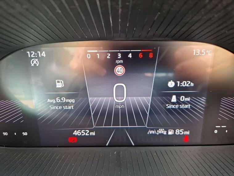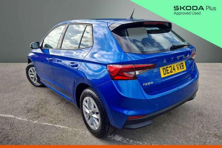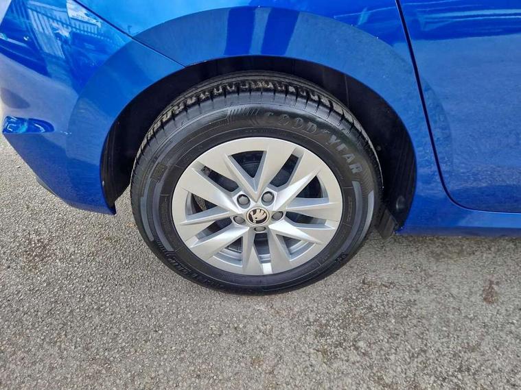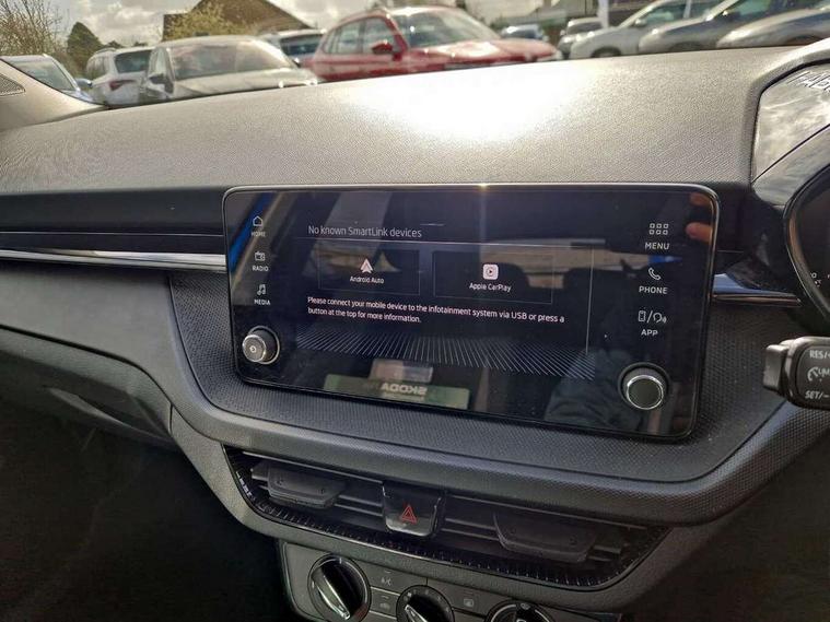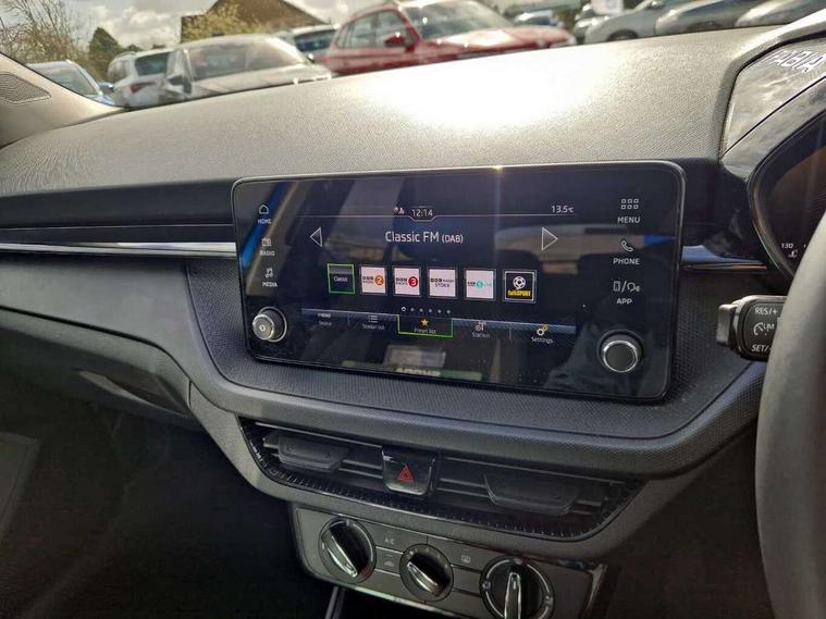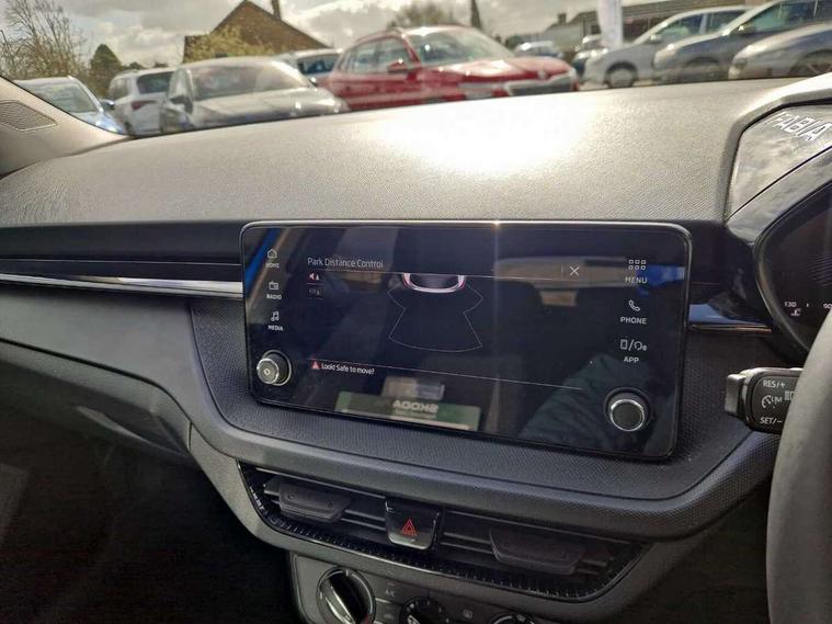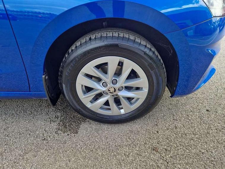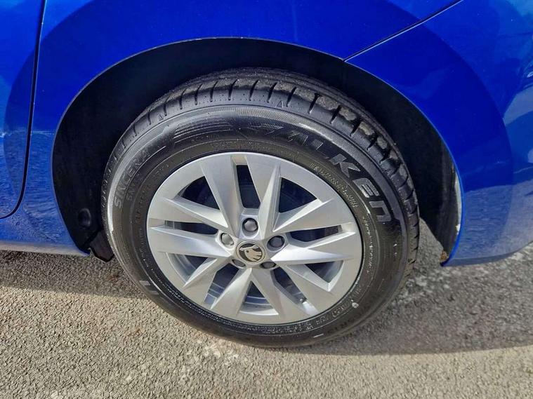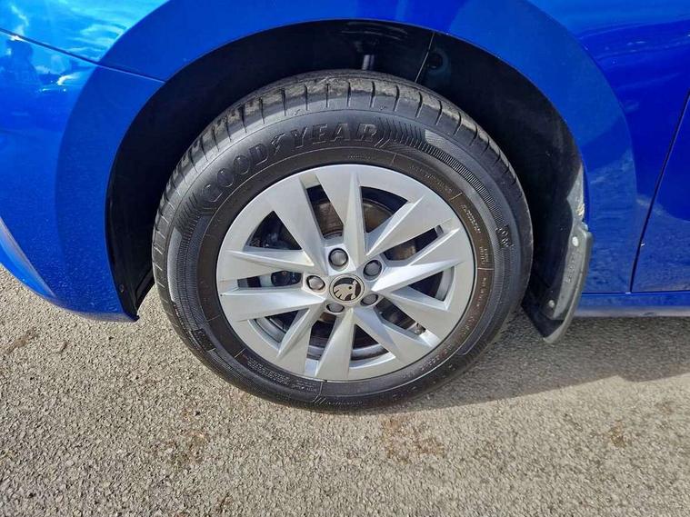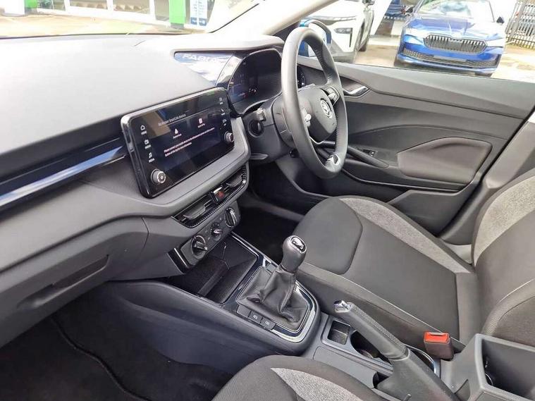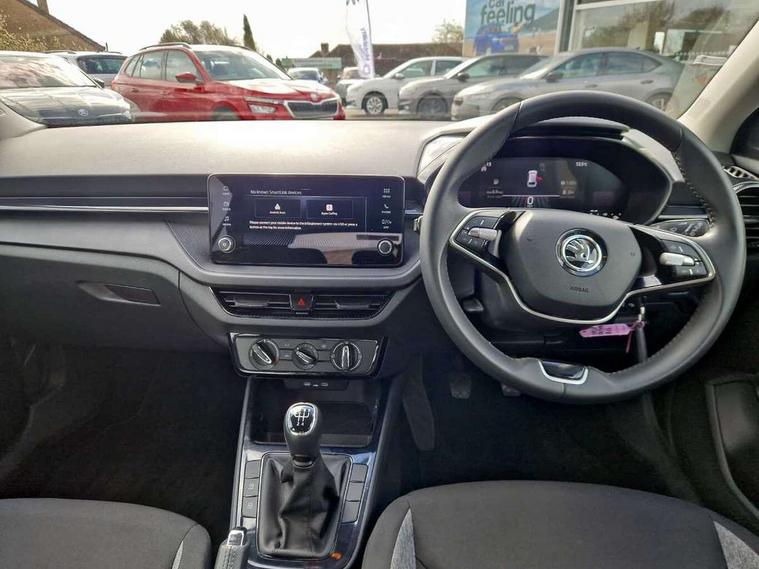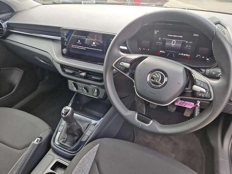 8" Digital instrument display, Advanced driver attention and drowsiness monitor, Bluetooth connection, Electromechanical power steering, Exterior temperature gauge, Lane assist including road edge detection, Rear parking sensors, Service interval indicator, Speed limiter, Traffic sign recognition, Wireless SmartLink for Apple CarPlay and Android Auto, 2x USB-C in the front (for data transmission and charging), 6 speakers (4 speakers/2 tweeters), 8.25" Skoda infotainment touchscreen display, Auxiliary socket for external MP3 player, DAB digital radio reception, Basic LED Headlights, Basic rear lights, Body colour door mirrors, Body coloured bumpers, Dimming rear view mirror with black frame, Door mirror integrated indicators, Electrically adjustable and heated door mirrors, Electrically adjustable front windows with function auto up/down, Front fog lights, Front window wiper intermittent control, Headlight range control - Automatic, Ice scraper in fuel cap, LED daytime running lights with coming and leaving home feature, Mechanical adjustable rear windows, Rain sensor, Rear LED fog light, Rear side wing doors, Rear window wiper with washing nozzles, Roof mounted spoiler, SKODA tailgate lettering in chrome, Third brake light, 2 reading lights in front and 2 reading lights in rear, 2 spoke leather multifunction steering wheel, 3 rear headrests, Backrest split and folding, Central console with removable cup holder and storage box, Chrome handbrake release button, Fabric upholstery, Front centre armrest, Gearshift knob/handle in leather, Grain satin black interior door handles, Hand brake lever handle in leather, Height adjustable driver seat, Height adjustable front headrests, Height adjustable steering wheel, ISOFIX and TopTether anchorage points to the outer rear seats, ISOFIX and TopTether on the front passenger seat, Luggage compartment lighting, Manual air conditioning, Pollen filter, Rear seat bench unsplit, Single front passenger seat, Storm grey headlining, Sun visors with mirror and airbag label on passenger side, Textile floor mats, Ticket holder, 3-point height adjustable front seats belts with pretensioner and force limiter, Automatic warning lights in case of crash, Driver and passengers airbag with switch off function, e-Call+, ESC including ABS, MSR, ASR, EDS, HBA and XDS, Front and rear seat belt warning, FRONT ASSIST (AEB City and AEB Inter Urban), Front side airbags, Head airbags, One tone horn, Pedestrian protection, Three rear 3-points safety seat belts with pretensioner and force limiter including stop function for outer rear seat belts, Tyre pressure monitoring system, Anti-theft alarm system including immobiliser, interior monitoring, backup horn, and towing protection, Central locking with radio remote control, interior controls, SAFE function and 2 foldable keys, Black painted air vents, Glossy black decorative trim, Grain satin black central console cover, Grain satin black lower decorative trim, Satin black door and side trim panel in front, Anti-theft wheel bolts protection, Super-low rolling resistance tyres,