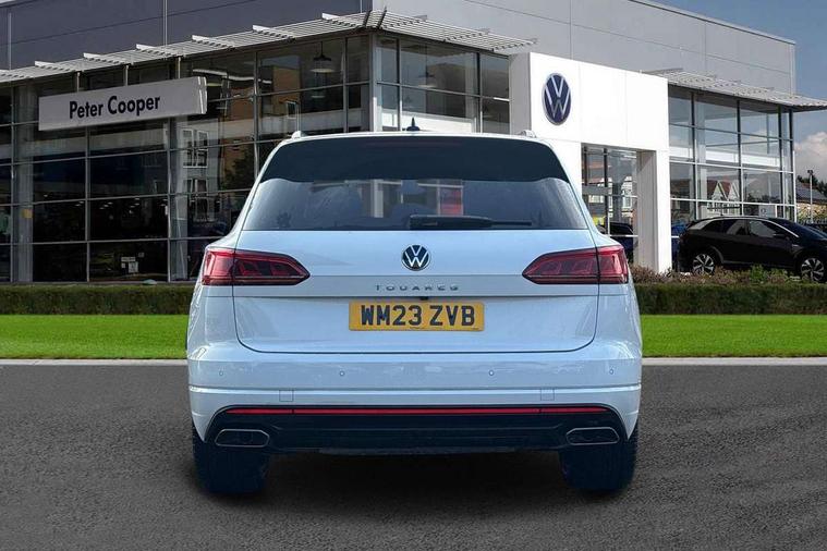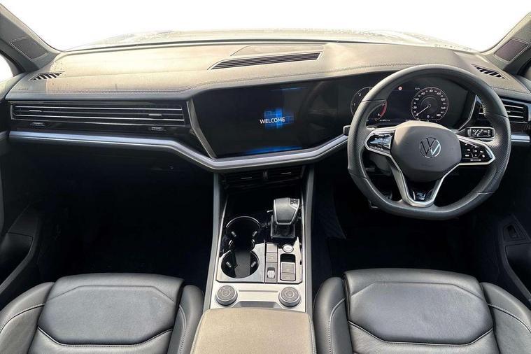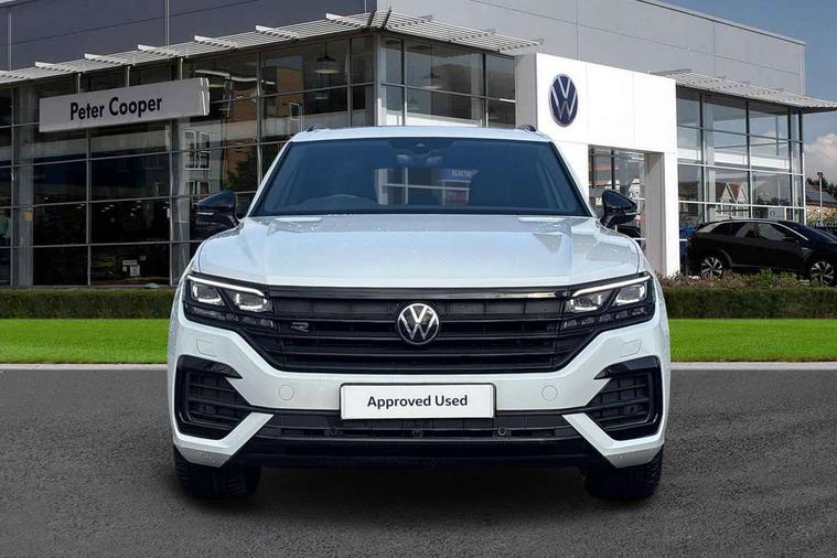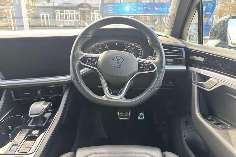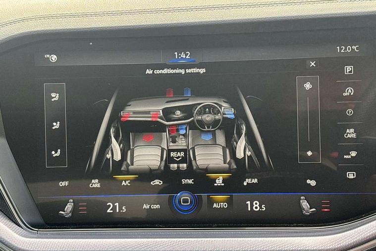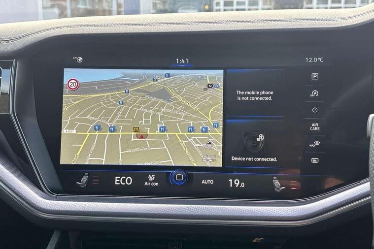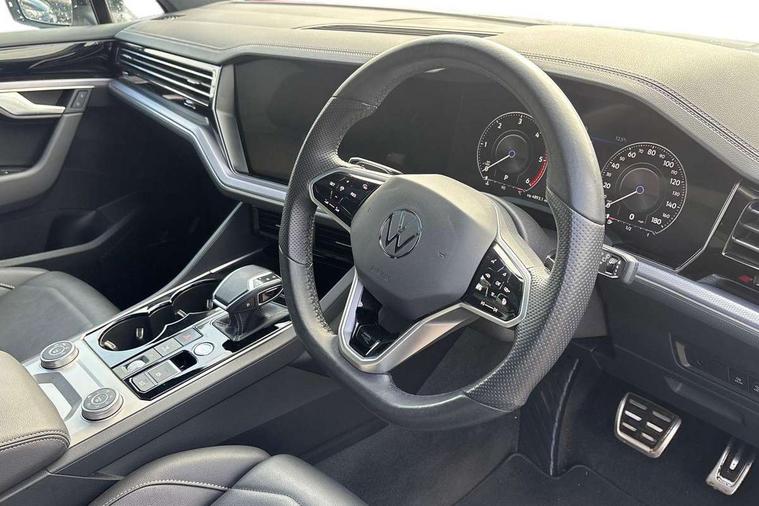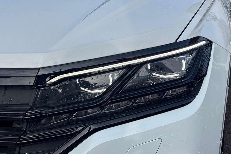 2D/3D map view, ACC - Adaptive cruise control with front assist, forward collision warning, distance monitoring, city emergency brake and speed limiter, Apple car play/Android Auto, Audible and visual fatigue detection system, Bluetooth hands free telephone connection, Car information display, Drive select with Damper control, Driver alert system, Driver profile selection, Dynamic road sign display camera controlled system with visual warning for traffic and road signs, eCall emergency system, Fully electric tailgate + keyless entry and start, Instrument cluster, MirrorLink, Multifunction camera, Multifunction computer premium with 7" colour display, One touch indicators with repeat function, Service interval indicator, Speed sensitive power steering, Start/stop system with regenerative braking, Tailgate power latch, Think blue trainer driver tips and journey analysis, Traffic sign recognition, Voice control system, Wireless Smartphone charger, 24 litre AdBlue tank, Torsen limited slip differential, DAB Digital radio, Dynamic navigation based on TMC+, Gesture control for infotainment system, Multi device interface (MDI) with illuminated USB-C connection, Music playback - MP3, WMA and AAC files, SD card slot, Simultaneous pairing of 2 compatible mobile devices, SMS functionality - read, compose and send SMS messages using touch-screen display, Title and cover art display, Volkswagen media control, Adaptive low beam for urban and motorway use, Auto dimming rear view mirror, Automatic coming/leaving home lighting function, Automatic headlights, Black anodised roof rails, Black door mirrors, Black rear diffuser, Black side window surrounds, Black upper and lower grille louvres extending into headlights and radiator grille, Body colour door handles, Body coloured wheel arches, C signature gloss black front air intake, Chromed tailpipe on the left and right integrated in the bumper with trapezoid design, Dusk sensor, Dynamic headlight range control, Electric front tilt/slide panoramic sunroof and fixed rear sunroof, Electrically power adjustable, heated, folding, auto dimming, front passenger exterior door mirror lowering function, Front and rear electric windows, Galvanised body, Gloss black finish B pillar, Gloss black rear diffuser, Headlight washers, Heat insulating darkened glass in side and rear windows, Heated windscreen washer jets, IQ.Light-LED matrix headlight, daytime running light with dynamic cornering light and indicator, LED 3rd brake light, LED rear fog light, LED rear number plate lights, Plastic scuff plates in door apertures, Poor weather light, Puddle lights, Rain sensor, Rear side wing doors, Rear wiper, 12V socket in front and rear centre console and boot, 2 Coat hooks on B pillar, 3 rear head restraints, 3 seat bench in 2nd row, 3 spoke sport heated leather multi-function sports steering wheel with gear shift paddles - generation 2, 4 way adjustable front head restraints, 4 way electric lumbar support for driver and front passenger, 4 zone climate control, 40:20:40 split folding slide/recline rear seat, B pillar vents, Black lower edge of door extending sills, Branded points of interest, Double sun visor for drivier and passenger with LED illuminated vanity mirrors, Electric luggage compartment cover, Folding rear centre armrest with 2 cupholders, Front + rear carpet mats, Front centre armrest with storage box, Gear shift indicator, Height/reach adjust steering wheel, Illuminated air conditioned glovebox, Isofix preparation for 2 rear child seats, Jack and tool kit, Leather trimmed gear knob with gloss black inlay/aluminum trim, Leatherette door trim, LED luggage compartment lighting, Load through provision, Luggage compartment with load lashing rings, Plastic loading edge protection, Rear seat remote release levers, Single front passenger seat, Soul black headlining, Stainless steel pedals, Innovision cockpit pack - Touareg, 3 point front seatbelts with pre-tensioners, ABS, Active bonnet, Automatic post collision braking system, Curtain airbags, Driver/Front Passenger airbags, EBD + Brake Assist, EDL, Electronic parking brake with auto hold, ESC with ASR, Front seat side impact airbags, Hill descent control, Hill start assist, Passenger airbag deactivate switch, Seatbelt warning lamp and buzzer, Three 3 point rear seatbelts, Two tone horn, Volkswagen roadside assistance, Warning triangle and first aid kit, Alarm with interior monitoring in cab, backup horn and towing protection, Child security locks for front and rear doors, Electronic engine immobiliser, Remote central locking, Black decorative trims on the side windows, High gloss black centre console,