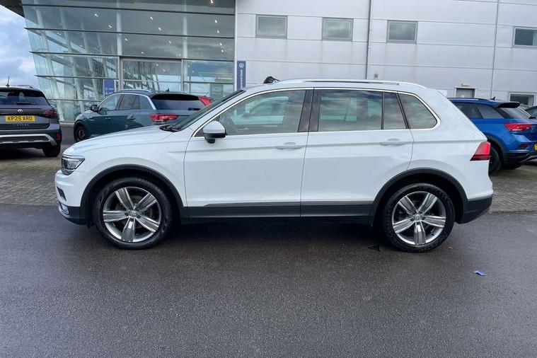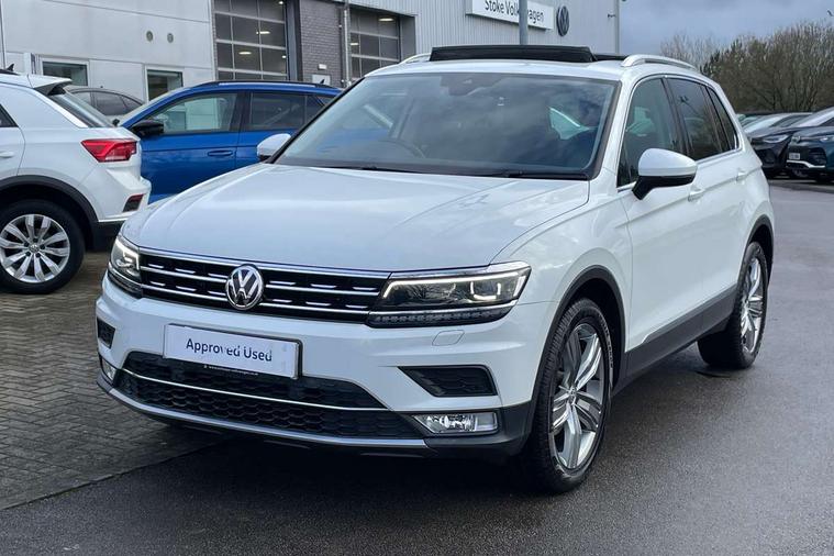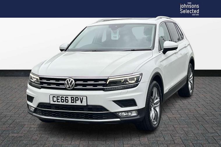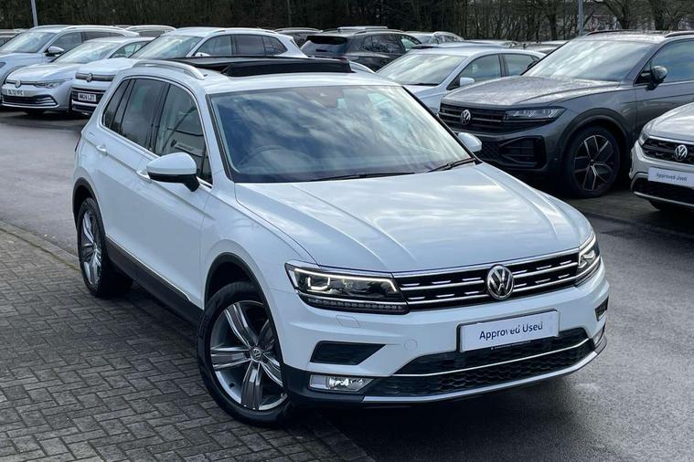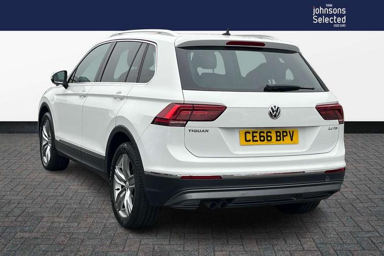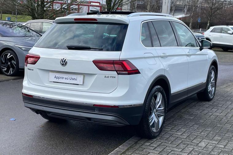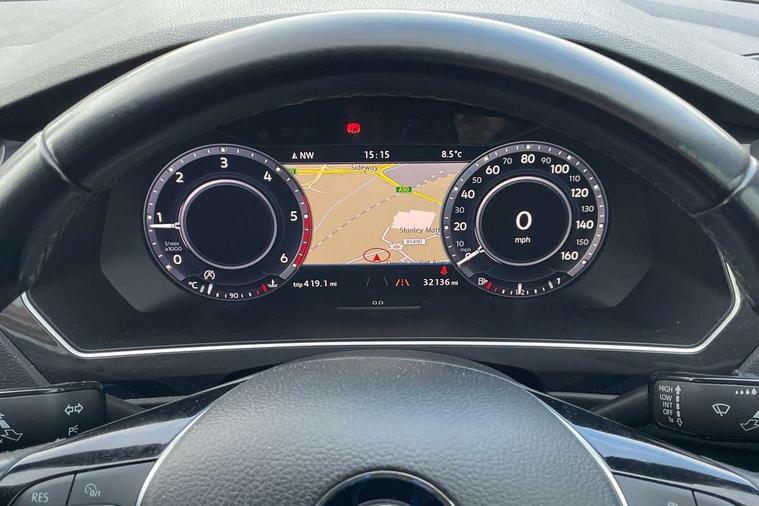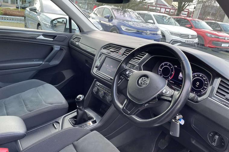 Active information display, Adaptive cruise control, App-Connect, Bluetooth phone integration system, Instrument cluster, Lane assist, Low washer fluid warning light, Outside temperature display, Service interval indicator, Warning lights, Diesel particulate filter, Aux-in socket, DAB Digital radio, SD card slot, USB connection, Auto dimming interior mirror, Body colour door handles, Body colour door mirrors, Body coloured bumpers, Chrome side body trim, Chrome side window surrounds, Chrome trimmed radiator grille, Coming/leaving home lighting function, Dusk sensor + auto driving lights, Electric folding door mirrors, Electric heated + adjustable door mirrors, Electric panoramic sunroof with sunblind, Front and rear electric windows, LED headlights with dynamic light assist daytime running lights and cornering front fog lights, Rain sensor windscreen wipers, Silver rear diffuser trim, Silver roof rails, Silver under body guard, Tinted windows (B pillar backwards), Twin trapezoid chrome exhaust pipes, 14 way electric adjustable front seats with drivers memory and massage function, 3 rear headrests, 3 zone climate control, 4 load lashing points, 40:20:40 split folding rear seats, Bag hook in luggage compartment, Front + rear carpet mats, Front centre armrest with 12v socket, Front centre armrest with storage + rear 2 air vents + cupholders, Front seatback folding tables, Height/reach adjust steering wheel, Illuminated driver/passenger vanity mirrors, Illuminated scuff plates, Interior light with delay, Isofix Preparation 2 Rear child seats, Leather gear knob, Lockable cooled glovebox, Luggage compartment lighting, Map pockets on front seats, Rear cupholders, Removable luggage cover, Sliding/reclining rear seats, Storage compartment in driver's door, Storage compartment in passenger's door, Storage drawers under front seats, Storage tray on dashboard, Sunglasses storage, Variable boot floor, Ambient lighting pack - Tiguan, 3 rear 3 point seatbelts, ABS+EBD+Brake assist, Active bonnet, Active pedestrian safety system, Curtain airbags, Driver/Front Passenger airbags, Driver/Passenger whiplash optimised head restraints, Drivers knee airbag, Electronic parking brake with auto hold, ESP with EDL + ASR, First aid kit, Front assist including city emergency braking, Front side airbags, Head airbag system, Height adjustable front 3 point seatbelts + pretensioners, Hill hold control, Passenger airbag deactivate switch, Passenger knee airbag, Pre crash system, Rear side airbags, Seatbelt warning lamp and buzzer, Warning triangle, Alarm with interior protection, Electronic engine immobiliser, Chrome door trim inserts, Piano black interior trim, Steel space saver spare wheel,