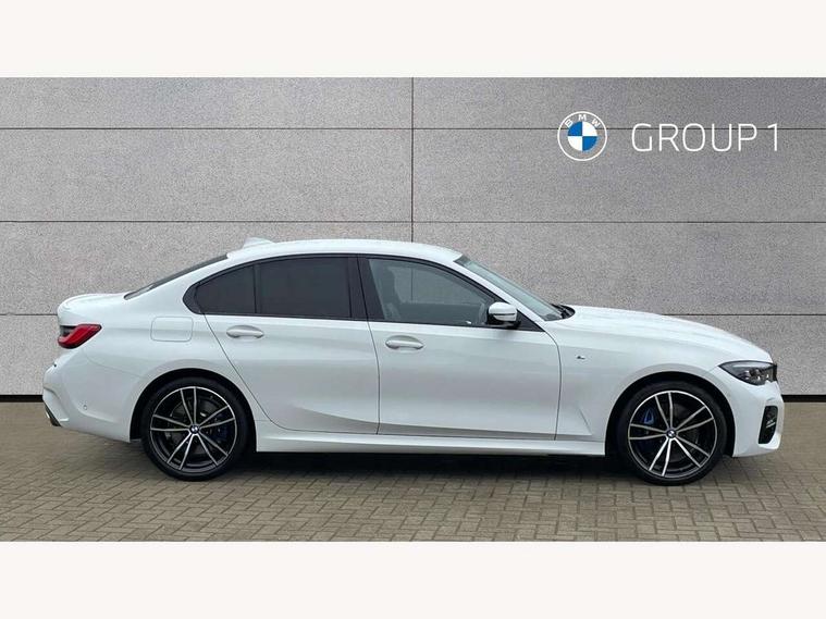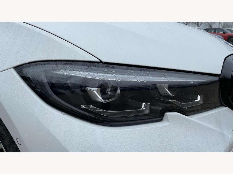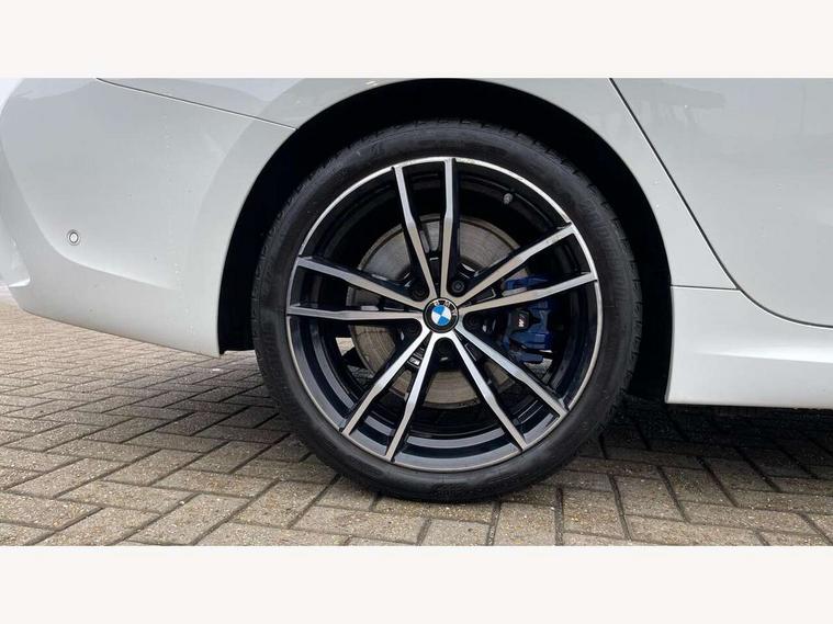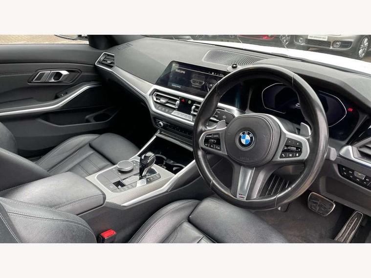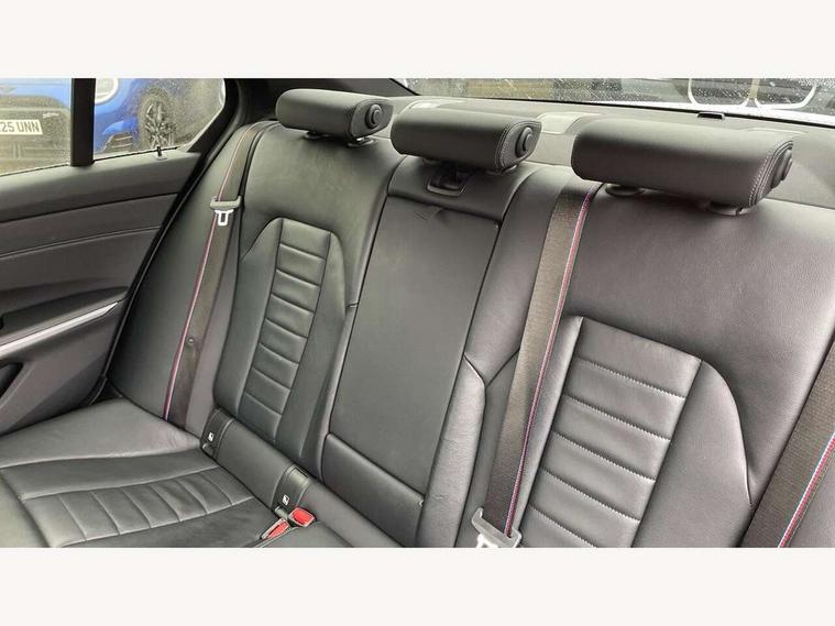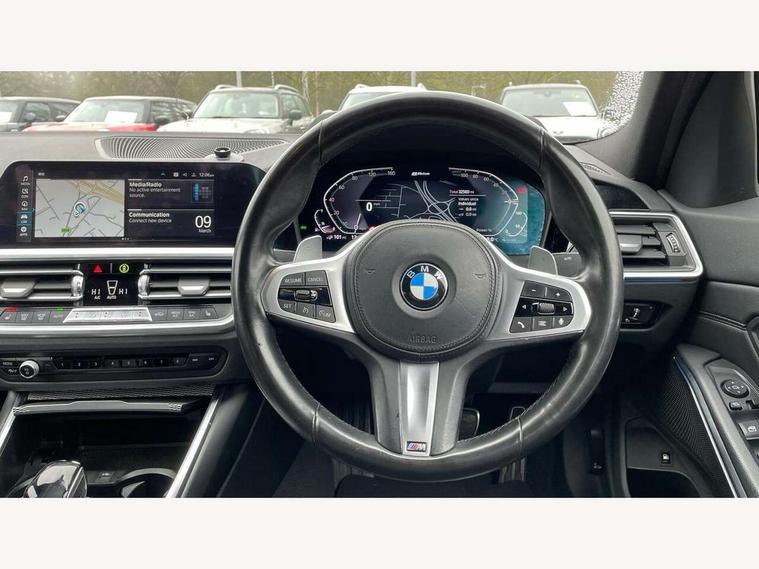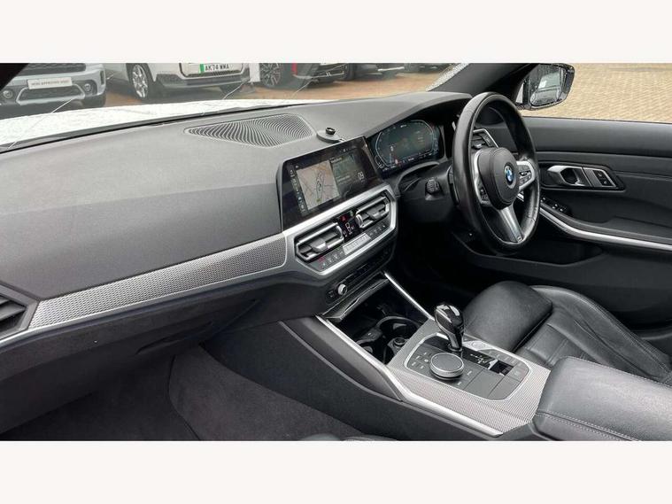 Active guard plus, Attentiveness assist, Auto start-stop, Bluetooth hands free facility with USB audio interface with audio streaming, BMW Live Cockpit Professional Nav with 12.3" instrument display + 10.25" display, Intelligent Voice Assist, BMW OS 7, HDD, 2USB, 4G LTE connect, BMW service history, BMW Teleservices, Brake pad wear indicator in front and rear, Check Control warning system for monitoring of lights and door/luggage compartment open warning, Condition based service, Cruise control with brake function + speed limiter, Electric power steering with Servotronic steering optimised at all speed ranges, iDrive controller on centre console, Instrument cluster with speedometer with mph readout, tachometer, fuel gauge and oil temperature gauge, Integrated owners handbook, Oil sensor for level and grade, warning by check control system, On board computer - average speed+fuel consumption, service interval, clock/date, odometer/trip meter, outside temperature display and ice warning, Optimum shift indicator, Personal Profile - automatic lock when driving away selectable, Balanced 50/50 weight distribution, Battery cut-out switch, Charging cable - Mode 2, Drive performance control - ECO PRO, comfort and sport modes, Petrol Particulate Filter, Stroke dependent dampers, DAB tuner, Electronic service booklet, Stereo speaker system with 2 mid range speakers in the front door trims and rear parcel shelf + 2 central bass speakers underneath the front seats, Acoustic glazing, Active airstream chrome frame kidney grille with 8 high gloss black vertical slats, Automatic headlight beam throw control with load dependent regulating reaction, dynamic compensation of braking dive and acceleration squat, Black roof mouldings, Body colour door handles, Body colour front and rear bumpers, Body colour fuel filler flap, Body colour mirror caps with bottom segment in matt black, Dynamic brake lights, Electric windows - front and rear, with open/close fingertip control, anti-trap facility and comfort closing, Exhaust tailpipe - split left and right, Exterior mirrors - electrically folding with anti-dazzle, Fading support, Front and rear bumper system with replaceable deformation elements, Front black door sill finishers with BMW designation, Green tinted heat protection glazing, High gloss shadow line exterior trim, Interior rear view electrochromatic mirror with automatic anti dazzle function, LED daytime running lights, LED front fog lights, Lightweight engineering, M designation on front side panels, left and right, Matt black exterior B pillar, Model designation on right side of tailgate, Rain sensor with automatic headlight activation, Shark fin antenna, Two part LED tailights in L-shape with components in smoked glass, brake light, LED turn indicator and rear fog light, Visible VIN plate, Welcome lights in interior and door handle area, Windscreen wipers with integrated washing jets, 12V power socket in front storage compartment, 2 front cupholder in centre console with clamping elements and matt black inlay, 3 rear seats with non folding headrests with 3 point seat belts, 3 zone automatic air conditioning, 4 pieces lashing eyelets in luggage compartment, 40:20:40 split folding rear seat with loading system, Ambient lighting with welcome carpet light, Anthracite headlining, Armrest integrated in front and rear door trim + front centre console armrest, Backrest width adjustment, Centred top Luggage compartment lights, Four grab handles integrated in roof lining, Front and rear door exit lighting (left / right), Front and rear door pockets, Front and rear reading lights, Front and rear velour floor mats, Front head restraints, Front sport seats, Heated front seats, Height adjustable mechanically and infinitely variable steering column, Illuminated armrest storage compartment, Illuminated glove compartment with separate small compartment, Interior lighting - front centre over interior mirror with soft light, rear centre and front and rear footwell lighting, M sport leather steering wheel, Make-up mirror lights, Rear centre armrest with 2 cupholders, Rear centre console with storage compartment and ventilation grille, Sunvisors with vanity mirrors and ticket pocket, Toolkit located in luggage compartment, Connected pack professional - 3 Series Saloon/Touring, M sport exterior styling pack - 3 Series Saloon/Touring, 2 tone horn, BMW emergency call, Brake energy regeneration, Braking pre-tensioning, Child proof locking system in rear door, Child seat ISOFIX attachment rear outer seats, Coasting in idle in ECO PRO mode, Crash sensor activating of airbags, Unlocking doors, hazard warning lights, fuel cut off, interior lighting+activation of safety battery terminal clamp, Driver and front passenger side airbags, integrated in the door side seat backrest bolsters for all seat variants, Driver/Front Passenger airbags, Dry braking, Dynamic brake control, Dynamic stability control + (DSC+) - Anti-lock Braking System (ABS) with brake assist and cornering brake control + Automatic Stability Control (ASC), Dynamic Traction Control - DTC, Electromechanical parking brake including automatic hold function and automatic release of the parking brake when pulling away, Electronic differential lock control (EDLC), Front passenger manual airbag deactivation, Head airbags for all 4 outer seats, Hill start assist, Seat belt security check for driver and front passenger, Side impact protection, Three 3 point seat belts on all seats including front belt stopper, pyrotechnic belt tensioners and belt force limiters, Tyre pressure monitoring with three level warning strategy, Ventilated front and rear disc brakes, Warning triangle and first aid kit, Alarm system (Thatcham 1) with remote control and electronic engine immobiliser, Central locking switch for all doors, fuel filler cap and luggage compartment, Remote control with integrated key one button open/close vehicle and windows, sole opening of the luggage compartment lid and pa