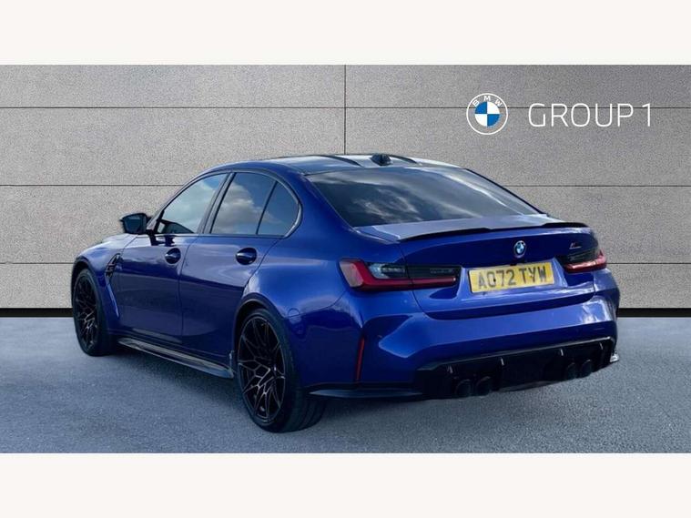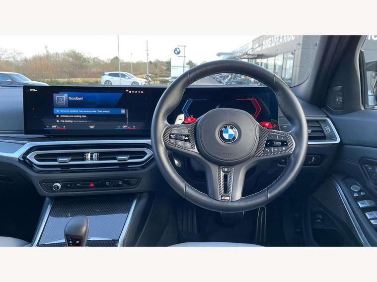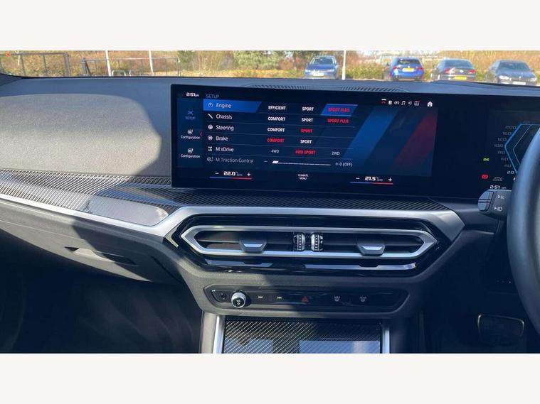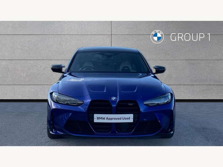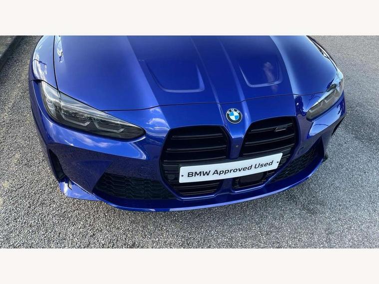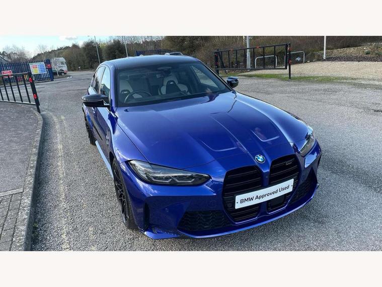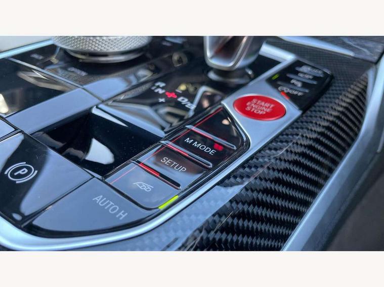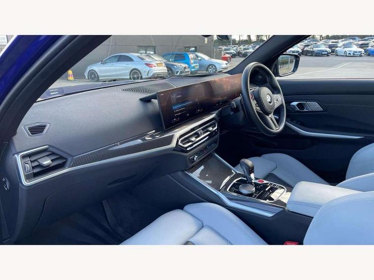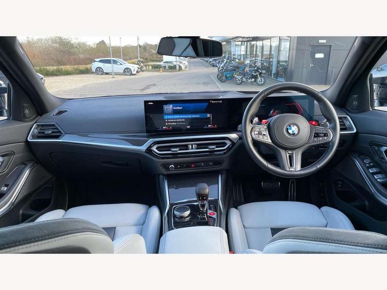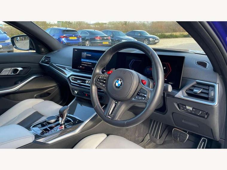 Active guard plus, Automatic start/stop system, Bluetooth functionality with Apple CarPlay/Android Auto, BMW iDrive controller on centre console, BMW legal emergency call, BMW Live Cockpit Professional sat nav system with 12.3" instrument display and high resolution control display, BMW Online services, BMW Teleservices, Brake pad wear indicator warning light, Condition based service, Connected drive services, Door/boot open warning light, Driving experience switch, Head up Display, Illuminated control elements, Instrument cluster with extended contents, Lights on warning, M drive buttons, Oil sensor for level and grade, warning by check control system, Oil temperature gauge, On board computer, On board diagnostics, Optimum shift indicator, Outside temperature display, Pull away assistant, Run flat indicator, Service interval indicator, Shifting point display, Speed limiter, Variable sport steering, Wi-Fi hotspot, Widescreen display, Adaptive M Sport suspension, Double joint spring strut front axle, Electronic differential lock control (EDLC), M Drive Professional including track mode, laptimer, traction control & Drift analyser, M Sport differential, M steptronic sport transmission with drivelogic, Safety battery terminal clamp, 8 programmable favourite buttons, Auxiliary point for auxiliary devices, BMW professional radio/CD/MP3, DAB Digital radio, Harman/Kardon loudspeaker system, 3rd brake light, Acoustic glazing, Auto dimming driver's door mirror, Auto dimming rear view mirror, Automatic headlights + automatic windscreen wipers, Black chrome exhaust tailpipes, Black model designation badges, BMW emblem on engine compartment lid and tailgate, BMW high gloss shadow line with extended contents, BMW Individual shadowline lights, Body colour bumpers, Body colour door handles, Carbon fibre reinforced plastic (CFRP) roof with high gloss black roof aerial bulge and roof mouldings, Day time running light, Door mirror integrated indicators, Door sill finishers with aluminium inserts, Dynamic brake lights, Electric adjustable heated door mirrors, Electric folding door mirrors, Electric front and rear windows with one touch/convenient open/close function, Follow me home headlights, Front and rear apron plastic in body colour, Front and rear bumper system, Headlight beam throw control, Heat protection, sun protection glazing, Heated rear window with automatic switch off, Heated washer jets, High beam assistant, High gloss black frameless kidney grille with M badge, High gloss black lower bumper edges, side sills and diffuser edge binding, LED number plate light, LED tail lights with 3D L-shaped LED light design, M designation, M Sport entry door sill strips, Mirror glass aspheric on driver's side, convex on passenger side, Rear boot, Rear fog lights, Rear reflectors, Rear right M3 competition inscription, Rear side wing doors, Reversing light, Shark fin roof aerial, Strakes in front side panel, black matt/black high-gloss, with model badge, Visible VIN plate, Welcome lighting, 2 front cupholder in centre console with clamping elements and matt black inlay, 2 x 12 V Power sockets (luggage compartment and front centre console), 2 x USB Type C ports for charging and data transmission in front centre console, 2 x USB Type C ports for charging in rear centre console, 3 folding rear headrests, 3 seat bench in 2nd row, Ambient inside door handle light, Ambient lighting for instrument panel, Ambient lighting for storage compartment, Ambient lighting front and rear, Ambient lighting in door panels, Anthracite headlining, Battery in luggage compartment, Carbon fibre centre console incl. cover for cupholders and storage compartment, Carbon fibre decorative steering wheel finishers, Carbon fibre shift paddles, Carbon fibre strip in instrument panel on front passenger side, Centre console armrest with storage compartment, Compartment in front of cupholder, Driver/passenger sunvisors with illuminated vanity mirrors + covers, Dynamic ambient interior lighting, Electric front seats + driver memory, English handbook, Floor mats in velour, Folding rear centre armrest with 2 cupholders, Footwell lighting, Front and rear ambient footwell lighting, Front and rear door exit lights, Front door storage bins with bottle holder, Front interior light, Front isofix attachment + airbag deactivation, Front seat backrest width adjustment, Front seats lumbar support, Front/rear door armrests, Gearshift lever with embossed M badge, Heated front seats, Height adjustable front headrests, Interior mirror lighting, Isofix on 2nd row outer seats, Lockable/illuminated glovebox, Luggage compartment lighting, Manual 40:20:40 split folding rear seat with two tilt positions for backrest, Multifunction steering wheel, Rake/reach adjustable steering wheel, Single front passenger seat, Storage compartment in rear doors, Three zone automatic air conditioning, Through loading system, Toolkit located in luggage compartment, Wireless charging tray, Additional storage compartment pack - M3, Connected package professional - M3, High gloss shadowline exterior trim pack - M3, 3 point seatbelts on all seats, ABS/EBD, Automatic Stability Control (ASC), Brake energy regeneration, Brake fade compensation, Compound structure brake discs, Cornering brake control (CBC), Crash sensor, Driver/Front Passenger airbags, Dry braking, Dynamic brake control, Dynamic Stability Control with M Dynamic mode, Dynamic Traction Control - DTC, Electromechanical parking brake, Front and rear head airbags, Front seat side impact airbags, Front seatbelt pretensioners + load limiters, Hill start assist, M Sport seat belts, Rear child proof door locks, Seatbelt warning, Side impact protection, Two tone horn, Tyre pressure sensor, Warning triangle and first aid kit, Centre lock switch, Closing system with central locking, Digital key, Electronic immobiliser, Thatcham cat 1 remote alarm, Vehicle Key with 4 buttons including the integrated key, Galvanic finish to control surroun