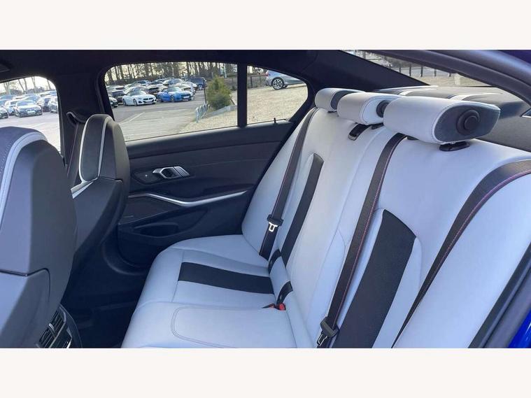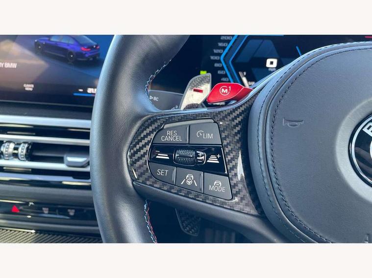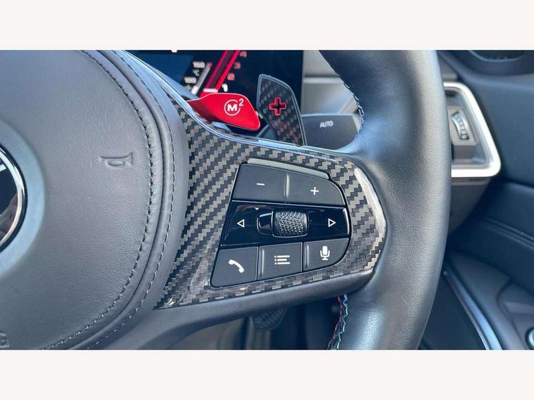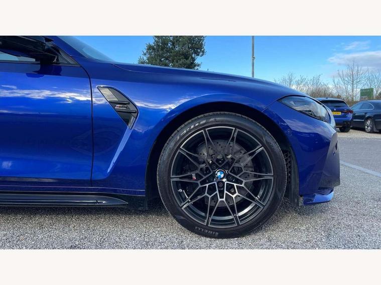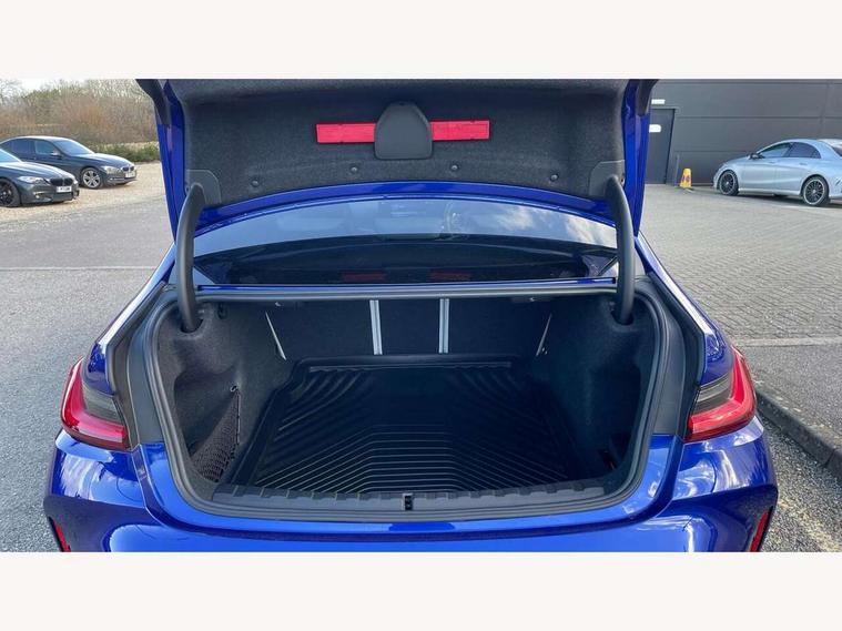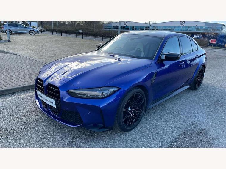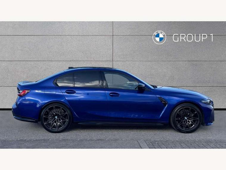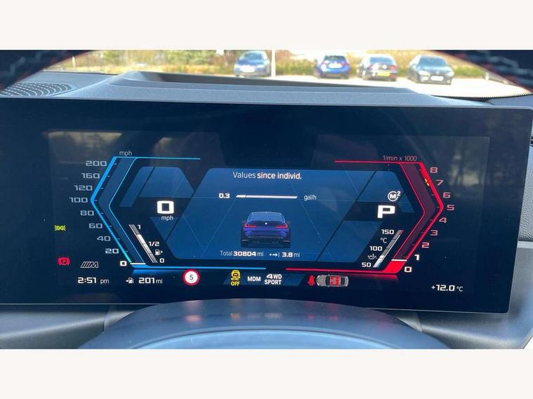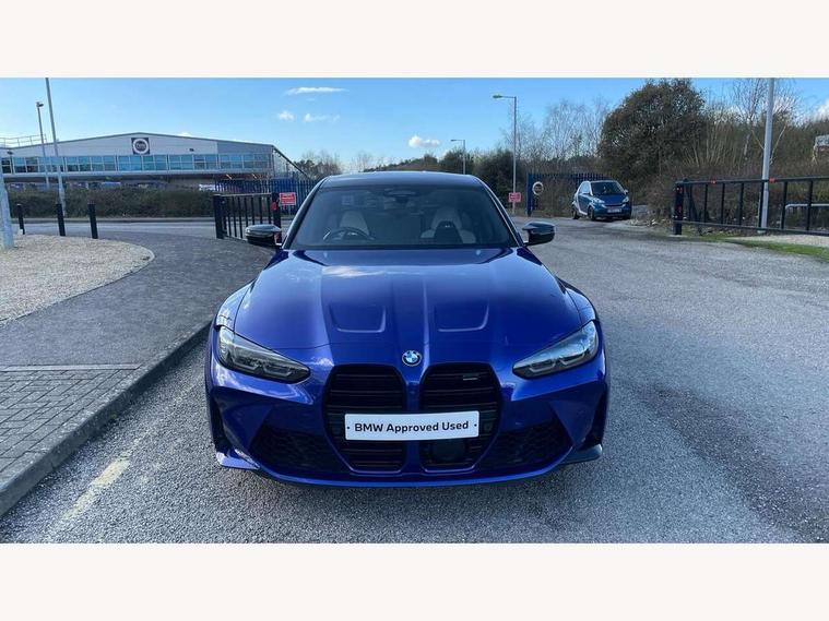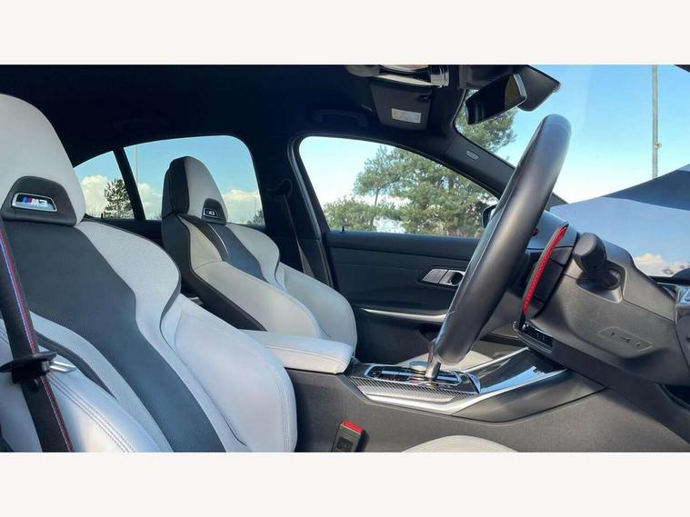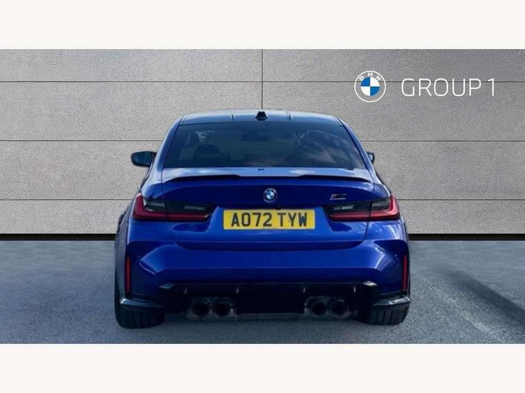 Active guard plus, Automatic start/stop system, Bluetooth functionality with Apple CarPlay/Android Auto, BMW iDrive controller on centre console, BMW legal emergency call, BMW Live Cockpit Professional sat nav system with 12.3" instrument display and high resolution control display, BMW Online services, BMW Teleservices, Brake pad wear indicator warning light, Condition based service, Connected drive services, Door/boot open warning light, Driving experience switch, Head up Display, Illuminated control elements, Instrument cluster with extended contents, Lights on warning, M drive buttons, Oil sensor for level and grade, warning by check control system, Oil temperature gauge, On board computer, On board diagnostics, Optimum shift indicator, Outside temperature display, Pull away assistant, Run flat indicator, Service interval indicator, Shifting point display, Speed limiter, Variable sport steering, Wi-Fi hotspot, Widescreen display, Adaptive M Sport suspension, Double joint spring strut front axle, Electronic differential lock control (EDLC), M Drive Professional including track mode, laptimer, traction control & Drift analyser, M Sport differential, M steptronic sport transmission with drivelogic, Safety battery terminal clamp, 8 programmable favourite buttons, Auxiliary point for auxiliary devices, BMW professional radio/CD/MP3, DAB Digital radio, Harman/Kardon loudspeaker system, 3rd brake light, Acoustic glazing, Auto dimming driver's door mirror, Auto dimming rear view mirror, Automatic headlights + automatic windscreen wipers, Black chrome exhaust tailpipes, Black model designation badges, BMW emblem on engine compartment lid and tailgate, BMW high gloss shadow line with extended contents, BMW Individual shadowline lights, Body colour bumpers, Body colour door handles, Carbon fibre reinforced plastic (CFRP) roof with high gloss black roof aerial bulge and roof mouldings, Day time running light, Door mirror integrated indicators, Door sill finishers with aluminium inserts, Dynamic brake lights, Electric adjustable heated door mirrors, Electric folding door mirrors, Electric front and rear windows with one touch/convenient open/close function, Follow me home headlights, Front and rear apron plastic in body colour, Front and rear bumper system, Headlight beam throw control, Heat protection, sun protection glazing, Heated rear window with automatic switch off, Heated washer jets, High beam assistant, High gloss black frameless kidney grille with M badge, High gloss black lower bumper edges, side sills and diffuser edge binding, LED number plate light, LED tail lights with 3D L-shaped LED light design, M designation, M Sport entry door sill strips, Mirror glass aspheric on driver's side, convex on passenger side, Rear boot, Rear fog lights, Rear reflectors, Rear right M3 competition inscription, Rear side wing doors, Reversing light, Shark fin roof aerial, Strakes in front side panel, black matt/black high-gloss, with model badge, Visible VIN plate, Welcome lighting, 2 front cupholder in centre console with clamping elements and matt black inlay, 2 x 12 V Power sockets (luggage compartment and front centre console), 2 x USB Type C ports for charging and data transmission in front centre console, 2 x USB Type C ports for charging in rear centre console, 3 folding rear headrests, 3 seat bench in 2nd row, Ambient inside door handle light, Ambient lighting for instrument panel, Ambient lighting for storage compartment, Ambient lighting front and rear, Ambient lighting in door panels, Anthracite headlining, Battery in luggage compartment, Carbon fibre centre console incl. cover for cupholders and storage compartment, Carbon fibre decorative steering wheel finishers, Carbon fibre shift paddles, Carbon fibre strip in instrument panel on front passenger side, Centre console armrest with storage compartment, Compartment in front of cupholder, Driver/passenger sunvisors with illuminated vanity mirrors + covers, Dynamic ambient interior lighting, Electric front seats + driver memory, English handbook, Floor mats in velour, Folding rear centre armrest with 2 cupholders, Footwell lighting, Front and rear ambient footwell lighting, Front and rear door exit lights, Front door storage bins with bottle holder, Front interior light, Front isofix attachment + airbag deactivation, Front seat backrest width adjustment, Front seats lumbar support, Front/rear door armrests, Gearshift lever with embossed M badge, Heated front seats, Height adjustable front headrests, Interior mirror lighting, Isofix on 2nd row outer seats, Lockable/illuminated glovebox, Luggage compartment lighting, Manual 40:20:40 split folding rear seat with two tilt positions for backrest, Multifunction steering wheel, Rake/reach adjustable steering wheel, Single front passenger seat, Storage compartment in rear doors, Three zone automatic air conditioning, Through loading system, Toolkit located in luggage compartment, Wireless charging tray, Additional storage compartment pack - M3, Connected package professional - M3, High gloss shadowline exterior trim pack - M3, 3 point seatbelts on all seats, ABS/EBD, Automatic Stability Control (ASC), Brake energy regeneration, Brake fade compensation, Compound structure brake discs, Cornering brake control (CBC), Crash sensor, Driver/Front Passenger airbags, Dry braking, Dynamic brake control, Dynamic Stability Control with M Dynamic mode, Dynamic Traction Control - DTC, Electromechanical parking brake, Front and rear head airbags, Front seat side impact airbags, Front seatbelt pretensioners + load limiters, Hill start assist, M Sport seat belts, Rear child proof door locks, Seatbelt warning, Side impact protection, Two tone horn, Tyre pressure sensor, Warning triangle and first aid kit, Centre lock switch, Closing system with central locking, Digital key, Electronic immobiliser, Thatcham cat 1 remote alarm, Vehicle Key with 4 buttons including the integrated key, Galvanic finish to control surroun