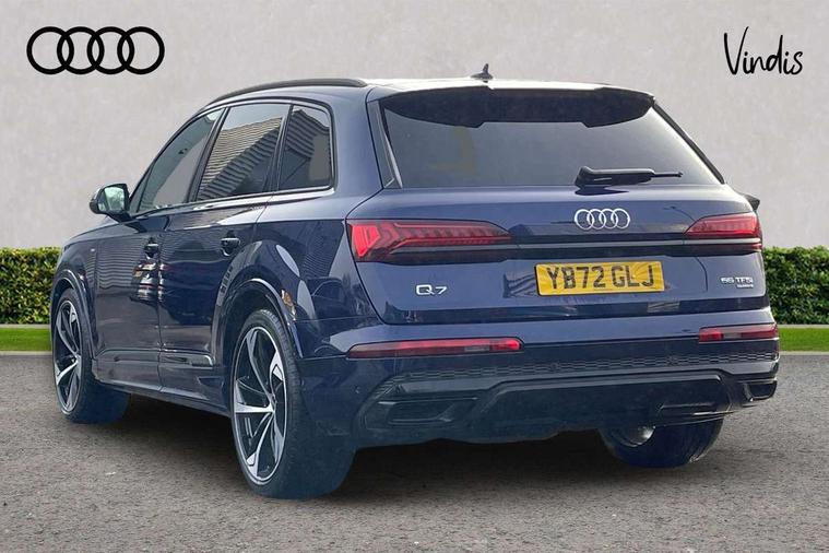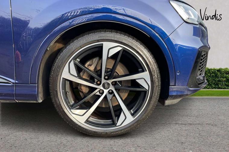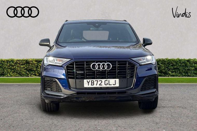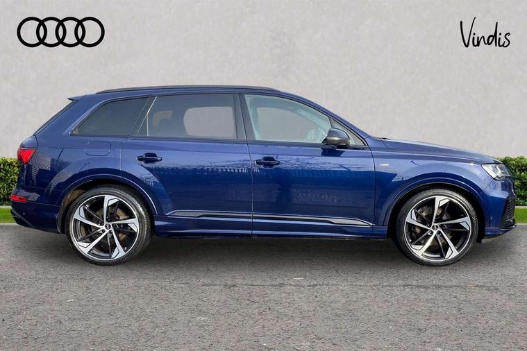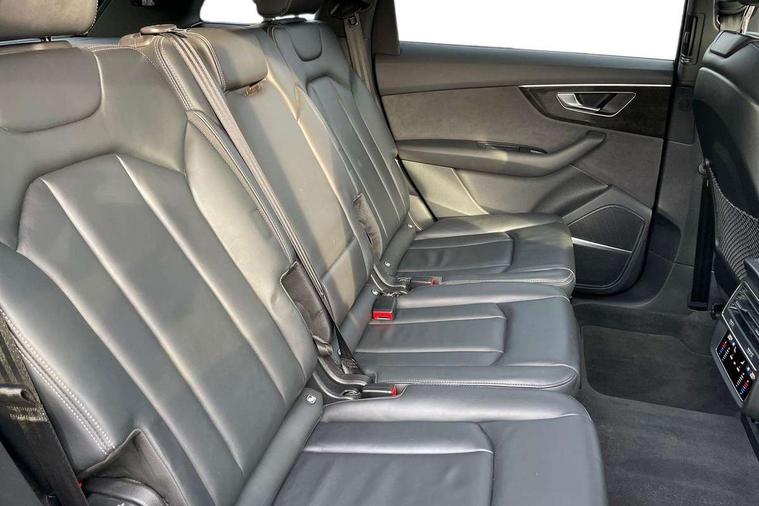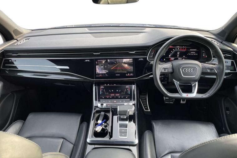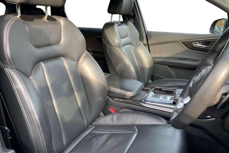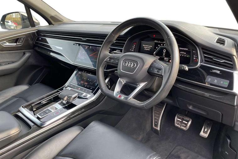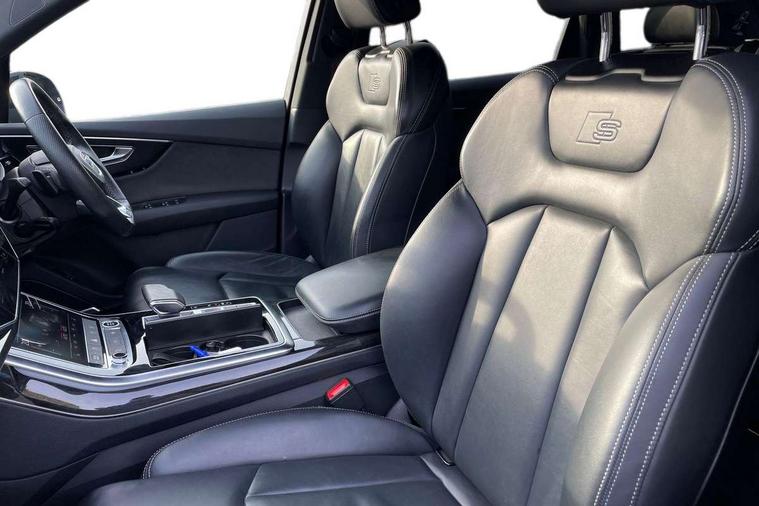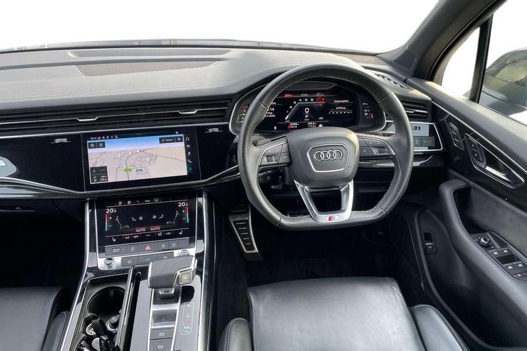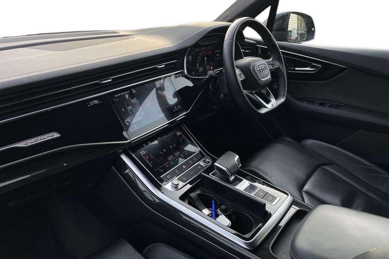Audi connect safety and service (e-call), Audi connect with Amazon Alexa Integration, Audi drive select (Auto, Comfort, Dynamic, Efficiency, Individual, Off-road and All road), Bluetooth interface, Camera based traffic sign recognition, Electromechanical steering, MMI navigation plus with MMI touch screens includes 10.1" and 8.6" screens with haptic feedback, Natural voice recognition, Parking system plus with 360 degree display (front, rear and side sensors) - acoustic and visual park assist system, Power operated tailgate, Rear view camera, Smartphone interface includes wireless Apple carplay/Android Auto, Start/stop system, 48V Mild hybrid technology, 85 litre fuel tank, Adaptive air sports suspension, Quattro all wheel drive with self locking centre differential, Audi music interface - front 2 USB-C ports with charger and data functions, Audi sound system with 6 channel amplifier, 180 watt amplifying capacity and 10 loudspeakers including subwoofer, DAB digital radio module, 3rd brake light, Audi matrix LED headlights with dynamic front and rear indicators, Auto dimming frameless rear view mirror, Black roof rails, Bumpers in contrast paint scandium grey finish includes door trim and wheel arch trim strips, inlays in door strip contain quattro embossing, Electrically adj heated/folding + automatically dimming exterior mirrors with memory + automatic kerb side function for passenger side exterior mirror, Heat insulating glass in windshield, Integrated LED indications in door mirrors, LED daytime running lights, LED rear tail lights, Privacy glass - dark tinted rear and rear side windows from B-pillar backwards, Rear side wing doors, Rear wiper, 2 seat bench in 3rd row, 3 seat bench in 2nd row, 4 zone deluxe automatic climate control, 7 seat layout with ISOFIX points for the front passenger seat and rear passenger seat, Black cloth headlining, Comfort front centre armrest, Electric adjustable front seat with 4 way lumbar support, driver memory functionality, Folding rear seats, Front head restraints, Front/rear floor mats, Heated front seats, Illuminated door sill trims with S logo, LED interior ambient lighting, Luggage compartment cover, Luggage compartment sill protection in stainless steel, Rear head restraints, Single front passenger seat, Stainless steel pedals, Sunvisors with illuminated vanity mirrors, Titanium black styling pack - Q7/SQ7, 3 point seatbelts on all rear seats, Audi pre sense front, Child locks on rear doors, Driver and front passenger, front side and curtain airbags, Electromechanical parking brake, Electronic Stabilisation Control (ESC) including ABS, ASR and EDL, Extended pedestrian protection measures, Hill hold assist, Seatbelt monitoring, Tyre pressure loss indicator, Warning triangle and first aid kit, Anti theft alarm, Anti-theft wheel bolts and wheel loosening detection, Keyless Go, Remote central locking, Polished oak trim with grey finish inlay, Tool kit, Tyre repair kit,
