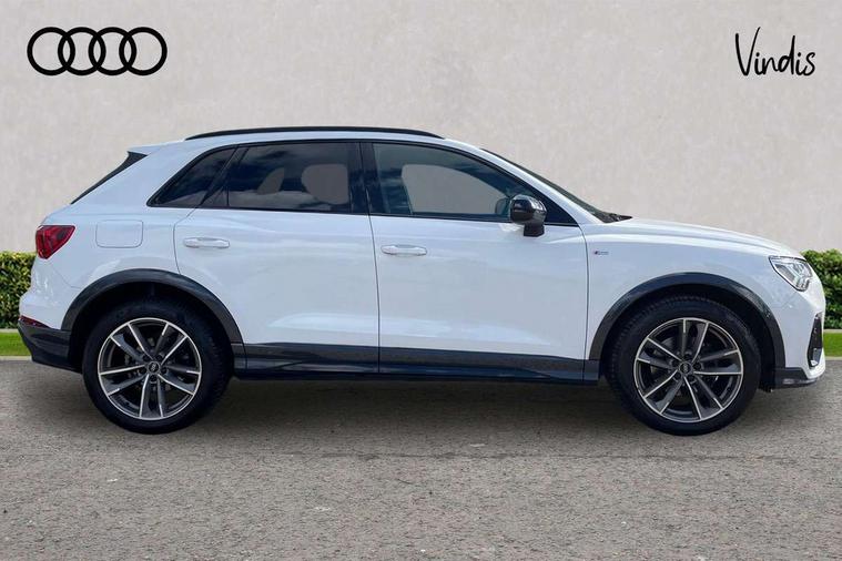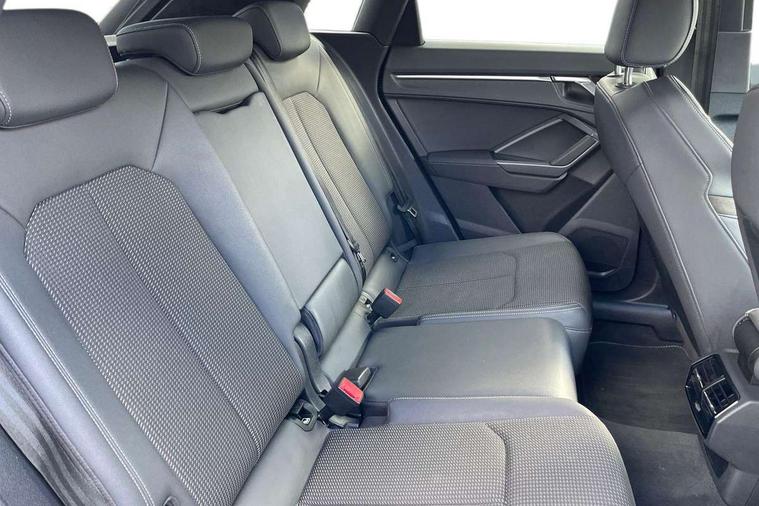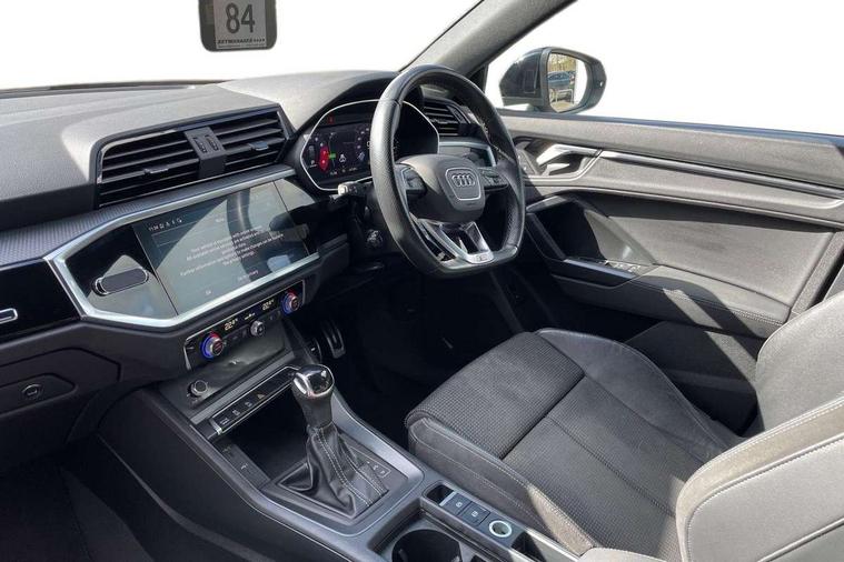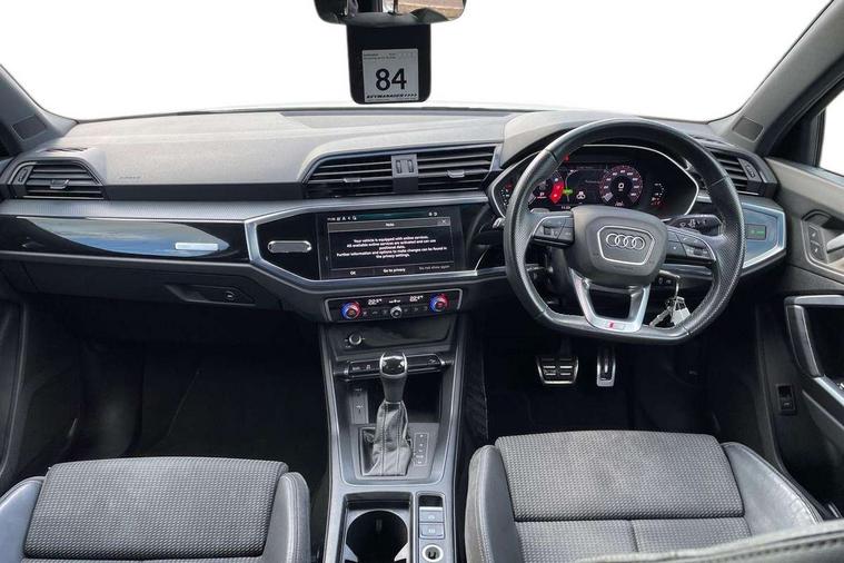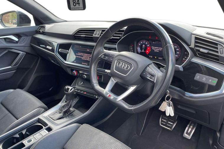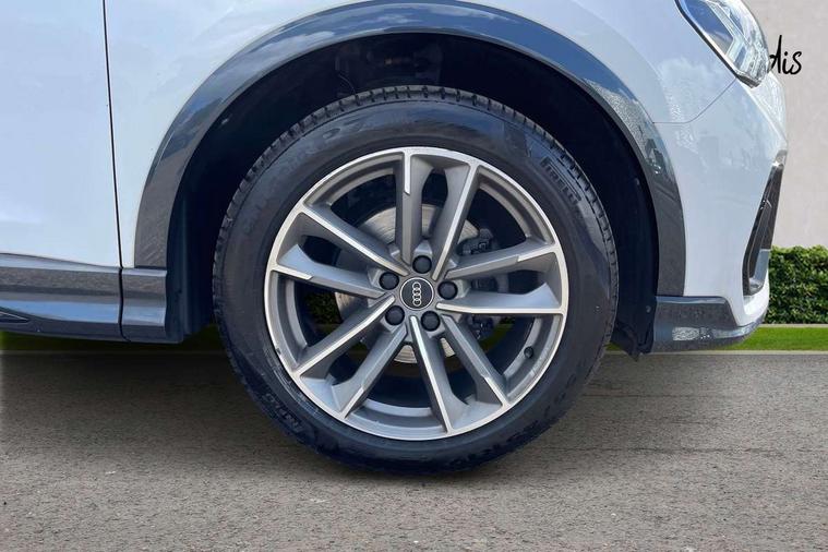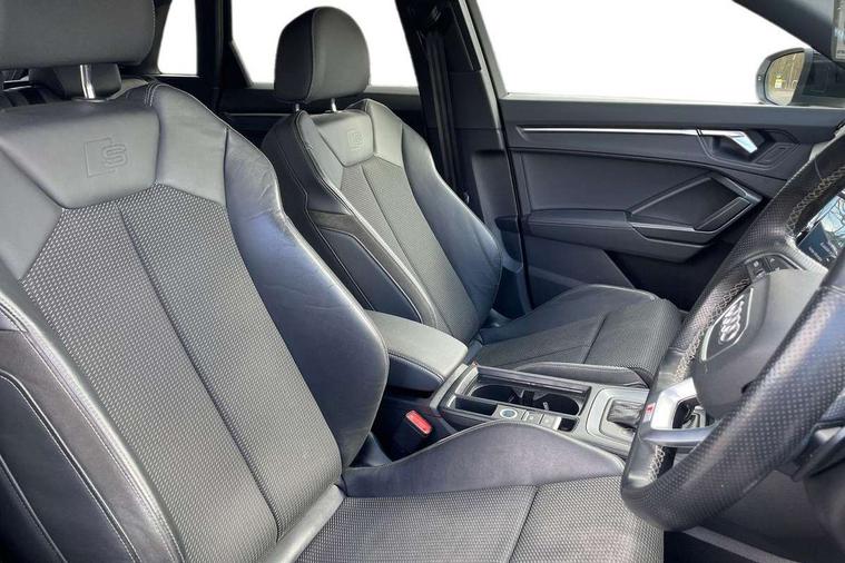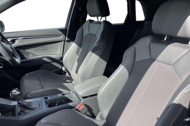 Audi connect safety and service (e-call), Audi drive select, Audi lane departure warning, Audi Virtual Cockpit - 10.25" display, Bluetooth interface, Camera based traffic sign recognition, MMI Navigation Plus with high resolution 10.1 inch touchscreen colour display, Power operated tailgate, Progressive steering, Service interval indicator, Smartphone interface includes wireless Apple carplay/Android Auto, Start stop system with recuperation, Voice control system with natural language interaction, 48V Mild hybrid technology, Sports suspension, 2 USB-C ports with charge and data functions, 6 passive loudspeakers, DAB digital radio module, Acoustic windscreen, Auto dimming frameless rear view mirror, Black roof rails, Electrically folding, adjustable and heated door mirrors with integrated LED side indicators and kerb view function for passenger side, Front and rear electric windows, Front fog lights, High gloss black finish B and C pillars, LED headlights with LED daytime running lights and dynamic rear indicator, LED rear lights, Privacy glass dark tinted rear and rear-side windows (from B-pillar backwards), Rain and light sensors, Rear diffuser strip in matt titanium black, S line bumpers in contrasting Manhattan grey, 12V socket in rear centre console, 40:20:40 folding with manual adjustment for 60:40 forwards/backwards position and backrest angle, Adjustable rear seat bench/backrest with centre armrest and cupholder, Black cloth headlining, Dual zone electronic climate control, Front and rear black floor mats with contrast stitching in rock grey, Front and rear headrests, Front and rear roof module including reading lights, Front centre armrest, Glove compartment lighting, Height and reach adjustable steering wheel, Illuminated door sill trims with S logo, ISOFIX child seat mounting for front passenger with airbag deactivation and outer rear seat including top tether attachment point for outer rear seats, Luggage compartment light, Manual front seats with height adjustment, Perforated leather gearknob, Stainless steel luggage compartment sill finisher, Stainless steel pedals, Black styling pack - Q3, Non smoking pack - Q3, 3x3 point rear seatbelts, 6 airbags - Driver, front passenger, curtain and side windows, Audi pre-sense front with pedestrain and cyclist recognition, Electrically operated child locks on rear doors, Electromechanical parking brake, Electronic stabilisation control including ABS, ASR and EDL, Hill descent control, Hill hold assist, Pre sense basic, Seatbelt monitoring, Tyre pressure warning, Warning triangle and first aid kit, Anti theft alarm, Anti theft wheel bolts, Remote central locking, Detail dashboard around MMI touch colour display in glass look, black with surround in aluminium look, Leatherette door armrest, Piano black inlay, Tool kit, Tyre repair kit,