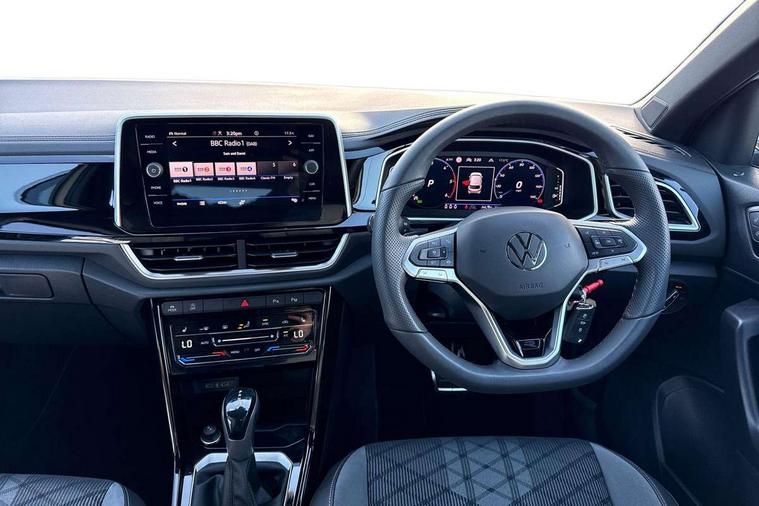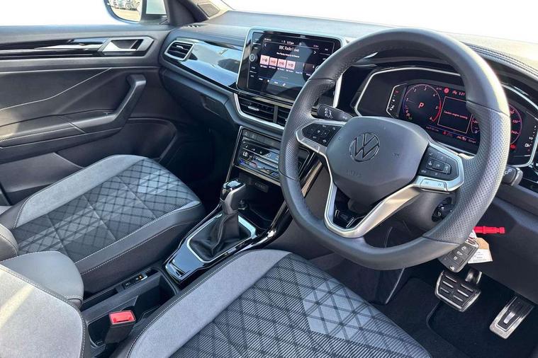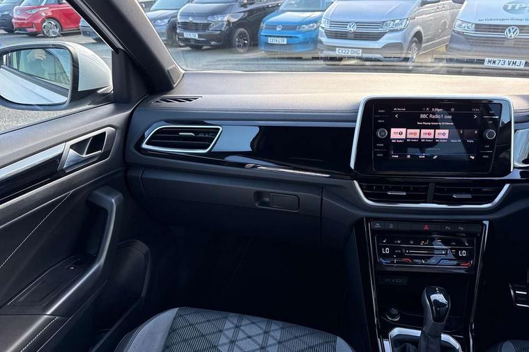 10.25" Digital cockpit pro, Advanced driver attention and drowsiness monitor, Dynamic road sign display, Emergency call service, Lane keeping system Lane Assist, Mobile phone interface, Modified key software - reduce switch off time for key status change to Long no motion, Online services, Park assist including front and rear parking sensors, Service interval indicator, Tailgate/trunk lid release from outside, Think blue trainer driver tips and journey analysis, Warning sound and light for front seatbelts unfastened, Wireless app connect, Battery regeneration during braking, Start/stop function with battery regeneration, DAB Digital radio, Diversity antenna for FM reception, Front and rear 6 speakers, Music playback - MP3, WMA and AAC files, Premium USB cable in choice of either Apple or Android smartphone compatibility, SD card slot, Simultaneous pairing of 2 compatible mobile devices, Title and cover art display, We Connect and We Connect Plus functionality, Auto dimming interior rear view mirror, Automatic hazard lights activation under emergency braking, Automatic headlight control with LED separate daytime running lights with coming/leaving home function, Body coloured exterior mirror housings and door handles, Electrically adjustable and heated door mirrors, Extended roof spoiler, Exterior mirrors aspherical on driver side, convex on front passenger side, External USB type C socket and charging sockets, Front windscreen wiper with intermittent wipe and 4 position delay, Heated rear window, LED 3rd brake light, LED rear combination lamps, LED rear number plate lights, Power windows with comfort operation and circuit breaker, Privacy glass for rear side windows and rear window, R-Line design body coloured bumpers, Rain sensor, Rear exhaust tailpipe, Rear fog light on one side and reversing lights on both sides, Rear side wing doors, Rear wash/wipe with intermittent wipe setting, Remote electrically foldable door mirrors, puddle lights and reverse activated passenger's door mirror, 12V power socket in centre console, 3 rear head restraints, 3 seat bench in 2nd row, 4 load lashing points in luggage compartment, Air care climatronic air conditoning system with active combination filter and 2-zone temperature control, Black roof lining, Chrome plated decorative trims, Chrome plated radiator grille inserts, air vent surrounds and light switch surrounds, Door and side trim panel with leatherette insert, Front + rear carpet mats, Front centre armrest, Front cupholders x 2, Front footwell illumination, Front reading light, Front scuff plates with R Line logo, Front seat back storage pockets, Glove compartment door with light, Instrument lighting, white adjustable panel illumination, Interior ambient lighting and surround lighting, Interior light delay, Isofix child seat preparation, Leather gearshift handle, Load-through provision with cup holder when folded down ('Unsplit rear seat bench, split folding backrest, with centre armrest), Luggage compartment lighting, Single front passenger seat, Stainless steel pedals, Storage compartment in left and right luggage area, Storage compartment in rear doors, Storage compartments in driver and front passenger doors, Sunvisors with illuminated vanity mirrors, Variable boot floor, height adjustable and removable, Driver assistance pack without proactive passenger protection - T-Roc, 3 point height adj front seatbelts + pretensioners, 3 point seatbelts in outer rear with ECE label, ABS, Child locks on rear doors, City emergency braking and pedestrian monitoring, Driver and front passenger airbag with front passenger airbag deactivation, Driver and front passenger safety-optimised head restraints, Drivers seatbelt reminder, Electronic parking brake, Electronic Stability Control (ESC) inc EDL (Electronic Differential Lock) and ASR (Traction Control), Front and rear passengers curtain airbag system including front side airbags, Hill start assist, Predictive pedestrian protection, Rear disc brakes, Two tone horn, Tyre pressure loss indicator, Volkswagen roadside assistance, Piano black decorative inserts in dashboard and front door trim panels, Trims for alloy wheels,