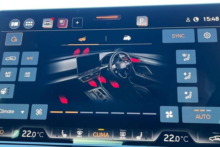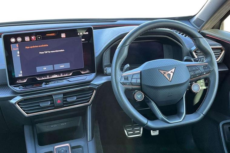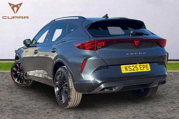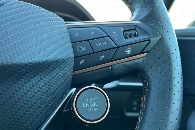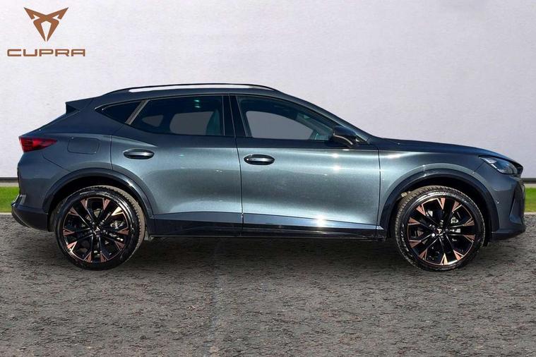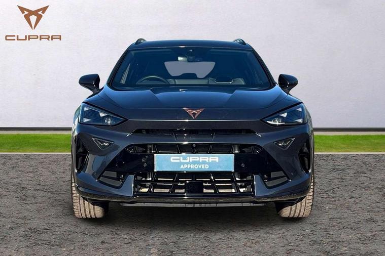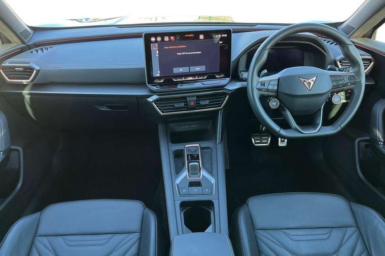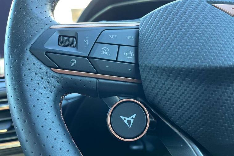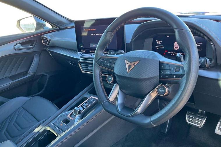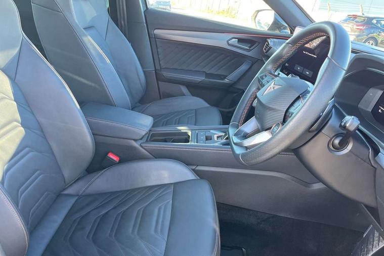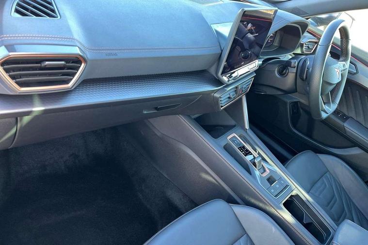 10.25" digital cockpit and configurable dashboard, Adaptive cruise control with follow-to-stop and speed limiter, Advanced driver alert system, Advanced lane assist with semi-automatic vehicle control in a medical emergency and traffic jam assist, Driving profile selection, Dynamic road sign display, Emergency steering support with turn assist, Forward collision warning with automatic braking, Full link phone integration, Intelligent park assist, Progressive steering, RPM, trip computer, outside temp gauge, instrument light brightness, low fuel warning light, lights on reminder, gearshift indicator, Service interval indicator, Side and exit assist, Start/stop system with regenerative braking, Top view camera, Virtual pedal and electric tailgate, Voice control system, Wired Android Auto, Wireless apple carplay, Wireless phone charger, CUPRA sport suspension, Electronic locking differential and dynamic traction support, 2 front and 2 rear USB type C sockets, Media system with navigation, 12.9" touchscreen display, voice control, DAB, steering wheel mounted controls, Auto dimming rear view mirror, Body colour door handles, Body coloured bumpers, Dark grey wing mirror, Daytime running light with automatic headlight control and coming home feature, Door panel ambient lighting, Dynamic headlight range control, Electric front/rear windows, Electrically adjustable heated and folding door mirrors with memory function, Gloss black roof rails and window surrounds, High beam assist, LED 3rd brake light, LED front fog lamps with cornering function, LED Headlights, LED Taillights with dynamic indicator, Rain sensing wipers, Rear diffuser with black simulated exhaust pipes, Rear fog lights, Rear side wing doors, Rear wash/wipe, Tinted rear windows, Welcome lights (within exterior mirror housing), 12V socket, 2 front and 2 rear reading lights, 3 seat bench in 2nd row, 60/40 split rear bench seat with armrest and mechanical seat release, Black headlining, Black interior roof lining, Cupra sports pedals, Dust/pollen filter, Electrically adjustable front seats with lumbar support and memory function, Front and rear head restraints, Front centre armrest, Heated front seats, Heated supersports multifunction leather steering wheel with satellite buttons and gear shift paddles, Height/reach adjust steering wheel, Illuminated aluminium doorsteps, Illuminated interior front door sills, Illuminated sunvisor with mirror, Isofix, Leather dashboard, door insert and side trim panel, LED smart wraparound lighting, PVC/Leather upholstery, Satellite steering wheel, Single front passenger seat, Storage pockets on rear of front seats, Three zone climate control with control panel in rear, Variable luggage/load compartment floor, 3 point seatbelts on all rear seats, ABS, Brake control system - ESC and brake booster, Child proof door locks, Driver and front passenger airbags with front passenger airbag de-activation, Electronic parking brake, Front and rear disc brakes, Front side curtain airbags, Hill hold control, Pre-crash front and rear seat belt tensioner, window closure and hazard lights, Public e-call, Seat belt reminder for front and rear seats, Tyre pressure monitoring system, Anti theft alarm system, KESSY Advanced - Keyless start, keyless entry with SAFELOCK, Locking wheel bolts, Copper and aluminium interior detailing,