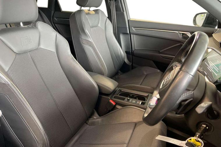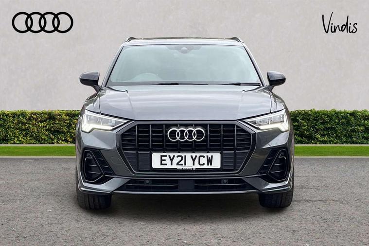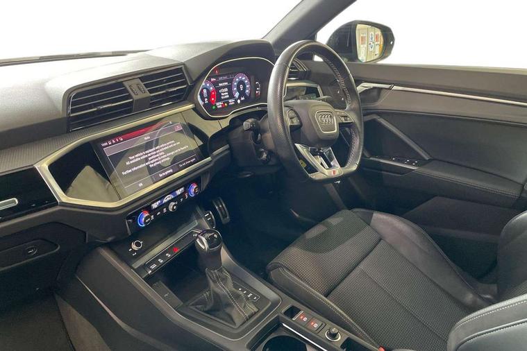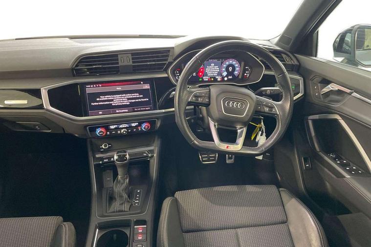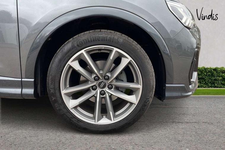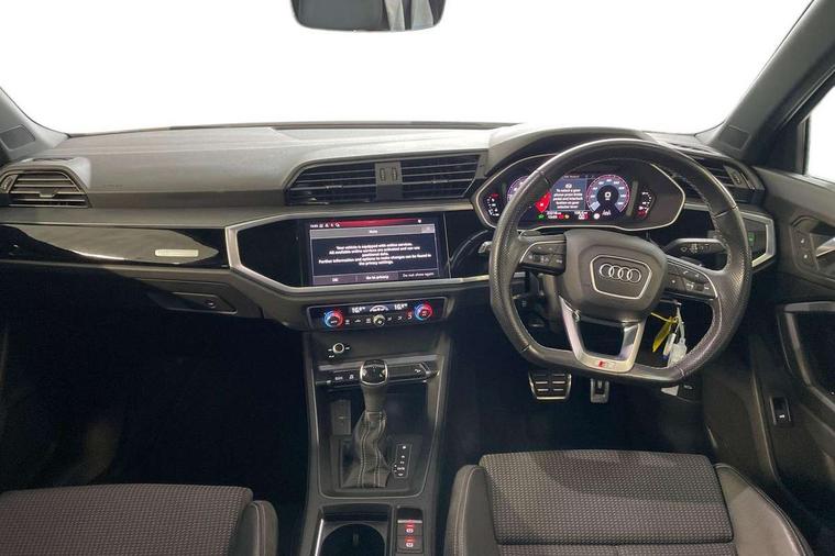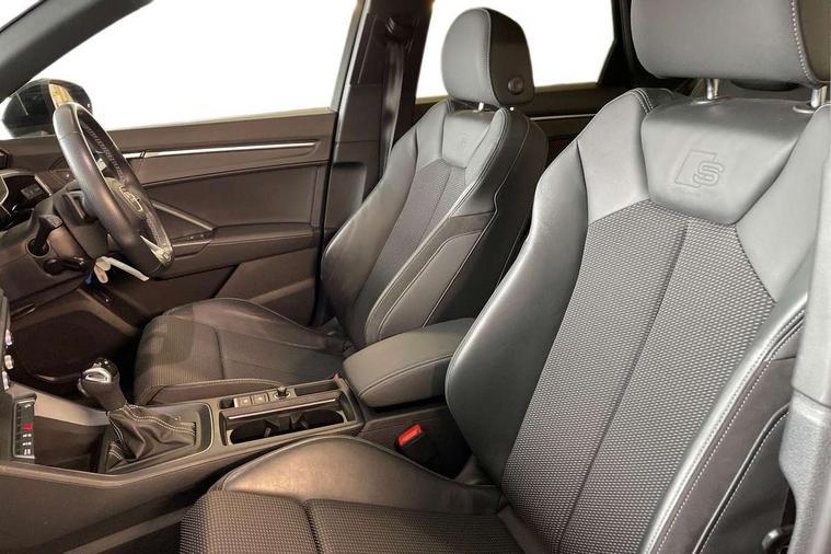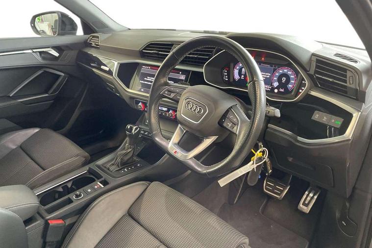 Audi connect safety and service (e-call), Audi drive select, Audi lane departure warning, Audi Virtual Cockpit - 10.25" display, Bluetooth interface, Camera based traffic sign recognition, MMI Navigation Plus with high resolution 10.1 inch touchscreen colour display, Power operated tailgate, Progressive steering, Service interval indicator, Smartphone interface includes wireless Apple carplay/Android Auto, Start stop system with recuperation, Voice control system with natural language interaction, 48V Mild hybrid technology, Sports suspension, 2 USB-C ports with charge and data functions, 6 passive loudspeakers, DAB digital radio module, Acoustic windscreen, Auto dimming frameless rear view mirror, Black roof rails, Electrically folding, adjustable and heated door mirrors with integrated LED side indicators and kerb view function for passenger side, Front and rear electric windows, Front fog lights, High gloss black finish B and C pillars, LED headlights with LED daytime running lights and dynamic rear indicator, LED rear lights, Privacy glass dark tinted rear and rear-side windows (from B-pillar backwards), Rain and light sensors, Rear diffuser strip in matt titanium black, S line bumpers in contrasting Manhattan grey, 12V socket in rear centre console, 40:20:40 folding with manual adjustment for 60:40 forwards/backwards position and backrest angle, Adjustable rear seat bench/backrest with centre armrest and cupholder, Black cloth headlining, Dual zone electronic climate control, Front and rear black floor mats with contrast stitching in rock grey, Front and rear headrests, Front and rear roof module including reading lights, Front centre armrest, Glove compartment lighting, Height and reach adjustable steering wheel, Illuminated door sill trims with S logo, ISOFIX child seat mounting for front passenger with airbag deactivation and outer rear seat including top tether attachment point for outer rear seats, Luggage compartment light, Manual front seats with height adjustment, Perforated leather gearknob, Stainless steel luggage compartment sill finisher, Stainless steel pedals, Black styling pack - Q3, Non smoking pack - Q3, 3x3 point rear seatbelts, 6 airbags - Driver, front passenger, curtain and side windows, Audi pre-sense front with pedestrain and cyclist recognition, Electrically operated child locks on rear doors, Electromechanical parking brake, Electronic stabilisation control including ABS, ASR and EDL, Hill descent control, Hill hold assist, Pre sense basic, Seatbelt monitoring, Tyre pressure warning, Warning triangle and first aid kit, Anti theft alarm, Anti theft wheel bolts, Remote central locking, Detail dashboard around MMI touch colour display in glass look, black with surround in aluminium look, Leatherette door armrest, Piano black inlay, Tool kit, Tyre repair kit,