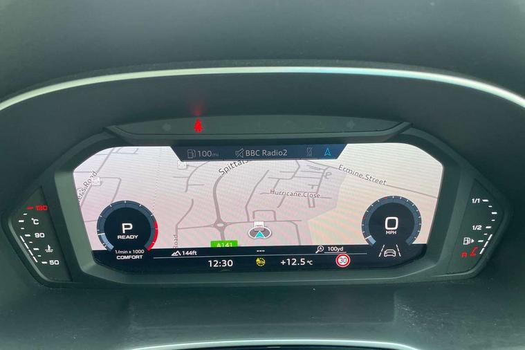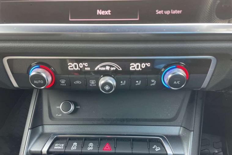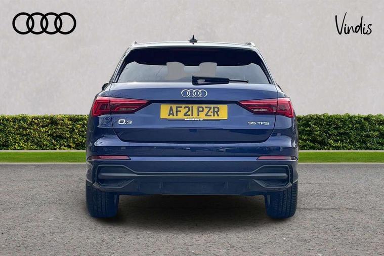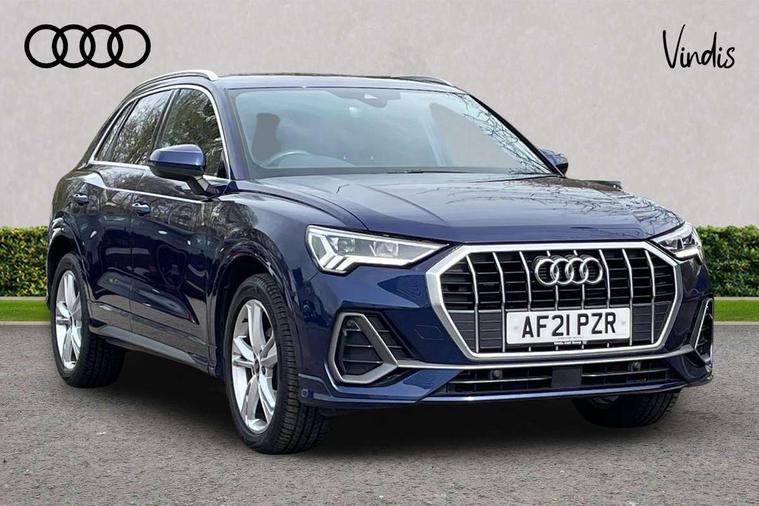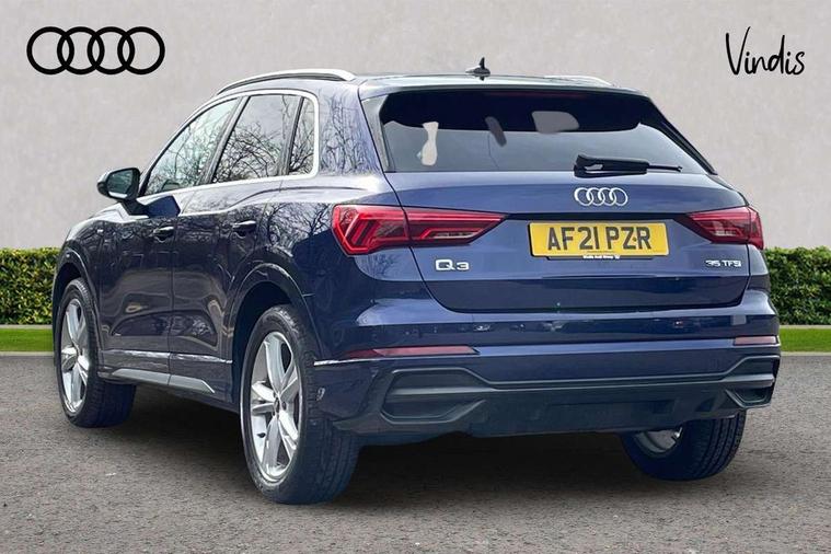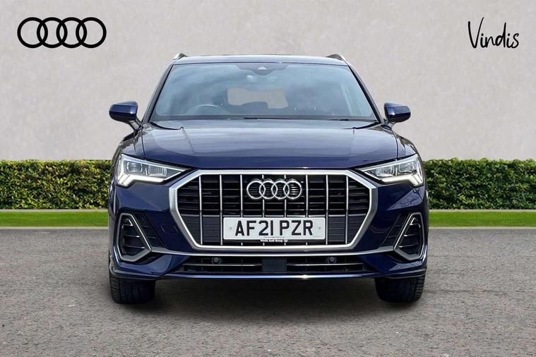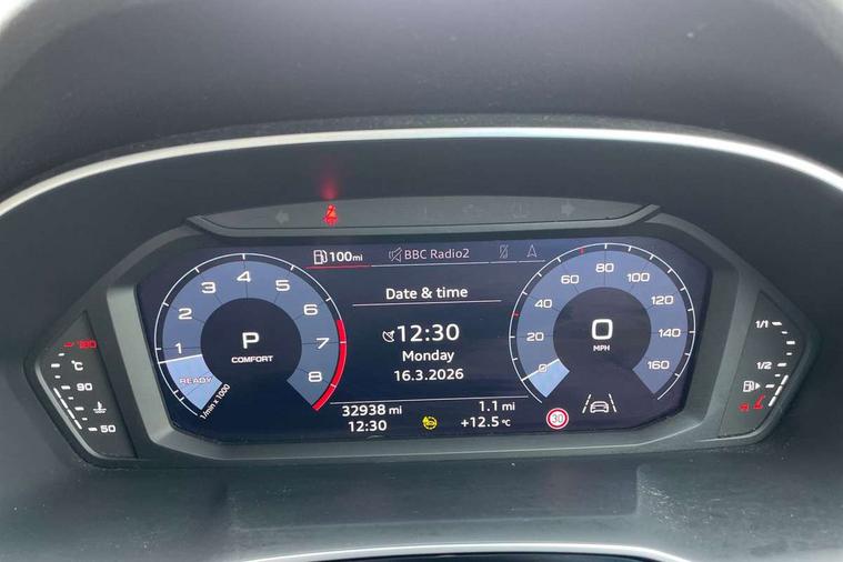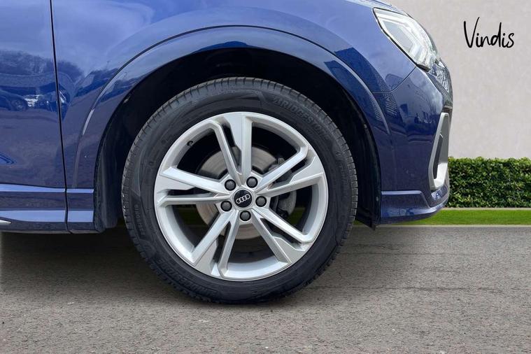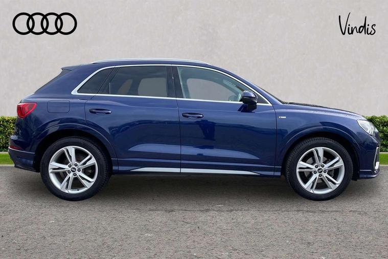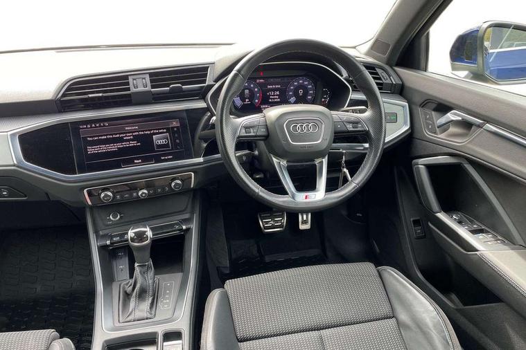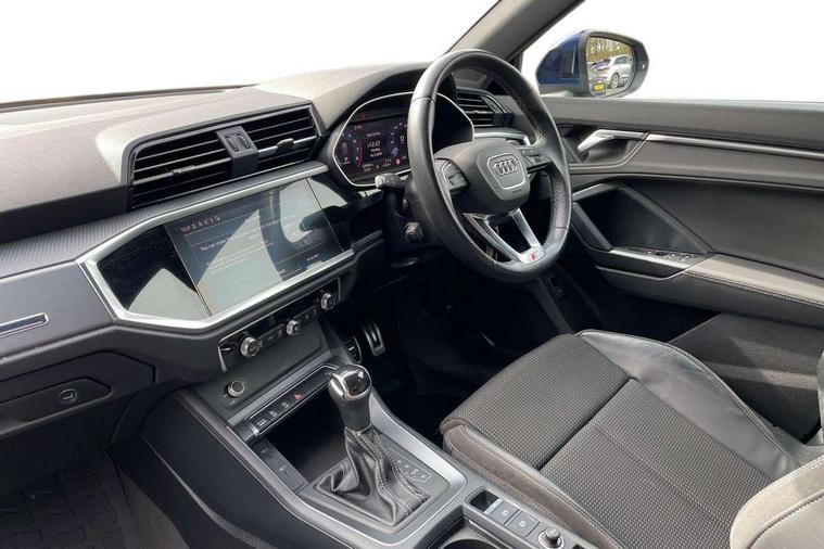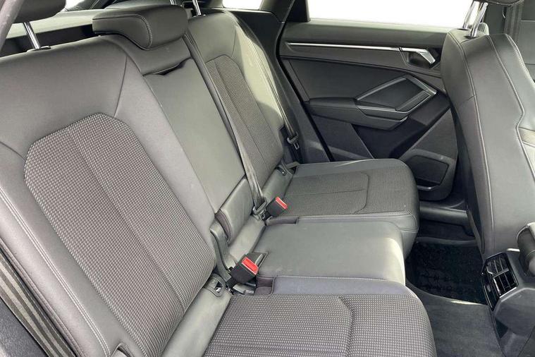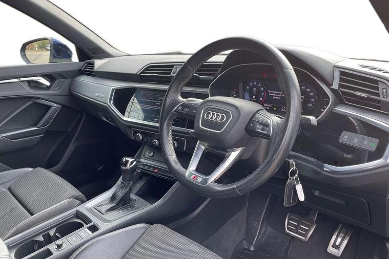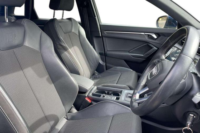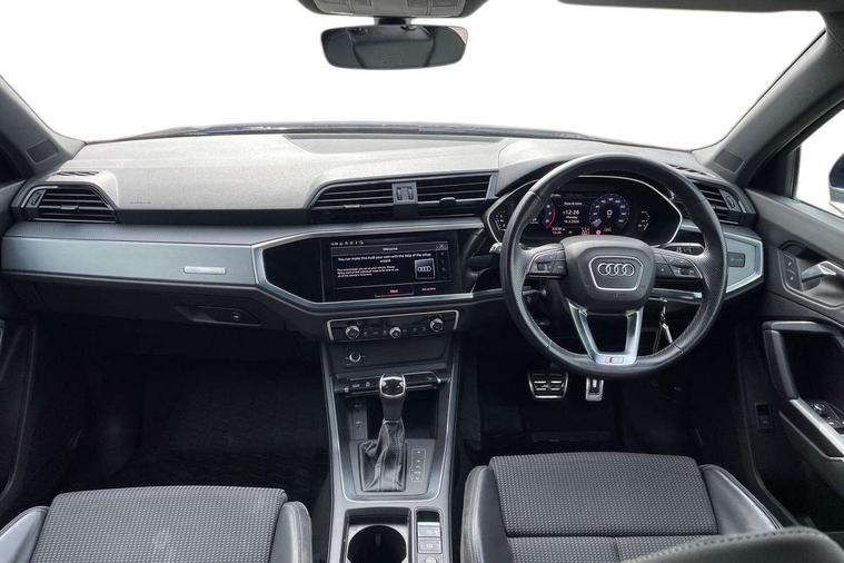 Audi connect safety and service (e-call), Audi drive select, Audi lane departure warning, Audi Virtual Cockpit - 10.25" display, Bluetooth interface, Camera based traffic sign recognition, MMI Navigation Plus with high resolution 10.1 inch touchscreen colour display, Power operated tailgate, Progressive steering, Service interval indicator, Smartphone interface includes wireless Apple carplay/Android Auto, Start stop system with recuperation, Voice control system with natural language interaction, 48V Mild hybrid technology, Sports suspension, 2 USB-C ports with charge and data functions, 6 passive loudspeakers, DAB digital radio module, Acoustic windscreen, Aluminium roof rails, Aluminium window trim, Auto dimming frameless rear view mirror, Body coloured bumpers, Electrically folding, adjustable and heated door mirrors with integrated LED side indicators and kerb view function for passenger side, Front and rear electric windows, Front fog lights, Front side air inlets in matt platinum grey, Front spoiler blade in matt platinum grey, Grille vertical bars in aluminium silver/Matt, High gloss black finish B and C pillars, LED headlights with LED daytime running lights and dynamic rear indicator, LED rear lights, Privacy glass dark tinted rear and rear-side windows (from B-pillar backwards), Rain and light sensors, Rear diffuser strip in matt titanium black, S line badges on front wings, S Line front and rear bumpers, Side skirt insert in matt Platinium grey, Silver chrome grille surround, Titanium black radiator grille, 12V socket in rear centre console, 40:20:40 folding with manual adjustment for 60:40 forwards/backwards position and backrest angle, Adjustable rear seat bench/backrest with centre armrest and cupholder, Black cloth headlining, Dual zone electronic climate control, Front and rear black floor mats with contrast stitching in rock grey, Front and rear headrests, Front and rear roof module including reading lights, Front centre armrest, Glove compartment lighting, Height and reach adjustable steering wheel, Illuminated door sill trims with S logo, ISOFIX child seat mounting for front passenger with airbag deactivation and outer rear seat including top tether attachment point for outer rear seats, Luggage compartment light, Manual front seats with height adjustment, Perforated leather gearknob, Stainless steel luggage compartment sill finisher, Stainless steel pedals, Non smoking pack - Q3, 3x3 point rear seatbelts, 6 airbags - Driver, front passenger, curtain and side windows, Audi pre-sense front with pedestrain and cyclist recognition, Electrically operated child locks on rear doors, Electromechanical parking brake, Electronic stabilisation control including ABS, ASR and EDL, Hill descent control, Hill hold assist, Pre sense basic, Seatbelt monitoring, Tyre pressure warning, Warning triangle and first aid kit, Anti theft alarm, Anti theft wheel bolts, Remote central locking, Dark matt brushed aluminium inlay, Detail dashboard around MMI touch colour display in glass look, black with surround in aluminium look, Leatherette door armrest, Tool kit, Tyre repair kit,