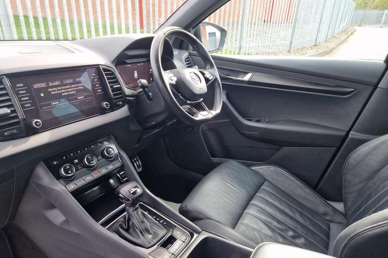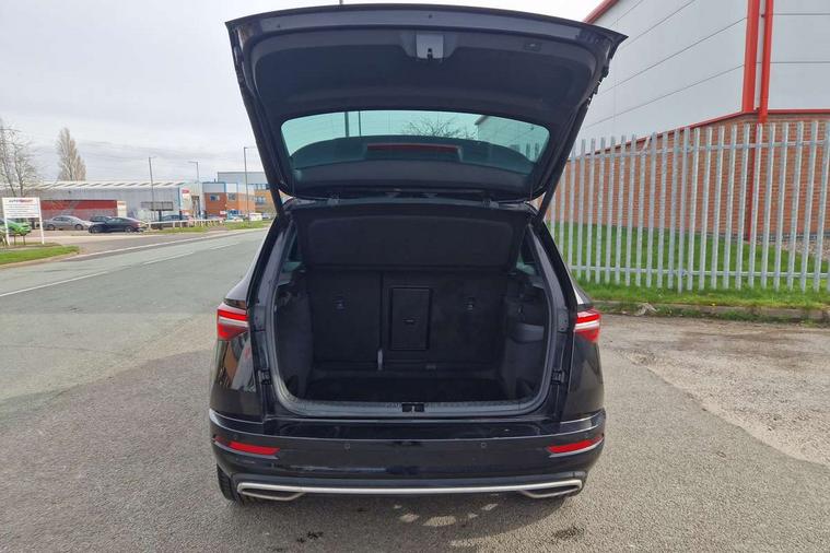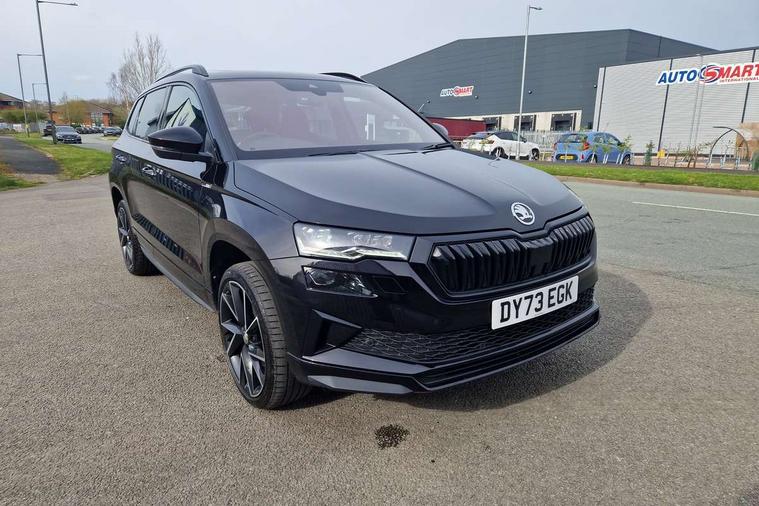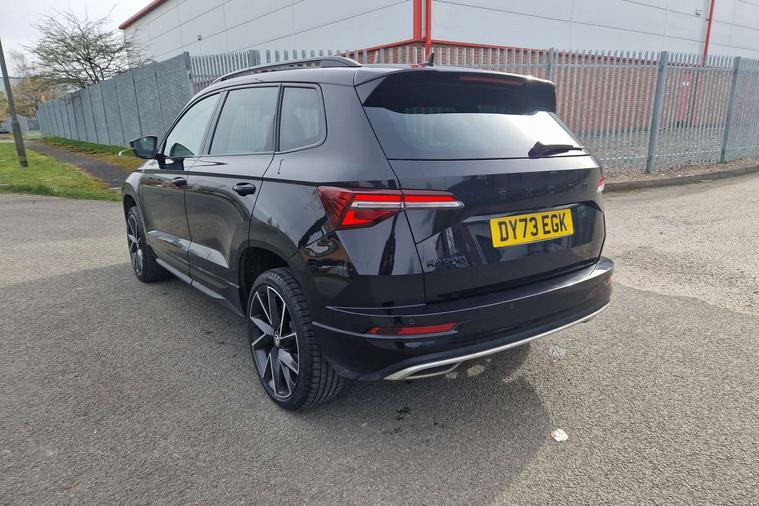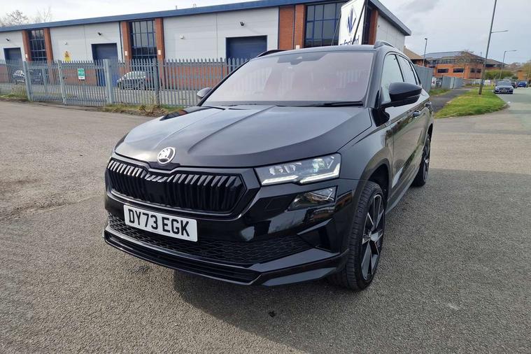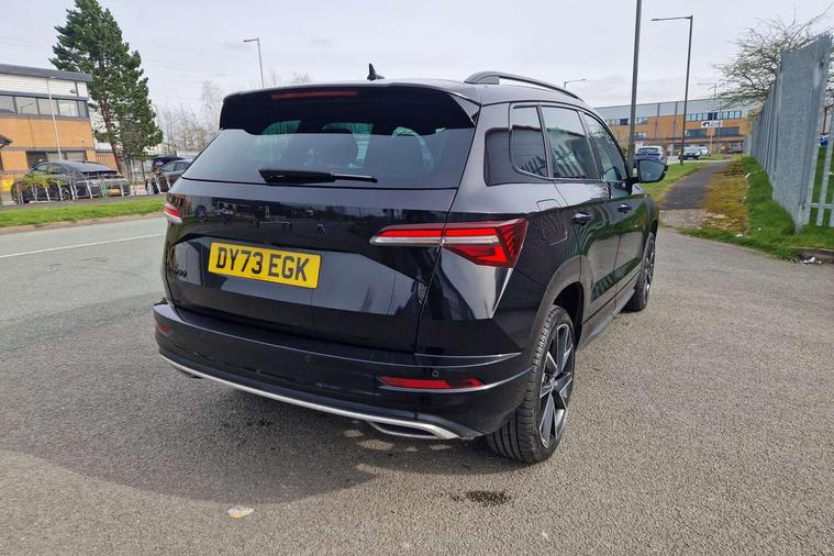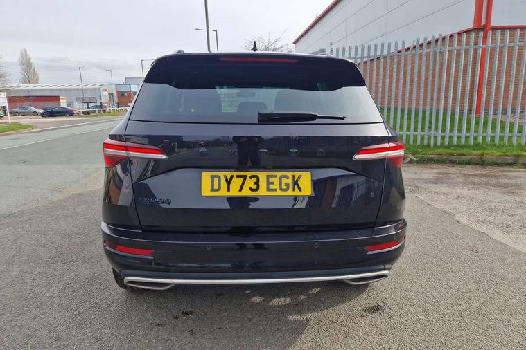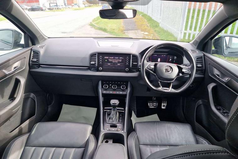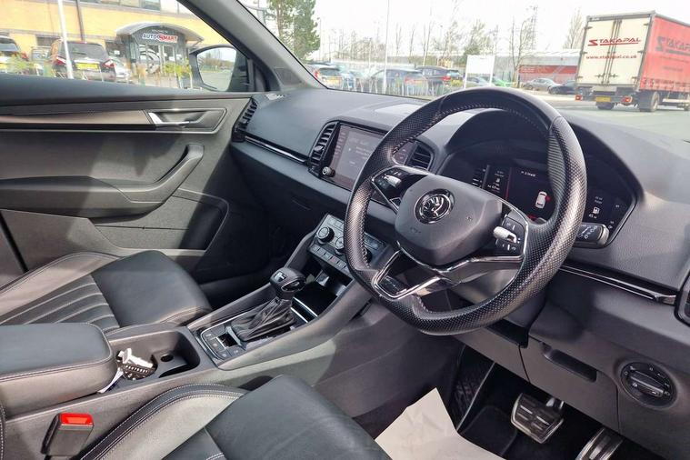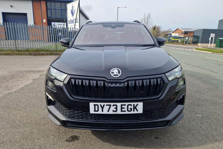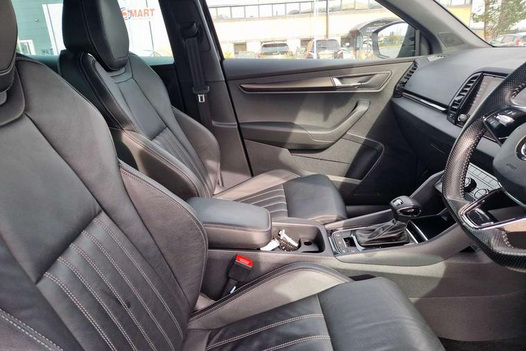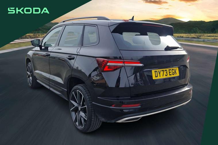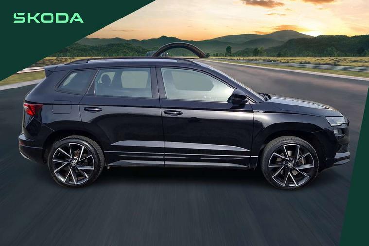 8" Digital display, Care connect, Driver fatigue sensor, Emergency services call system, Outside temperature gauge, Service interval indicator, SmartLink wireless for Apple and wired for Android, Start/stop system with regenerative braking, USB C Port x 2 in front centre console, Virtual cockpit, Virtual pedal with electrically operated boot door, 8 Speakers, DAB radio with Bluetooth, USB connection, Wireless charging without wireless aerial connection, Acoustic glass, Aero front windscreen wipers with intermittent function, Auto dimming rear view mirror with light and rain sensors, Black door mirrors, Black electric window control buttons, Black radiator grille, Black roof rails, Body colour door handles, Electric front and rear windows with child proof lock, Front door steps with SportLine logo, Heated rear windscreen, LED daytime running lights, LED rear lights with high functionality welcome effect and dynamic indicators, Light assistant (coming/leaving home/tunnel light), Panoramic sliding sunroof, Plastic scuff plates, Privacy glass, Protective door side sills in body colour, Rear diffuser, Rear side wing doors, Rear spoiler, Rear window wiper with washer system and intermittent control, Safety reflectors on front doors, Skoda lettering on tailgate in black, Sportline badge on front fender, Sportline decorative inserts with badging, Sports front and rear bumpers, 1.5 litre bottle holders in driver and front passenger door panels, 12V socket in boot, 12v socket in front centre armrest with storage compartment and rear air vents, 3 rear height adjustable headrests, 3 seat bench in 2nd row, 3 spoke leather sports multifunction steering wheel and silver stitching with gear shift paddles, 4 foldable roof handles with rear coat hooks, Black floor carpet, Black roof headlining, Chrome inner door handles, Double sided boot floor, Foldable hooks in the boot, Front head restraints, Height adjustable front three point seats belts with tensioners, Height/reach adjust steering wheel, Ice scraper, Illuminated glovebox, Illuminated luggage compartment, Isofix child seat preparation outer rear, Manual lumbar support for front seats, Pen holder, Pollen filter, Rear boot cover, Rear reading lights, Rear seats fixed folding and divided 60:40, Rubbish bin door, Safety vest holder, Single front passenger seat, Storage box in upper central dashboard closed, Sunvisors with illuminated vanity mirrors, Textile floor mats, Ticket holder, Titan black interior ceiling, Welcome animation with sportline logo, Boot pack - Karoq, Light Pack - Karoq, Parking pack - Karoq, Automatic door unlocking in case of crash, Automatic fuel cut off in case of crash, Child locks on rear doors, Driver airbag, Electronic parking brake with auto hold function, Emergency rear braking signal, ESC including ABS, MSR, ASR, EDS, HBA, DSR, RBS, MKB and traction control, Front side airbags, Hill hold control, Knee airbags, Passenger airbag with switch-off function, Pedestrian monitor, Seatbelt reminder signalisation and pretensioner for all seats, Three point seatbelts rear, Two tone horn, Tyre pressure display, Tyre pressure monitor, Alarm with interior monitoring, back up horn and tilt sensor with safe function, Electronic engine immobiliser, Keyless entry and start/stop, Remote central locking with 2 remote folding keys, Black air vent surround, Black centre console, Satin black dashboard, Satin black door trim, 19" Sagitarius anthracite alloy wheels with matt black aero inserts, Anti-theft wheel bolts protection, Matt black aero hub caps, Tool kit,