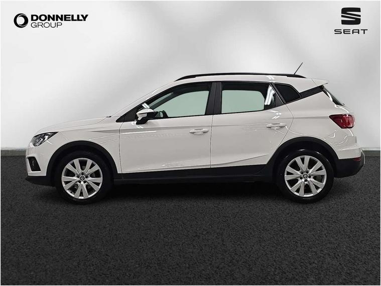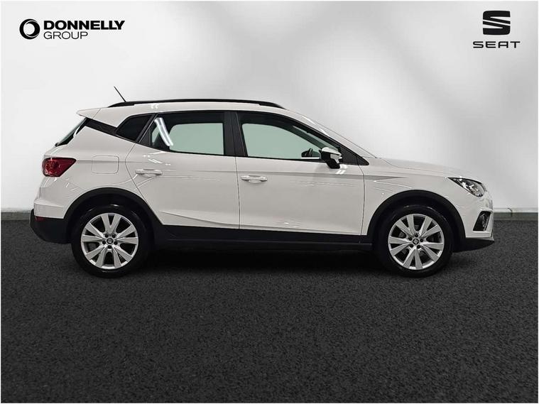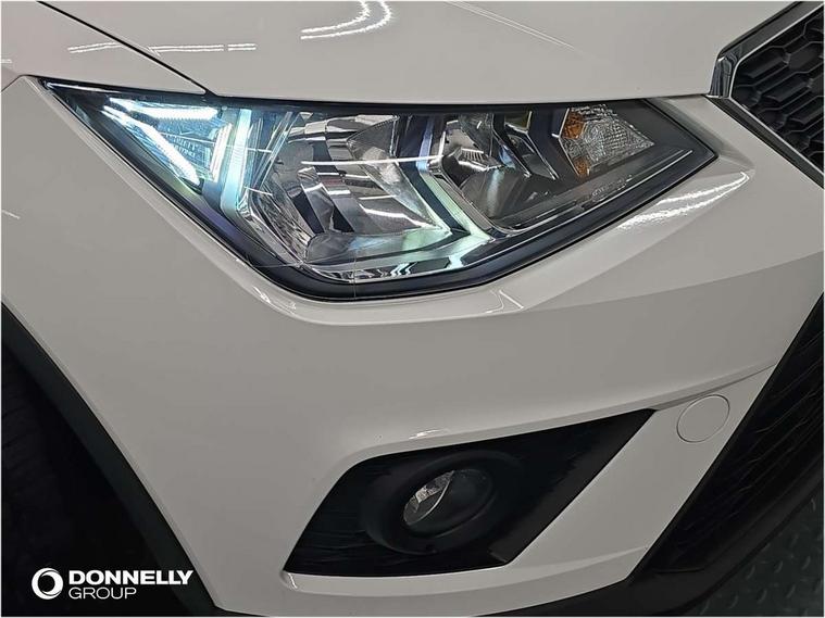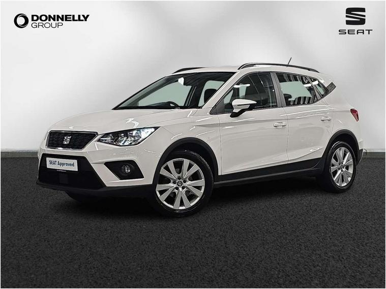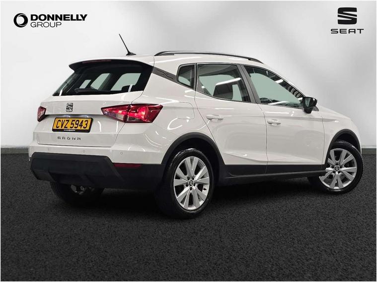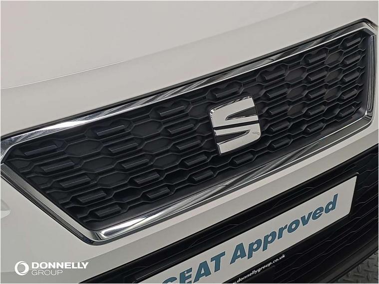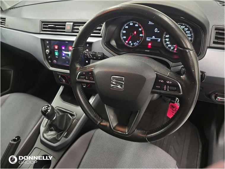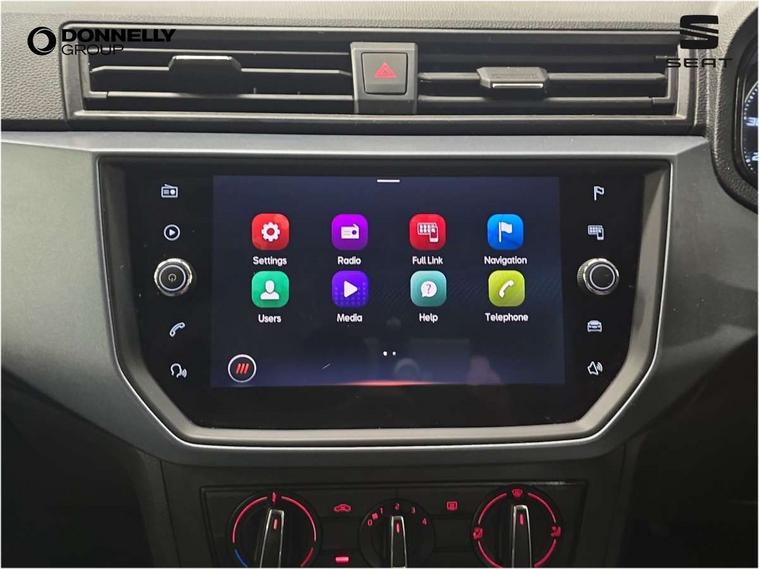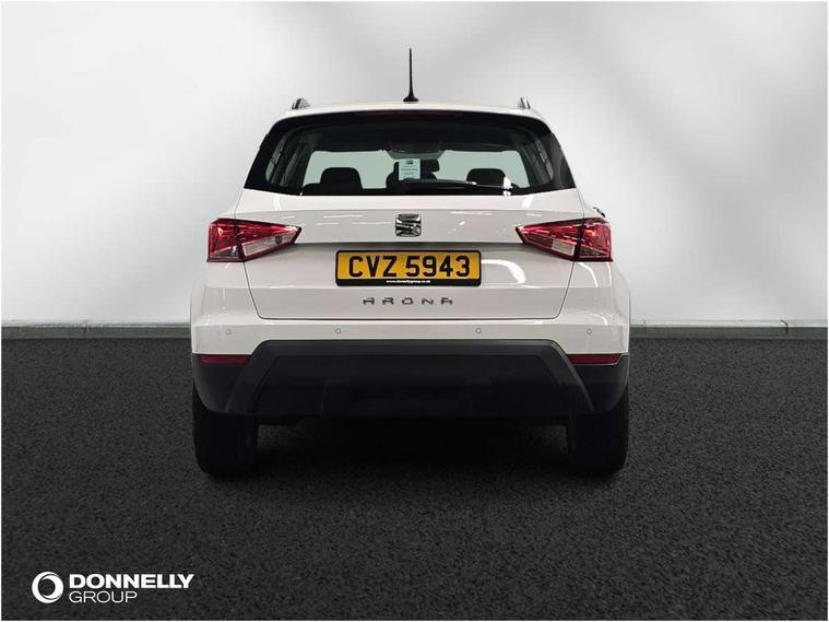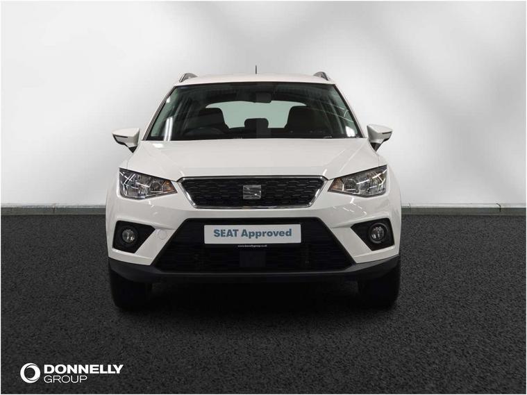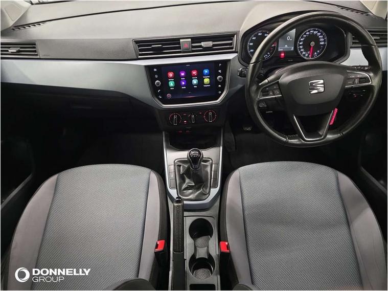 'Lights On' Reminder warning buzzer, Cruise control and speed limiter, Digital clock, Electric speed sensitive power steering, Full Link Smartphone Integration with Mirror Link, Apple Car Play, Google Android Auto with USB Type C cable for Apple and Android compatibility, Low fuel warning light, Outside temperature display, Rear parking sensor, RPM counter, Seat connect with safety, service, remote and online, Trip computer, Comfort suspension, 6 speakers, Bluetooth interface for hands free and audio streaming, DAB digital radio and AM/FM radio, Steering wheel mounted audio controls, Anti theft roof antenna, Automatic activation of hazard warning lights, Automatic headlights, Black roof rails, Black window trims, Body coloured bumpers, Body coloured door handle inserts, Body coloured door mirrors, Dimming rear view mirror, Electric adjustable door mirrors, Electric front/rear windows with one touch/auto up/down, Electric headlight adjustment, Front fog lights with cornering function and rear fog light, Halogen tailights, Hidden exhaust pipe, LED daytime running lights, LED licence plate lighting, Protective side mouldings, Rear window wash/wipe, Twin halogen headlights, Visible VIN plate, Windshield wiper with intermittent control and potentiometer, 2 cupholders, 60/40 split folding rear seat, Air conditioning, Cloth upholstery, Double boot floor, Driver sunvisor with covered mirror + card holder, Dust/pollen filter, Front courtesy light with front reading lights, Gear shift indicator, Grey interior roof, Height adjustable front seats, Height/reach adjustable steering column, Illuminated boot, Instrument lighting with brightness control, ISOFIX points in outer rear seats with top tether anchorage points, Leather steering wheel/gear knob/handbrake, Passenger sunvisor with vanity mirror, Two front and three rear height adjustable headrests, Connectivity pack plus - Arona, Interior chrome pack - Arona, 3 point seatbelts on all rear seats, ABS, Active front headrests, Child locks on rear doors, Driver and front passenger airbags with front passenger airbag de activation, front side and curtain airbags, Electronic stability control, Emergency Brake Assist (EBA) and front assist, Front and rear seatbelt reminder, Hill hold control, Multi-Collision braking, Tiredness recognition system, Traction control, Tyre pressure monitoring system, 2 folding remote keys with window open/close function, Electronic engine immobiliser, Locking wheel bolts, Remote central locking + deadlocks, Interior chrome line trim, Plastic grey dashboard, 17" Dynamic alloy wheels,
