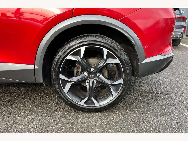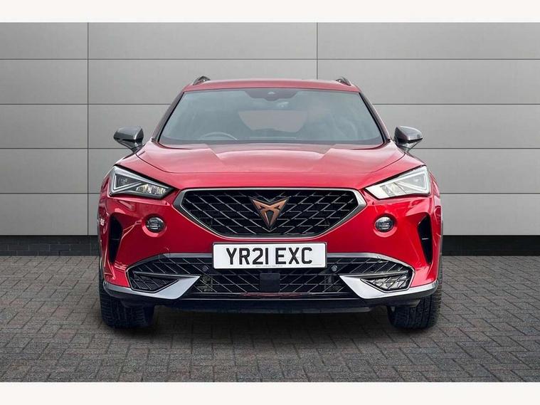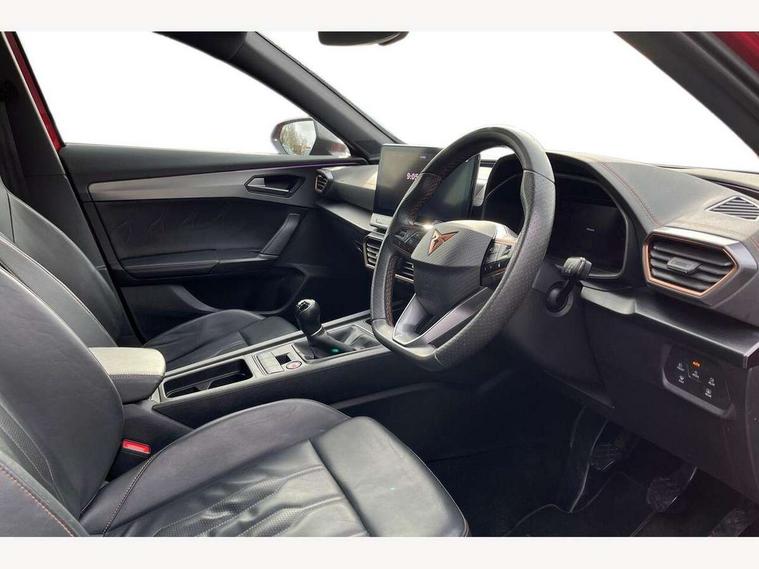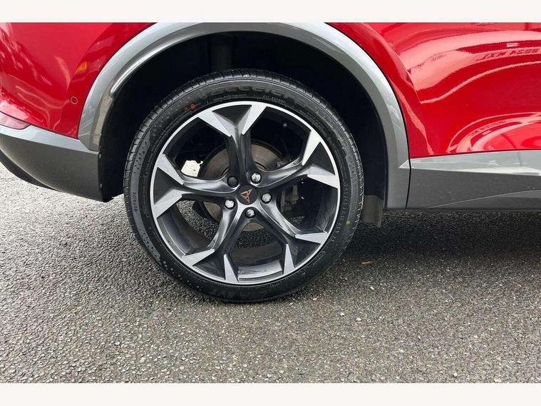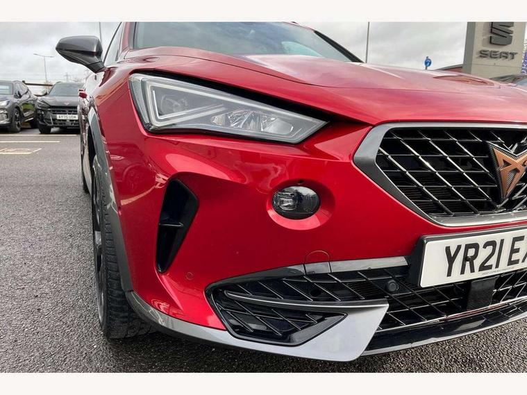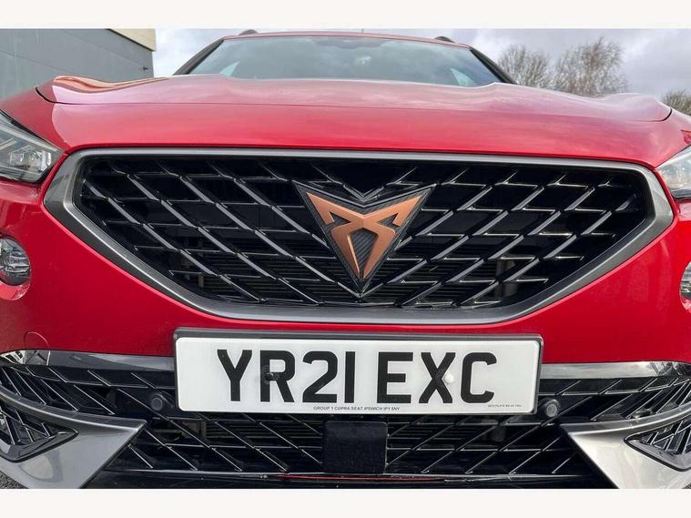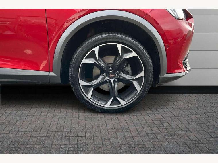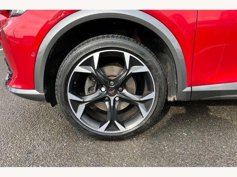 Digital cockpit and configurable dashboard, Driver alert system, Driving profile selection, Forward collision warning with automatic braking, Lane assist, Park assist (inc front/rear parking sensors), PAS, Predictive adaptive cruise control with speed limiter, Rear view camera, RPM, trip computer, outside temp gauge, instrument light brightness, low fuel warning light, lights on reminder, gearshift indicator, Service interval indicator, Start/stop system with regenerative braking, Wireless apple carplay, Wireless phone charger, Electronic locking differential and dynamic traction support, Standard suspension, 2 front and 2 rear USB type C sockets, Auxiliary input socket, DAB radio, Auto dimming rear view mirror, Body colour door handles, Body coloured bumpers, Dark grey wing mirror, Daytime running light with automatic headlight control and coming home feature, Dynamic headlight range control, Electric front/rear windows, Electrically adjustable, heated and folding door mirrors, Front fog lamps with cornering function, Gloss black roof rails and window surrounds, LED Headlights, LED Taillights with dynamic indicator, Rain sensing wipers, Rear diffuser with black simulated exhaust pipes, Rear wash/wipe, Tinted rear windows, Welcome lights, 12v power supply in centre console, 12v socket in loadspace, 2 front and 2 rear reading lights, 230V socket, 60/40 split rear bench seat with armrest and mechanical seat release, Black headlining, Dust/pollen filter, Front and rear head restraints, Front centre armrest, Heated steering wheel, Height/reach adjust steering wheel, Illuminated interior front door sills, Illuminated sunvisor with mirror, Interior ambient lighting, Isofix, Leather multi function steering wheel, Luggage tie-down hooks, Three zone climate control, Three zone climate control with control panel in rear, Variable luggage/load compartment floor, Wraparound lighting, Genuine Nappa leather Pack - Cupra, Navigation system pack - Formentor, Safety and driving pack (M) - Formentor, 3 point seatbelts on all rear seats, ABS, Brake control system - ESC and brake booster, Child proof door locks, Driver and front passenger airbags with front passenger airbag de-activation, Electronic parking brake, Front and rear disc brakes, Front side curtain airbags, Hill hold control, Seat belt reminder for front and rear seats, Tyre pressure monitoring system, Anti theft alarm system, Keyless entry and start system (KESSY), Locking wheel bolts, Copper and aluminium interior detailing, 19" Exclusive machined sport matt black and silver alloy wheels with 94W tyres,