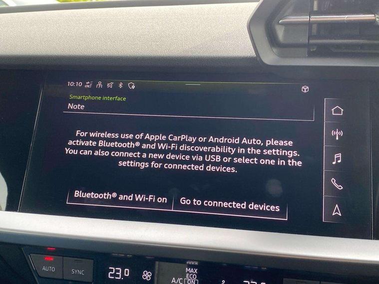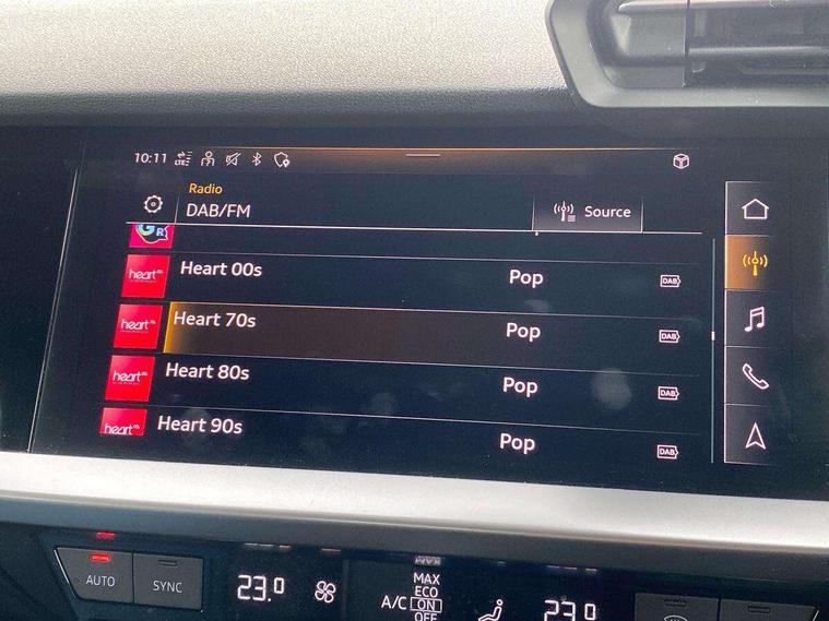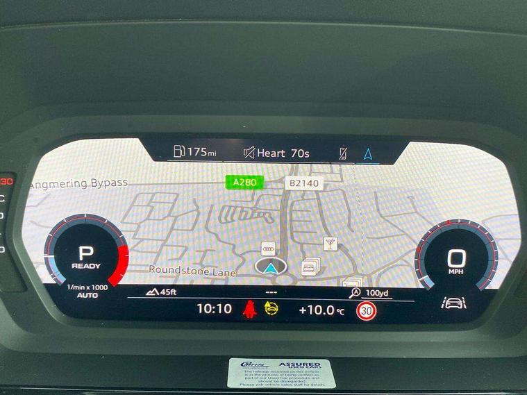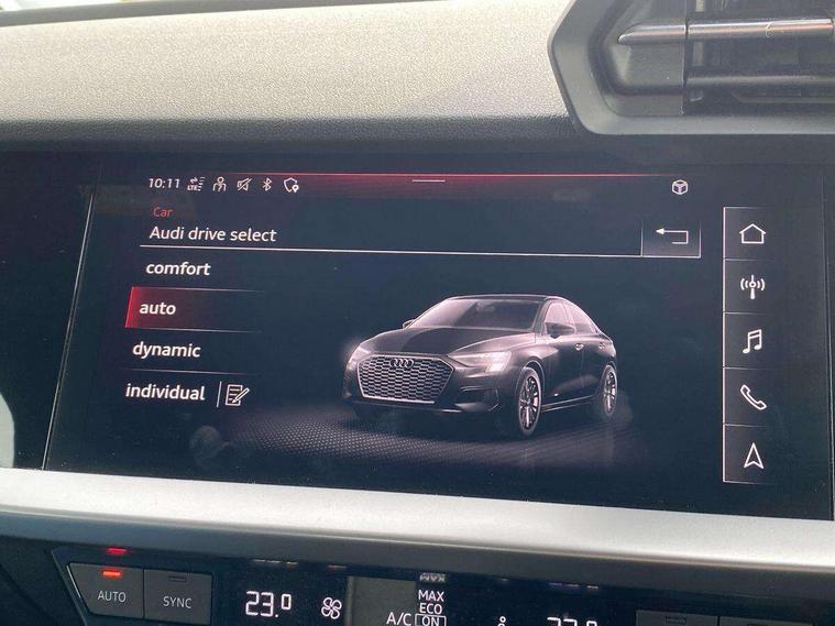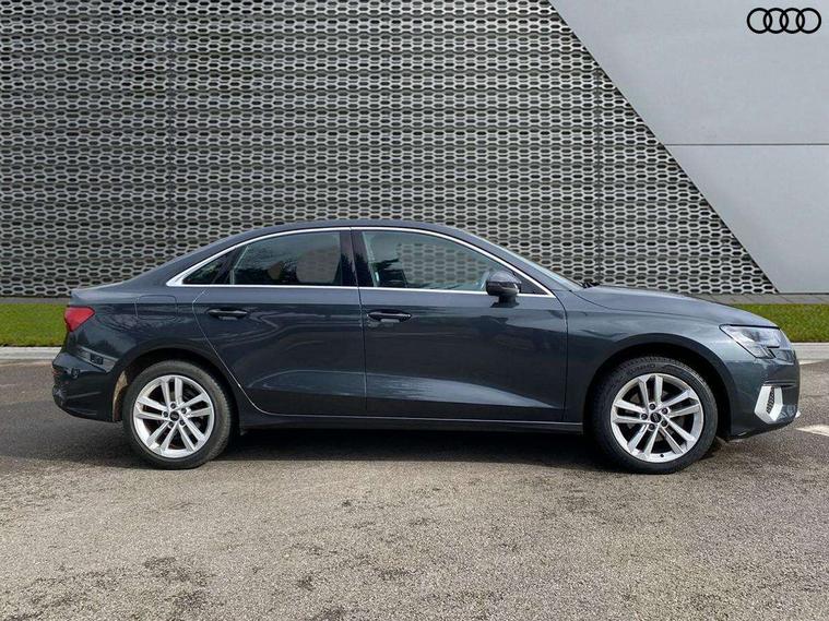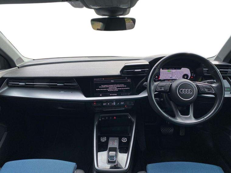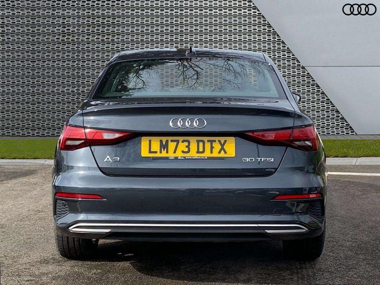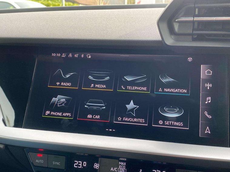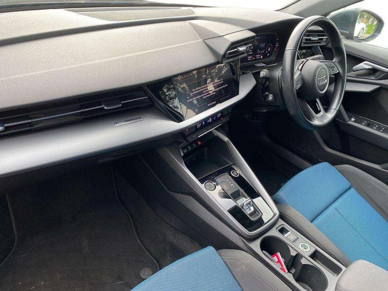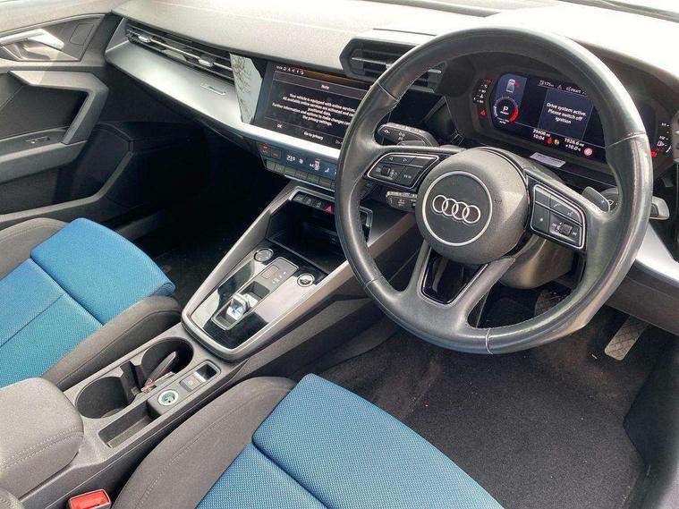 Audi drive select (Auto, Comfort, Dynamic and Individual), Audi smartphone interface, Audi Virtual Cockpit - 10.25" digital and colour instrument cluster, Automatic start/stop system with recuperation, Bluetooth interface, Camera based traffic sign recognition, Collision avoidance assistant, e-Call (emergency call), Electromechanical power speed sensitive steering, Lane departure warning system, MMI Navigation Plus with high resolution 10.1" colour touch screen display, Service indicator, Trip computer, Voice control system with natural language interaction, Standard suspension, 2xUSB-C connection with data and charging functions, 6 passive loudspeakers, CD player, DAB Digital radio, 3rd brake light, Acoustic glass windscreen, Aluminium window trim, Auto dimming frameless rear view mirror, Body colour exterior mirrors, Body colour roof spoiler, Electrically adjustable/heated/folding/auto dimming door mirrors with integrated LED indications + kerb view function for passenger side, Front electric windows, LED daytime running lights, LED headlights and halogen rear lights, Light and rain sensors, Model and engine designation badges at rear, Rear boot, Rear electric windows, Rear side wing doors, Rear window, rear door windows and rear side windows in clear glass, 12V socket and storage compartment in front centre console, 3 seat bench in 2nd row, 3 spoke leather multifunction steering wheel with gear shift paddles, 4 way electrically adjustable lumbar support for driver and front passenger, 60/40 split folding rear seat bench, Dual zone electronic climate control, Front and rear headrests, Front centre armrest, Front door sill trims with aluminium inlay, Front/rear floor mats, Height and reach adjustable steering wheel, Interior lighting - Front and rear roof module including reading lights, glove compartment light and right hand side, Interior lighting - glove compartment light and right hand side, Luggage compartment floor covering, Manual boot compartment lid, Manually adjustable front seats, Routine cloth upholstery with front sports seats, Seat side bolsters, Single front passenger seat, Steel grey cloth headlining, Aluminium interior elements pack - A3, LED interior lighting pack - A3 Saloon, Sport styling pack - A3 Saloon, 3x3 point rear seat belts, Driver and front passenger airbag with passenger airbag deactivation, Electronic Stabilisation Control (ESC) including ABS, ASR and EDL, First aid kit with warning triangle and 2 safety vests, Front side airbags with head airbags and interaction airbag, Pre-sense front with pedestrian and cyclist detection, Seatbelt monitoring, Tyre pressure loss indicator, Anti theft alarm, Anti-theft wheel bolts, Electronically operated child locks, Immobiliser, Remote control central locking, Aluminium air vent surrounds, Inlays with silk effect paint in platinum grey,