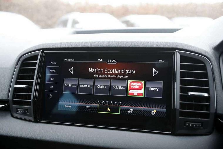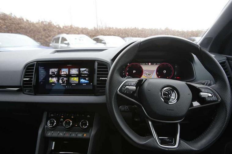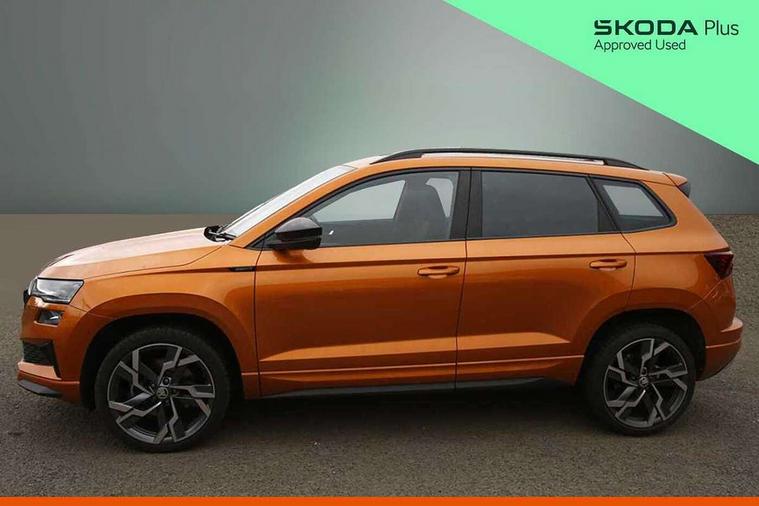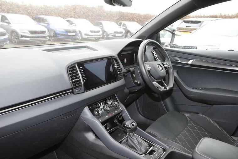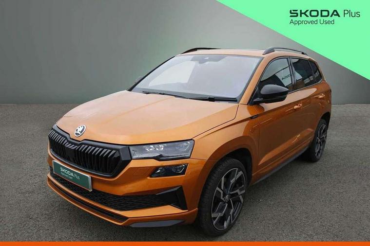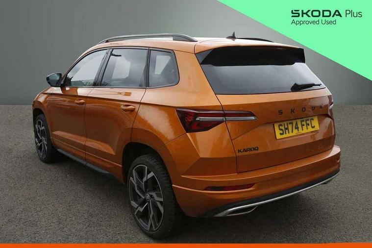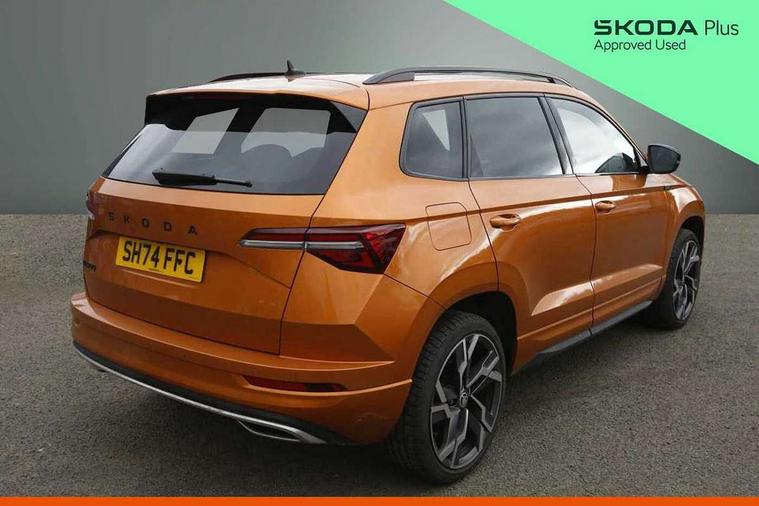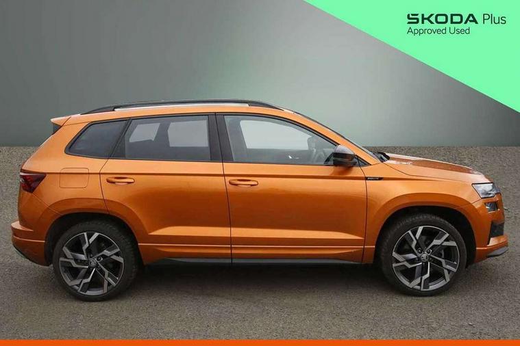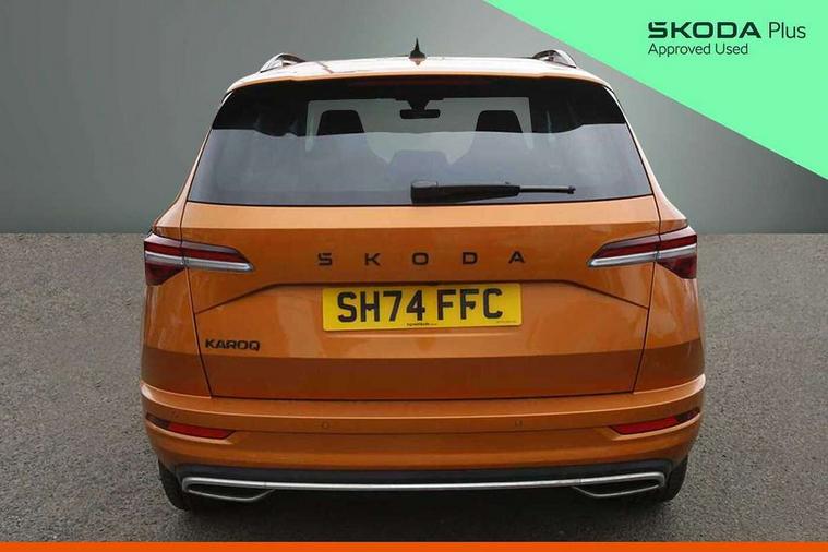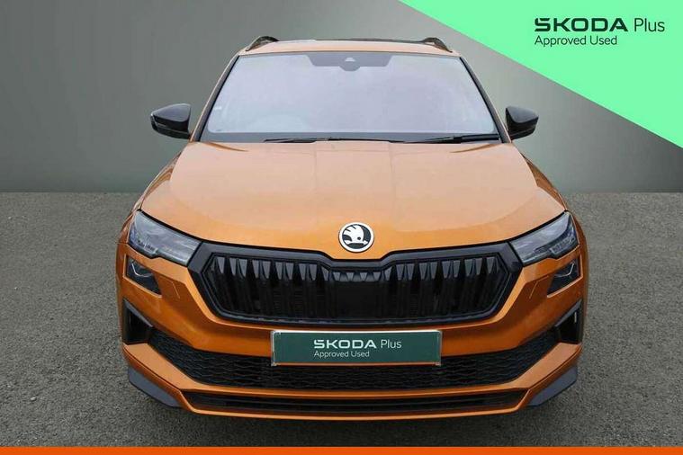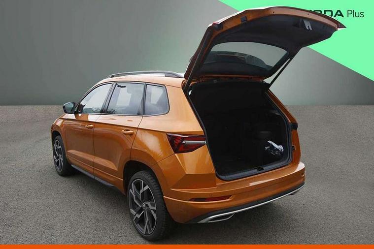 8" Digital display, Advanced driver attention and drowsiness monitor, Emergency services call system, Outside temperature gauge, Sensor for driver assistance systems, Service interval indicator, SmartLink wireless for Apple and wired for Android, Start/stop system with regenerative braking, USB C Port x 2 in front centre console, Virtual Cockpit - 10.25" digital display, Virtual pedal with electrically operated boot door, Wireless smartphone charging, DAB radio with Bluetooth, USB connection, Acoustic glass, Aero front windscreen wipers with intermittent function, Auto dimming rear view mirror with light and rain sensors, Black door mirrors, Black electric window control buttons, Black radiator grille, Black roof rails, Body colour door handles, Electric front and rear windows with child proof lock, Front door steps with SportLine logo, Heated rear windscreen, LED daytime running lights, LED rear lights with high functionality welcome effect and dynamic indicators, Light assistant (coming/leaving home/tunnel light), Panoramic sliding sunroof, Plastic scuff plates in door apertures, Privacy glass, Protective door side sills in body colour, Rear diffuser, Rear side wing doors, Rear spoiler, Rear window wiper with washer system and intermittent control, Safety reflectors on front doors, Skoda lettering on tailgate in black, Sportline badge on front fender, Sportline decorative inserts with badging, Sports front and rear bumpers, Third brake light, Unique dark chrome design logo on alloy wheels, 1.5 litre bottle holders in driver and front passenger door panels, 12V socket in boot, 12v socket in front centre armrest with storage compartment and rear air vents, 2 x Tablet holder, 3 rear height adjustable headrests, 3 seat bench in 2nd row, 3 spoke sports leather heated multifunction steering wheel, 4 foldable roof handles with rear coat hooks, Black floor carpet, Black roof headlining, Chrome inner door handles, Foldable hooks in the boot, Front head restraints, Height adjustable front three point seats belts with tensioners, Height/reach adjust steering wheel, Ice scraper, Illuminated glovebox, Illuminated luggage compartment, Isofix child seat preparation for front passenger seat, Isofix child seat preparation outer rear, Manual lumbar support for front seats, Pen holder, Pollen filter, Rear boot cover, Rear reading lights, Rear seats fixed folding and divided 60:40, Rubbish bin door, Safety vest holder, Single front passenger seat, Skoda lettering on steering wheel, Storage box in upper central dashboard closed, Sunvisors with illuminated vanity mirrors, Textile floor mats, Ticket holder, Titan black interior ceiling, Umbrella under passenger seat, Under passenger seat storage compartment, Ambient Lighting Package - Karoq, Columbus pack - Karoq, LED Interior lighting pack with Skoda welcome logo - Karoq, Light Pack - Karoq, Non Smokers pack, Performance pack - Karoq, Winter plus pack with heated front and rear seats - Karoq, Automatic door unlocking in case of crash, Automatic fuel cut off in case of crash, Driver airbag, Electronic parking brake with auto hold function, Emergency rear braking signal, ESC (incl. ABS+MSR+ASR+EDS+HBA+DSR+RBS+MKB), Front side airbags, Head airbags, Hill hold control, Knee airbags, Passenger airbag with switch-off function, Pedestrian monitor, Seatbelt reminder signalisation and pretensioner for all seats, Three point seatbelts rear, Two tone horn, Tyre pressure monitor, Alarm with interior monitoring, back up horn and tilt sensor with safe function, Electronic engine immobiliser, Keyless entry and start/stop, Remote central locking with 2 remote folding keys, Black air vent surround, Black centre console, carbon door decor, Satin black dashboard, Satin black door trim, 19" Sagittarius anthracite alloy wheels, Anti-theft wheel bolts protection, Breakdown and tool kit,