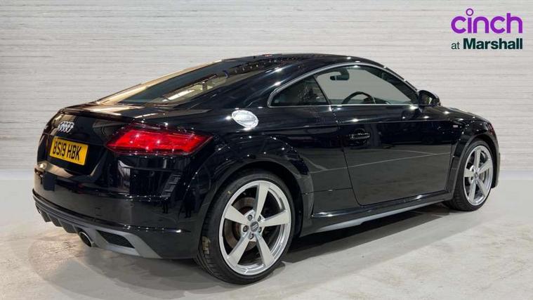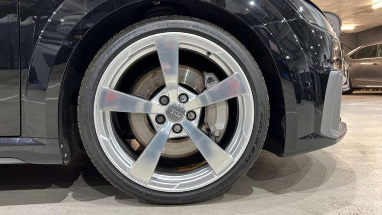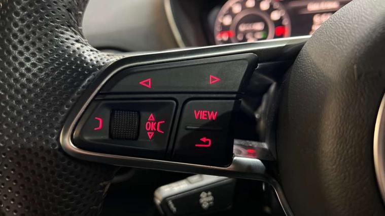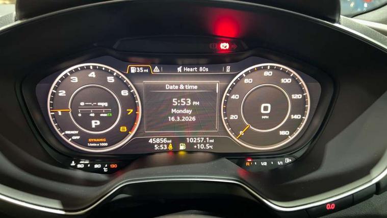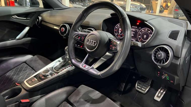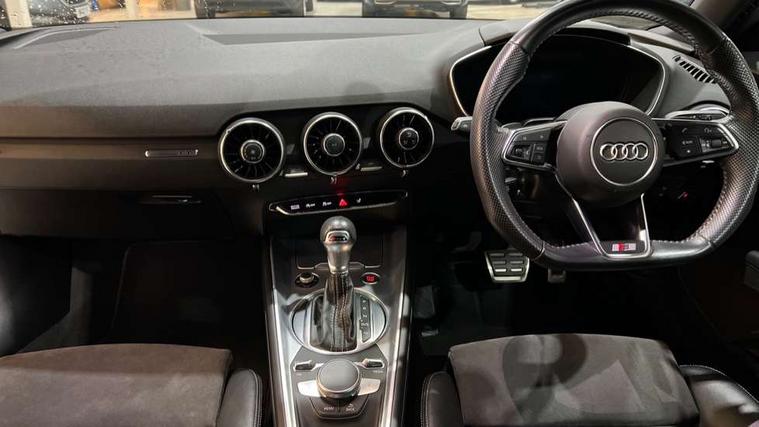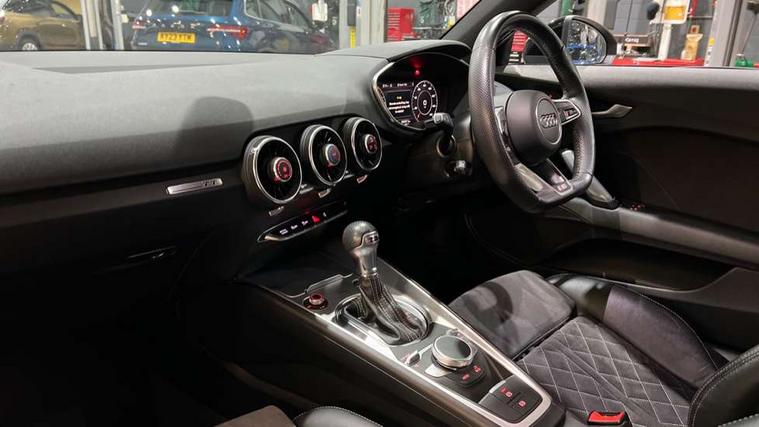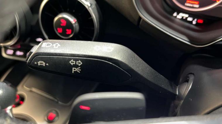 Audi active lane assist, Audi drive select with 4 Pre configured modes, Audi virtual cockpit - 12.3" high-resolution LCD display with fully customisable instrument cluster, Cruise control + speed limiter, MMI touch panel, Mobile phone preparation with bluetooth interface, Progressive power assisted steering, Service interval indicator, Start/Stop system with energy recuperation, TP memo, S line sports suspension, AM/FM radio, Audi music interface, Bluetooth audio streaming, DAB Digital radio, MMI Radio with CD player and SD/XC card slot, Auto dimming rear view mirror, Auto headlight range control, Body colour bumpers, Body colour electrically adjustable and heated door mirrors with built in LED side indicators, Dynamic rear indicators, Electric folding door mirrors, Electric front windows, Front fog lights, Green tinted heat insulating glass, Headlight wash system, High gloss black radiator grille, LED daytime running lights, LED headlights with LED rear lights + dynamic rear indicators, Light and rain sensors, Retractable rear boot spoiler, S line badges on front wings, S Line body styling, S Line front and rear bumpers, S line rear diffuser with platinum grey insert, S line sill plates, Sunband for windscreen, 12V socket, 3 spoke flat bottomed high multi-function leather sport steering wheel with gearshift paddles, 4 way electric lumbar support for driver and front passenger, Air conditioning, Black headlining, Door sill trims with S line logo, Extended aluminium look with stainless steel pedals, Front centre armrest, Front super sports seats, Heated front seats, Height adjustable driver's seat, Height adjustable front head restraints, Height/reach adjust steering wheel, ISOFIX child seat mounting for front passenger seat with airbag deactivation, Perforated leather gearknob, Rear head restraints, Rear top tether child seat ISOFIX attachment, S Line badge on steering wheel, Split folding rear seat, Top tether anchor plate for isofix child seat, Non smoking pack - TT/TT RS, 3 point front seat belts, ABS, ASR traction control, Brake energy regeneration, Curtain airbags, Driver and front passenger airbag with front passenger airbag deactivation, EDL traction control, Electromechanical parking brake, ESP, First aid kit, Front side airbags, Head airbags, Hill hold assist, Seatbelt warning, Tyre pressure warning, Warning triangle, Anti theft alarm, Anti theft wheel bolts, Immobiliser, Keyless Go, Remote central locking, Matt brushed aluminium inlays, Tool kit, Tyre repair kit,