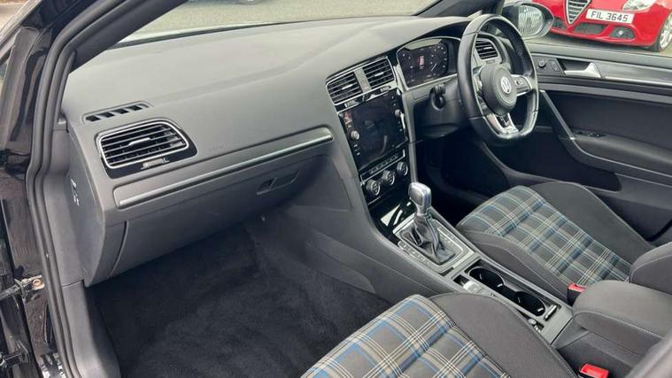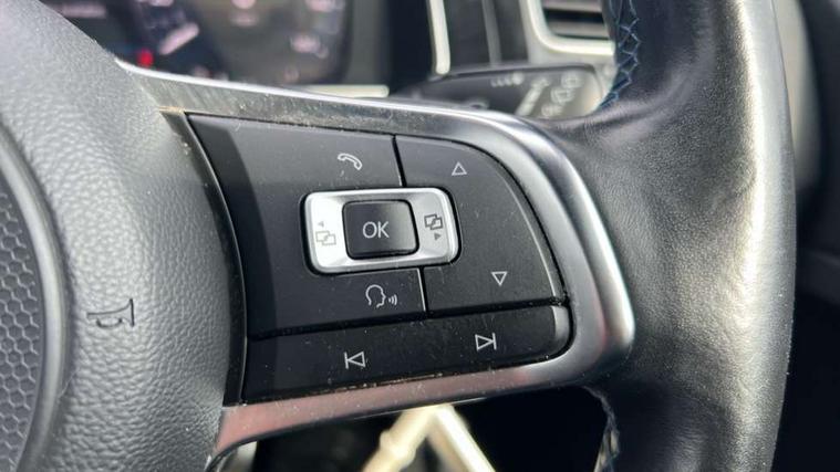 App-Connect, 'Lights On' Reminder warning buzzer, 8" touch screen, Adaptive Cruise Control with pedestrian detection and speed limiter, Bluetooth hands free telephone connection, Brake pad wear indicator warning light, Driver alert system, Driver profile selection, Exterior temperature gauge, Front assistant collision mitigation, Instrument cluster in white, Multifunction computer, PAS - speed related, Rev counter, Trip and service interval display, Ultrasonic front and rear optical and audible parking sensors, Warning buzzer and light for front seatbelts unfastened, XDS electronic differential lock, CD/MP3/WMA, USB and SD card reader, aux-in, Composition media system, DAB Digital radio, 3D-LED-SBBR with sweeping indicator, Auto dimming rear view mirror, Automatic coming/leaving home lighting function, Automatic headlights, Black front air intake and radiator grille with chrome insert, Black rear diffuser, Body colour bumpers, Body colour door handles, Body colour door mirrors, Chrome grille surround, Electric front windows, Electric rear windows, Electrically adjustable and heated door mirrors, Heated rear windscreen, LED daytime running lights, LED rear lights, Rain sensor, Rear roof spoiler, Rear windscreen washer and wiper with interval delay, Side skirts, Twin exhaust tailpipe, 12V socket in luggage compartment, 3 rear headrests, 3 spoke steering wheel, 60/40 split folding rear seat, Air conditioning - 2 zone electronic climate control, Aluminium/leather gear knob, Bag hook in luggage compartment, Black headlining, Boot lashing points, Cooled glovebox, Courtesy light delay, Cover for storage compartment in centre, Dust/pollen filter, Front + rear carpet mats, Front centre armrest with storage box and rear air vents, Front passenger drawer stowage, Front passenger seat height adjust, Front seat back storage pockets, Gearshift paddles, Grab handles, Height adjustable driver's seat, Height/reach adjust steering wheel, Illuminated vanity mirrors, Isofix preparation for 2 rear child seats, Load through provision with rear centre armrest and cupholders x2, Luggage compartment cover, Luggage compartment lighting, Multifunction leather steering wheel with blue stitching, Overhead storage box, Stainless steel pedals, Storage box in luggage compartment, Storage compartments in doors, Sun visors, Ambient lighting pack - Golf, Mirror pack - Golf, 3 point height adj front seatbelts + pretensioners, 3 rear 3 point seatbelts, ABS, Automatic post collision braking, Blue brake callipers, Child locks on rear doors, Driver/Front Passenger airbags, Driver/Passenger whiplash optimised head restraints, Drivers knee airbag, Electronic parking brake with auto hold, ESP with EDL + ASR, Front and rear curtain airbags, Front passenger airbag deactivation, Front side airbags, Pre crash system, Tyre pressure monitor, Alarm with interior protection, Electronic engine immobiliser, Remote central locking with 2 remote folding keys, Chrome-plated light switch surround, Honeycomb black decorative inserts, Piano black centre console, 18" Marseille alloy wheels, Tyre repair kit,