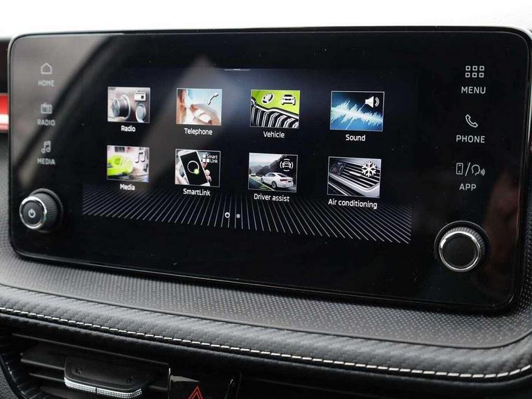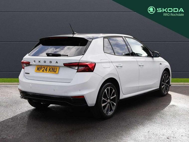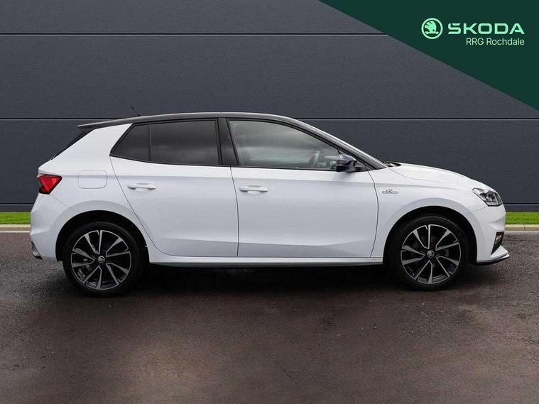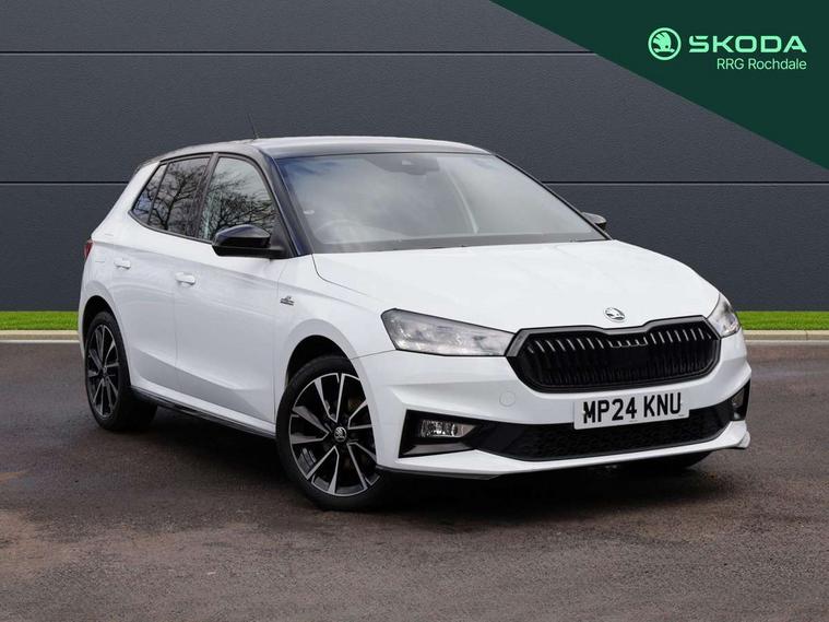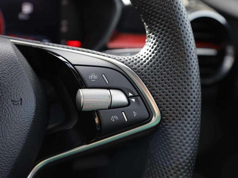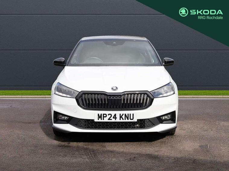Advanced driver attention and drowsiness monitor, Bluetooth connection, Electromechanical power steering, Exterior temperature gauge, Service interval indicator, Traffic sign recognition, Virtual cockpit with 10.25" colour display, Wireless SmartLink for Apple CarPlay and Android Auto, 6 Speakers (4 in front and 2 in rear), Auxiliary socket for external MP3 player, DAB digital radio reception, Auto dimming rear view mirror, Black radiator grille, Body coloured bumpers, Door mirror integrated indicators, Front and rear electric windows, Front window wiper intermittent control, Headlight range control - Automatic, Ice scraper in fuel cap, LED daytime running lights with coming and leaving home feature, LED rear lights, Monte Carlo badging, Privacy glass, Rear LED fog light, Rear side wing doors, Rear window wiper with washing nozzles, Roof mounted spoiler, SKODA tailgate lettering in black, Sports bumpers, Third brake light, 2 reading lights in front and 2 reading lights in rear, 3 rear headrests, Aluminium pedals, Backrest split and folding, Black headlining, Central console with removable cup holder and storage box, Chrome handbrake release button, Door sills with fabia badging, Dual zone air conditioning with climatronic electronic control, Fabric/artificial leather upholstery, Front centre armrest, Front sports seats, Gearshift knob/handle in leather, Hand brake lever handle in leather, Height adjustable front headrests, Height adjustable front seats, Height adjustable steering wheel, ISOFIX and TopTether anchorage points to the outer rear seats, ISOFIX and TopTether on the front passenger seat, Luggage compartment lighting, Manually adjustable lumbar support in front seats, Metallic painted red central console cover, Metallic red interior door handles, Pollen filter, Rear seat bench unsplit, Single front passenger seat, Sun visors with mirror and airbag label on passenger side, Textile floor mats, Ticket holder, Umbrella in drivers door, 3-point height adjustable front seats belts with pretensioner and force limiter, Automatic warning lights in case of crash, Driver and passengers airbag with switch off function, e-Call+, ESC including ABS, MSR, ASR, EDS, HBA and XDS, Front and rear seat belt warning, FRONT ASSIST (AEB City and AEB Inter Urban), Front side airbags, Head airbags, Hill hold control, One tone horn, Pedestrian protection, Three rear 3-points safety seat belts with pretensioner and force limiter including stop function for outer rear seat belts, Tyre pressure monitoring system, Anti-theft alarm system including immobiliser, interior monitoring, backup horn, and towing protection, Central locking with radio remote control, interior controls, SAFE function and 2 foldable keys, Carbon effect door and side trim panels, Carbon effect lower decorative trim with white stitching, Monte carlo air vents, Red metallic upper decorative trim, Anti-theft wheel bolts protection, Super-low rolling resistance tyres,