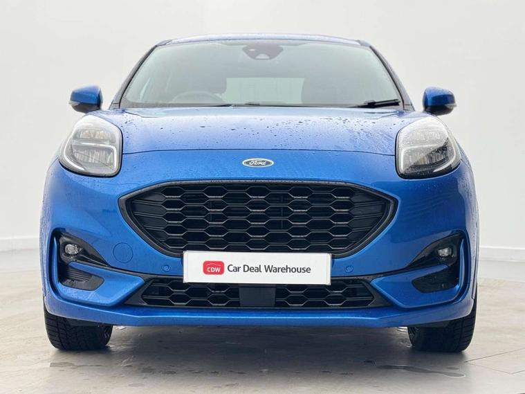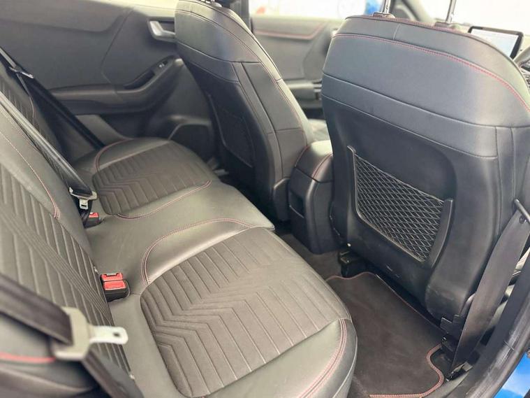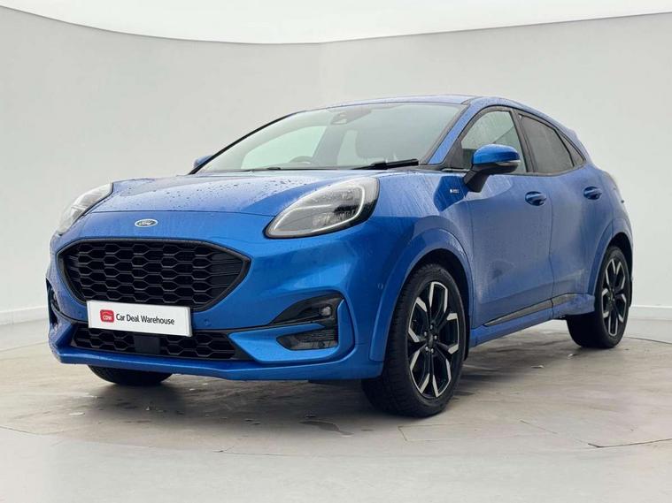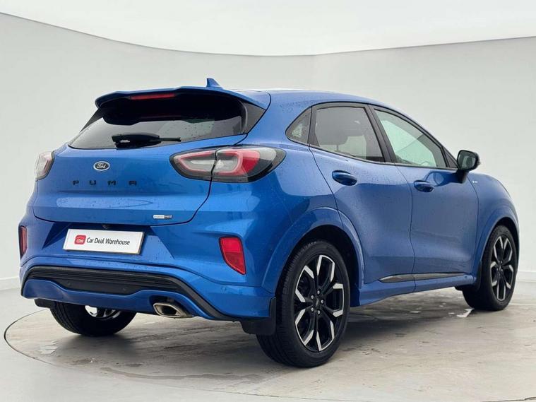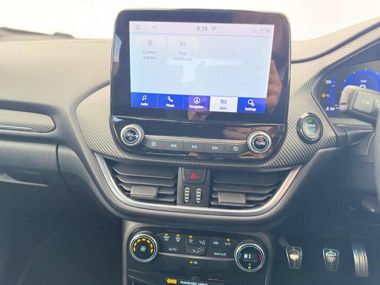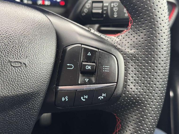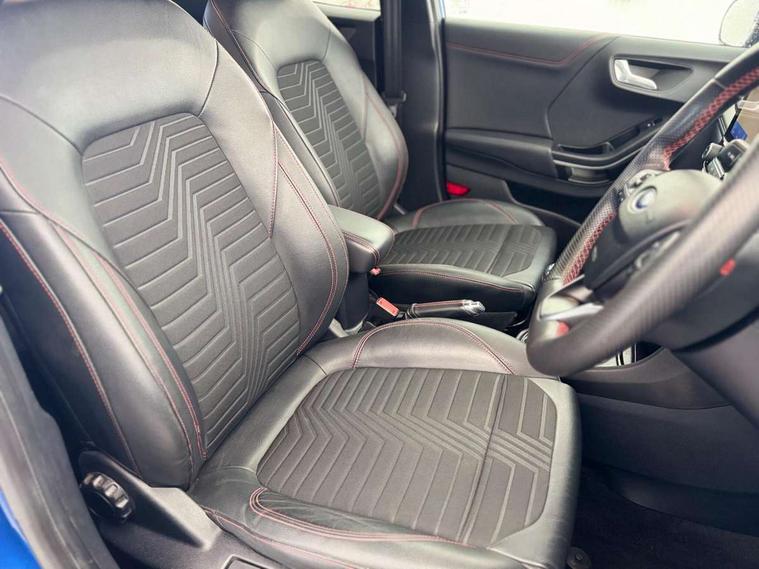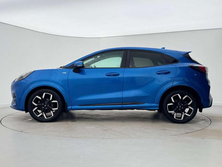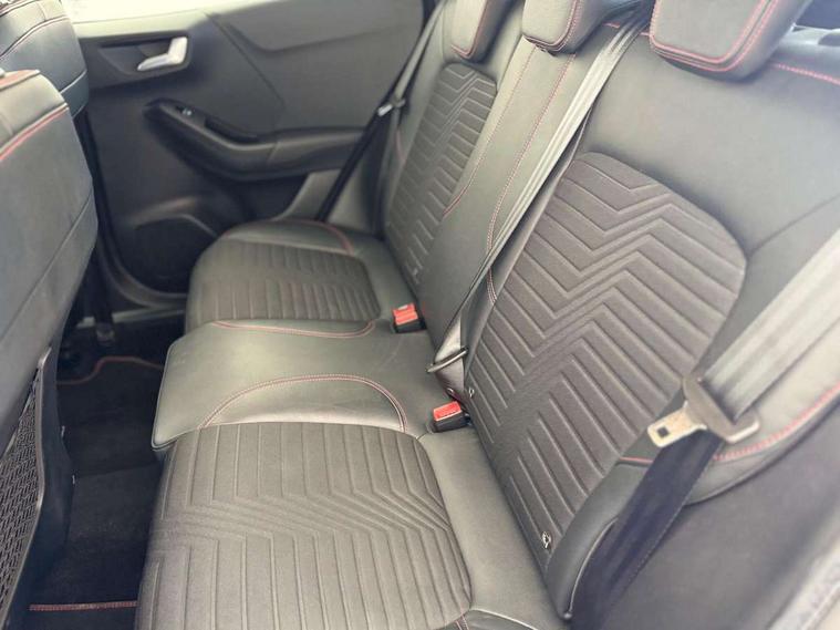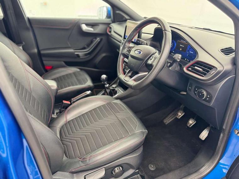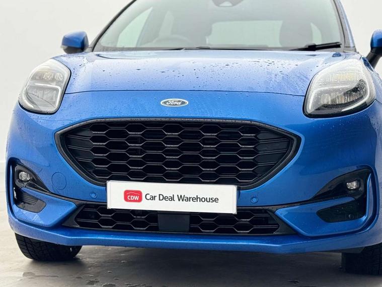 Ford easy fuel, Full digital 12.3" instrument cluster, Lane keeping aid with lane departure warning, Power assist steering, Power liftgate hands free including keyless start + entry, motion sensing key fob, Rear parking sensor, Selectable drive modes(Normal, sport, Eco, trail, slippery), Wireless charging pad, Automatic headlights with rain sensing wipers and auto high beam, Body coloured door mirrors, Fixed LED headlamps, Front fog lights with cornering lights and LED rear lamps, Power foldable heated door mirrors with puddle lamps, Privacy glass to side rear windows and tailgate glass, Quickclear heated windscreen, ST-Line body kit with large rear spoiler wth sports suspension, Alloy sports pedals, Casual partial leather upholstery with salerno bolster, Centre console with armrest and stowage, Driver and passenger seat lumbar and height adjust, EATC - Electronic Auto Temperature control, Ford megabox extended bootspace, Front and rear floor mats, Front and rear head restraints, ST-Line flat bottomed sensico leather steering wheel with leather handbrake and aluminium gear knob, B&O Premium Audio system + Ford SYNC 3 navigation pack - Puma, Driver assistance pack - Puma, 3 rear seatbelts, Electronic stability control (ESC) and hill start assist, Pre-collision assist with autonomous emergency braking, pedestrian/cyclist detection & post-collision braking, Tyre pressure monitoring system (TPMS), Thatcham alarm, Carbon look interior deco spears, 18" 5 spoke matt black machined finish alloy wheels, Tyre inflation kit,