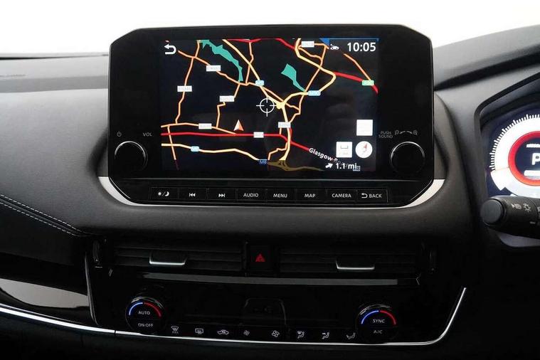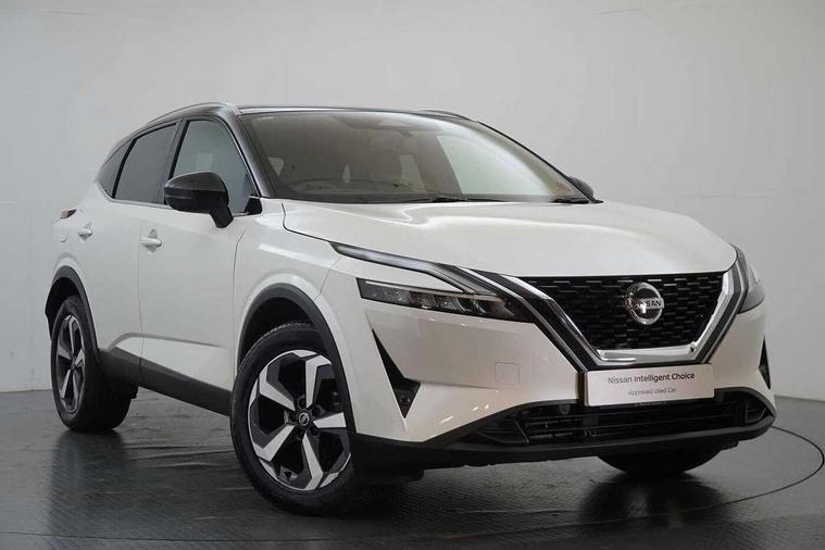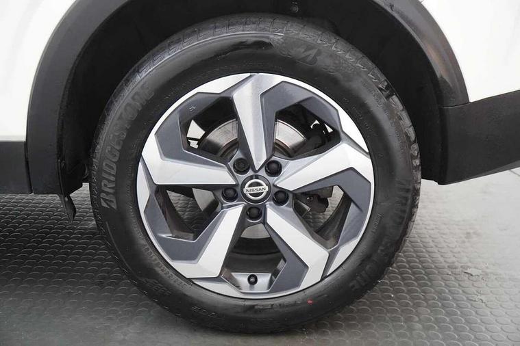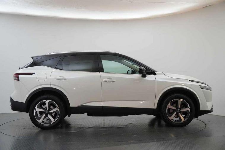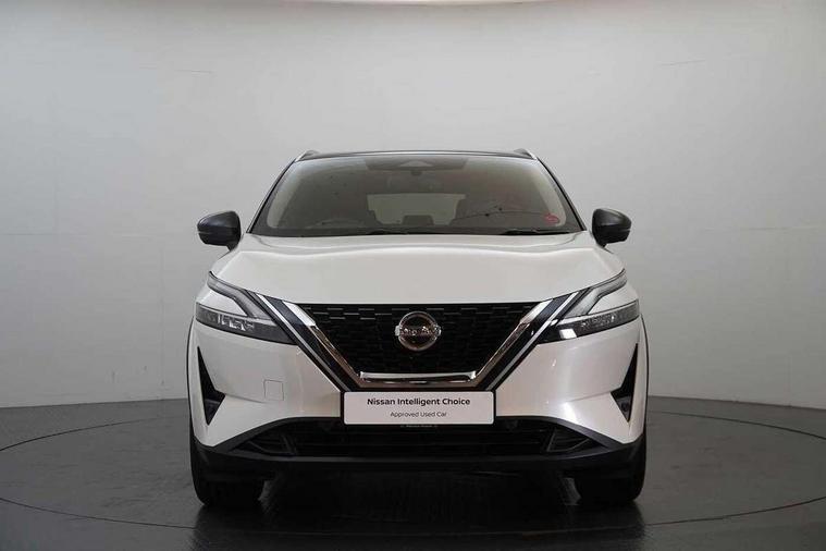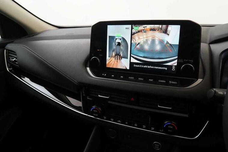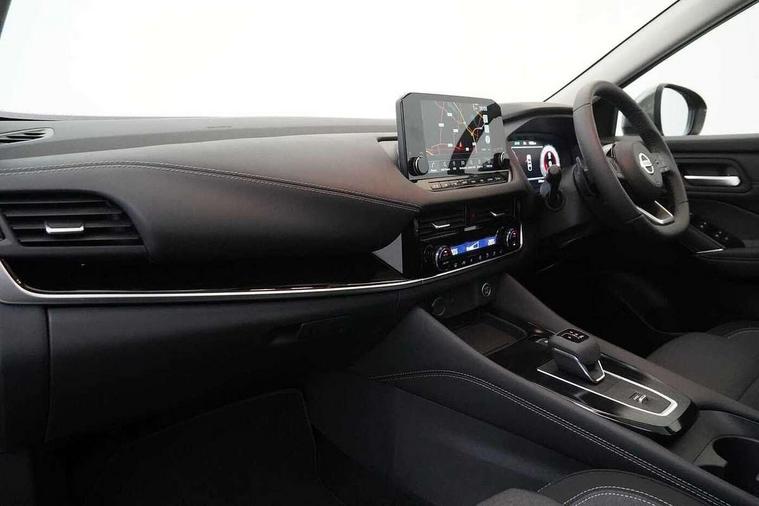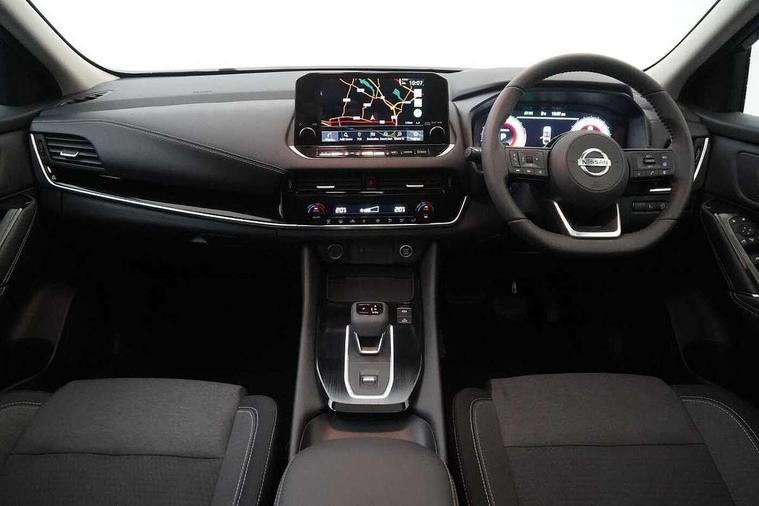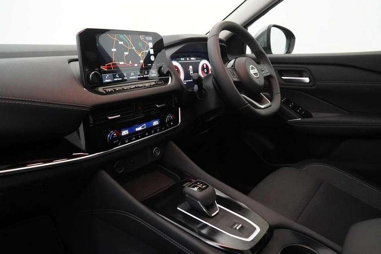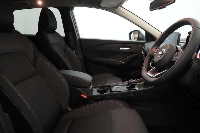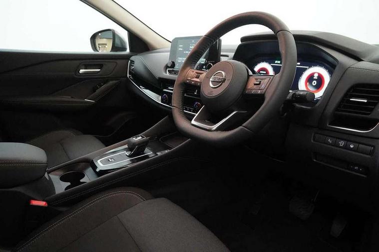 Blind spot warning, Drive modes (sport, normal, eco), Electric speed sensitive power steering, Emergency and breakdown call, Front and rear parking sensors, Full Digital 12.3" TFT Digital Combimeter, Idle stop/start system, Intelligent Cruise control (ICC), Intelligent driver alert system, Intelligent forward collision warning, Intelligent lane intervention, Lane departure prevention, Lane departure warning system, Moving object detection, Push button starter, Rear cross traffic alert, Traffic sign recognition with legal speed adjustment, Trip computer, 6 speakers, AM/FM audio system with DAB, Bluetooth audio streaming, Front USB connections (Type-A and Type-C), Rear USB charging only ports (Type-A and Type-C), 3rd brake light, Auto dimming rear view mirror, Auto rear wiper when reversing, Body colour mirror caps, Body coloured door handles, Bodyside mouldings, Chrome side window finisher, Electric auto folding door mirrors, Electrically adjustable and heated door mirrors with LED turn indicator, Fixed panoramic glass roof with electric sunshade, Follow me home headlights, High beam assist, Intelligent auto headlights, LED daytime running lights, LED rear lights, One touch front and rear electric windows with remote opening and closing, Partially body coloured bumpers, Privacy glass, Rain sensor, Rear roof spoiler, Rear side wing doors, Rear styling plate, Roof rails, Shark fin antenna, Splash free rain sensing wipers, Super UV and infrared cut glass, Three blink turn signal, 12v power socket in dashboard and luggage, 2 way electrical driver lumbar adjustment, 2x Rear coat hooks, 3 bench rear seats in 2nd row, 3 rear headrests, 4 grab handles, 6 Luggage hooks - 4 on floor, 2 on side, 60/40 split folding rear seat bench, Ambient lighting around centre console, Centre console storage tray, Chrome interior door handles, Cloth monoform upholstery, Driver and front passenger sunvisors with illuminated vanity mirrors, Driver seat back pocket, Dual zone automatic climate control with pollen filter, Front centre console and armrest, Front cupholder, Front door with bottle holders, Glovebox with light, Hard trunk cover, Height adjustable driver's seat, Height adjustable front headrests, Leather steering wheel, Luggage board system, Luggage space lighting, Manually adjustable passenger (slide recline + lifter), Multifunction steering wheel, Passenger seat back pocket, Rear armrest with 2 cupholders, Rear door bottle holders, Single front passenger seat, Soft PVC kneepad, Steering wheel gearshift paddles, Steering wheel switches, Tilt/telescopic adjustable steering wheel, Two rear isofix child seat anchorage points with top tether, Welcome light and console tray ambient lighting, Connectivity Pack - Qashqai, Tech Pack (ProPILOT + HUD), 3x3 point rear seatbelt pretensioners + load limiters, ABS, ESP, EBD and brake assist, Active brake limited slip, Auto hold function, Child locks on rear doors, Curtain and front side, far side airbags, Driver and passenger airbags, Driver, passenger and 2nd row rear seat belt reminder, Electronic parking brake, Front seatbelt pretensioners + load limiters, Height adjustable front seatbelts, Hill start assist, Intelligent blind spot intervention, Intelligent front emergency braking with pedestrian, cyclist recognition and junction assist, Intelligent rear automatic braking, Tyre pressure monitoring system, Vehicle dynamic control, Capless fuel filler, Engine immobiliser, Nissan i-key, Remote central door locking with deadlocking, Thatcham Cat.1 alarm, 18" diamond cut alloy wheels,