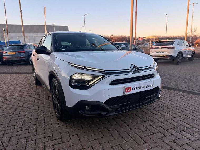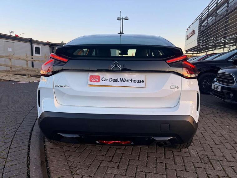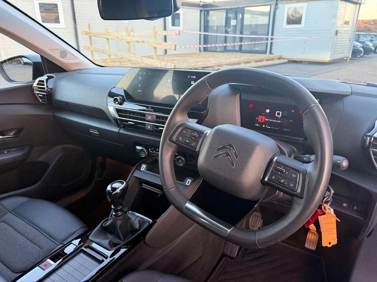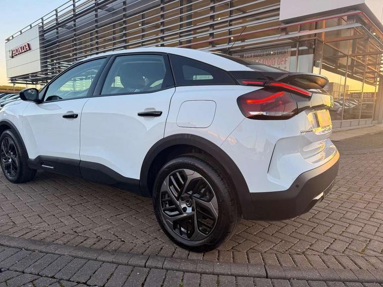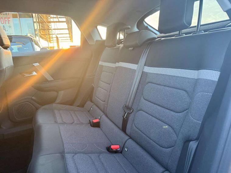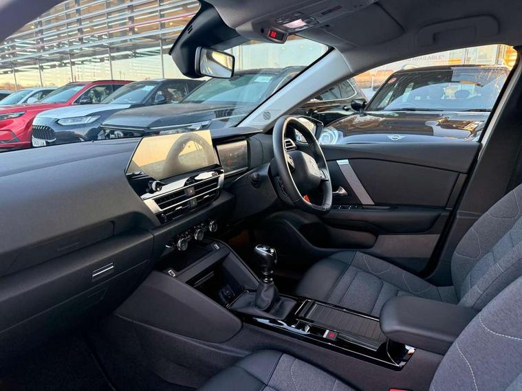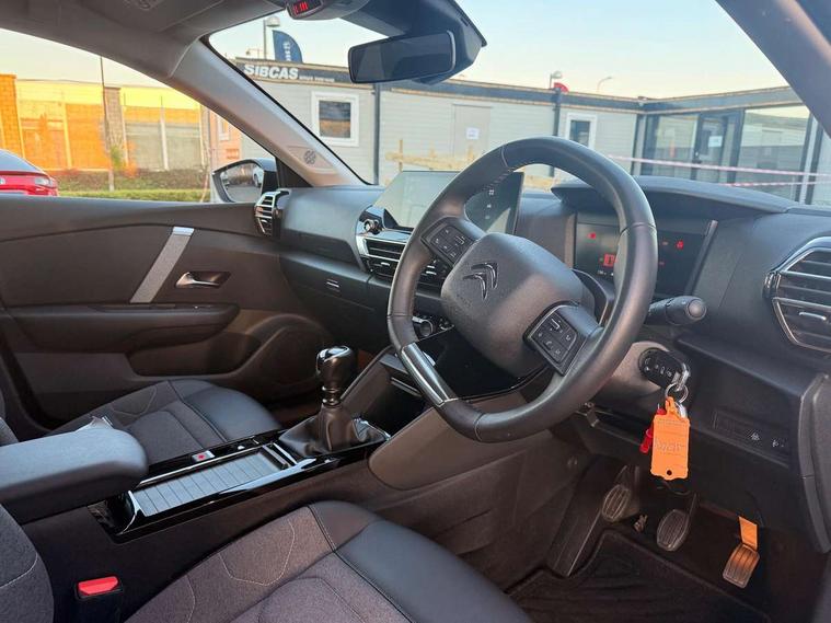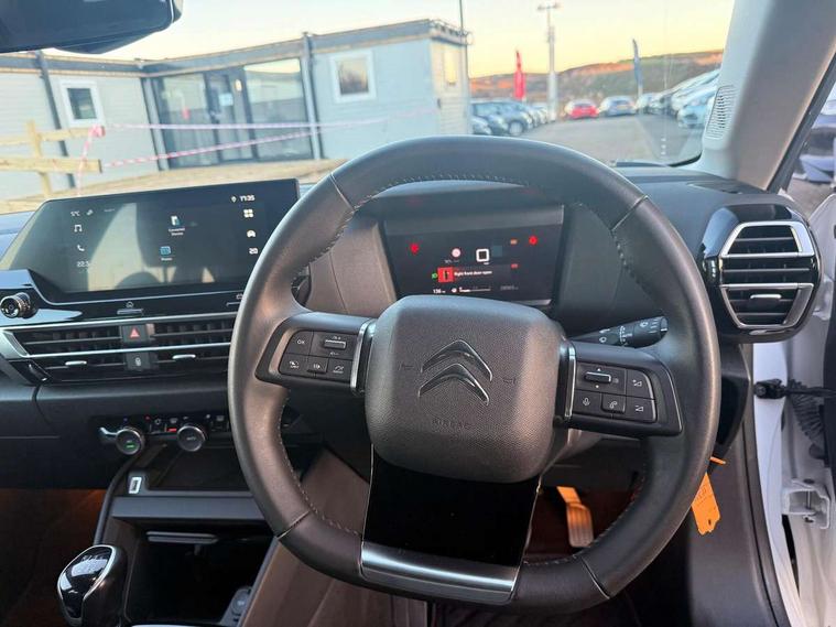 10" touchscreen user interface, controlling media, connectivity and vehicle settings, 5.5 inch backlit full TFT driver's instrument cluster, Apple car play and Android auto, Citroen connect box emergency and assistance system, Cruise control + speed limiter, Electronic Power Steering (EPS), In-crash braking, Rear parking sensors, Tailgate, Voice commands, Advanced comfort suspension - double hydraulic stops on front suspension and single on rear suspension, 6 speakers, Auxiliary input socket, Bluetooth telephone and audio streaming, DAB Digital radio, 3rd brake light, Automatic headlights, Body colour bumpers, Boot spoiler, Electrically heated and adjustable external rear view mirrors, Front and rear electric windows, Gloss black painted external rear view mirrors and black exterior door handles, Gloss black rear skirt, LED daytime running lights in V signature, LED front fog lamps with static cornering function, LED front headlamps, Rain sensing automatic front windscreen wipers, Rear side wing doors, Rear wiper, Roof aerial, Standard interior rear-view mirror with manual day-night switching, Tinted side windows with matt black detail, Welcome and goodbye lighting, 12V power outlet and USB Type-C socket for charging and data connection at 1st row, 3 rear headrests, 3 seat bench in 2nd row, Boot light, Chevrons cloth and leather effect textile seat upholstery, Dashboard tray in front cabin, Driver and passenger sun visors with vanity mirror, Dual zone automatic air conditioning, Front and rear interior lamps, Front head restraints, Grained leather steering wheel with two command blocks, Height adjustable driver's seat with adjustable lumbar support, Height adjustable front passenger seat, Height and reach adjustable steering wheel, Map pockets in rear of front seats, Raised centre console with armrest and two cup holders, Single front passenger seat, Single position boot floor, Split folding rear seats, Gloss black pack - C4/C4 X/e-C4 X, High level acoustic insulation pack - C4/C4 X/e-C4 X, 3x3 point rear seatbelts, ABS, Driver and front passenger airbags, Electric parking brake, ESP, Front seatbelt pretensioners, Hill start assist, Manual child lock in second row, Manual deactivation of front passenger airbag, Post collision safety brake, Row 1 and 2 curtain airbags, Row 1 side thorax airbags, Seatbelt unfastened on the move warning, Tyre underinflation detection, Immobiliser, Remote locking with deadlocks, Two remote keys, 18" Bi-tone painted aeroblade alloy wheels with anti-theft locking wheel nuts, Puncture repair kit with compressor,