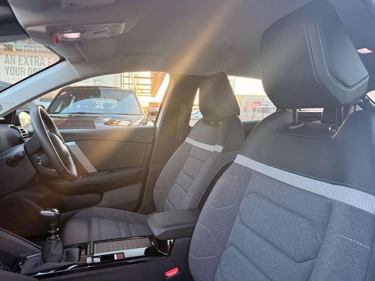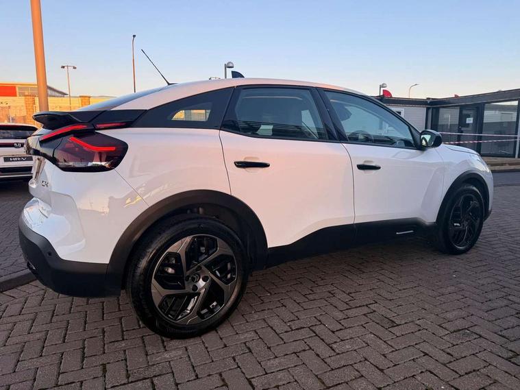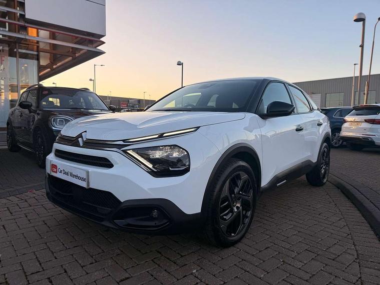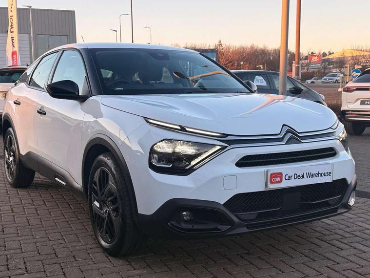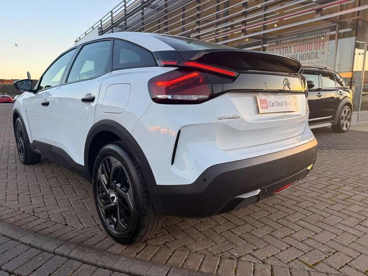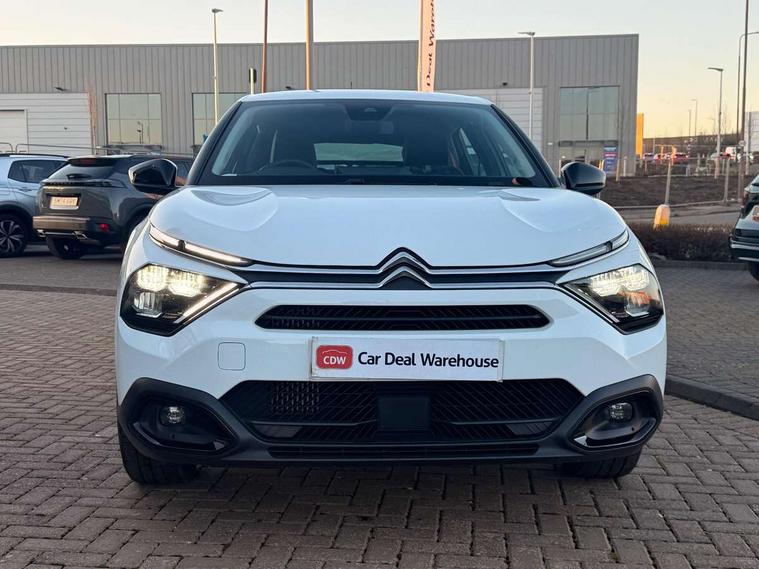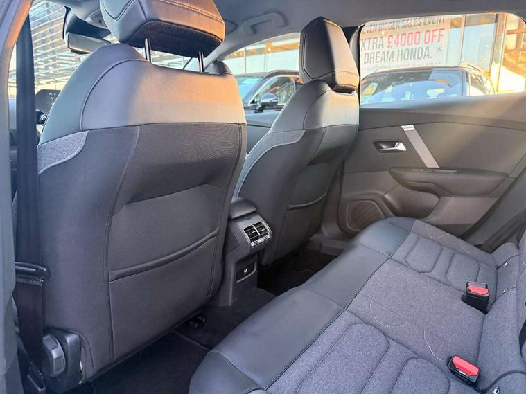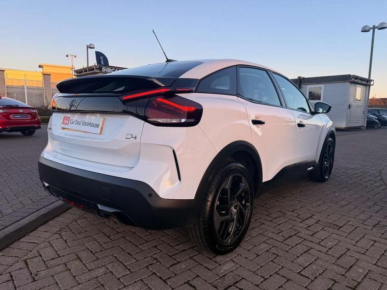 10" touchscreen user interface, controlling media, connectivity and vehicle settings, 5.5 inch backlit full TFT driver's instrument cluster, Apple car play and Android auto, Citroen connect box emergency and assistance system, Cruise control + speed limiter, Electronic Power Steering (EPS), In-crash braking, Rear parking sensors, Tailgate, Voice commands, Advanced comfort suspension - double hydraulic stops on front suspension and single on rear suspension, 6 speakers, Auxiliary input socket, Bluetooth telephone and audio streaming, DAB Digital radio, 3rd brake light, Automatic headlights, Body colour bumpers, Boot spoiler, Electrically heated and adjustable external rear view mirrors, Front and rear electric windows, Gloss black painted external rear view mirrors and black exterior door handles, Gloss black rear skirt, LED daytime running lights in V signature, LED front fog lamps with static cornering function, LED front headlamps, Rain sensing automatic front windscreen wipers, Rear side wing doors, Rear wiper, Roof aerial, Standard interior rear-view mirror with manual day-night switching, Tinted side windows with matt black detail, Welcome and goodbye lighting, 12V power outlet and USB Type-C socket for charging and data connection at 1st row, 3 rear headrests, 3 seat bench in 2nd row, Boot light, Chevrons cloth and leather effect textile seat upholstery, Dashboard tray in front cabin, Driver and passenger sun visors with vanity mirror, Dual zone automatic air conditioning, Front and rear interior lamps, Front head restraints, Grained leather steering wheel with two command blocks, Height adjustable driver's seat with adjustable lumbar support, Height adjustable front passenger seat, Height and reach adjustable steering wheel, Map pockets in rear of front seats, Raised centre console with armrest and two cup holders, Single front passenger seat, Single position boot floor, Split folding rear seats, Gloss black pack - C4/C4 X/e-C4 X, High level acoustic insulation pack - C4/C4 X/e-C4 X, 3x3 point rear seatbelts, ABS, Driver and front passenger airbags, Electric parking brake, ESP, Front seatbelt pretensioners, Hill start assist, Manual child lock in second row, Manual deactivation of front passenger airbag, Post collision safety brake, Row 1 and 2 curtain airbags, Row 1 side thorax airbags, Seatbelt unfastened on the move warning, Tyre underinflation detection, Immobiliser, Remote locking with deadlocks, Two remote keys, 18" Bi-tone painted aeroblade alloy wheels with anti-theft locking wheel nuts, Puncture repair kit with compressor,