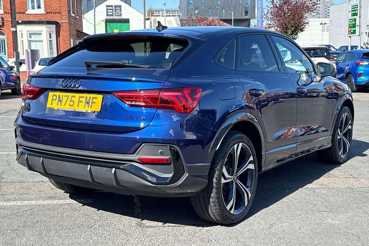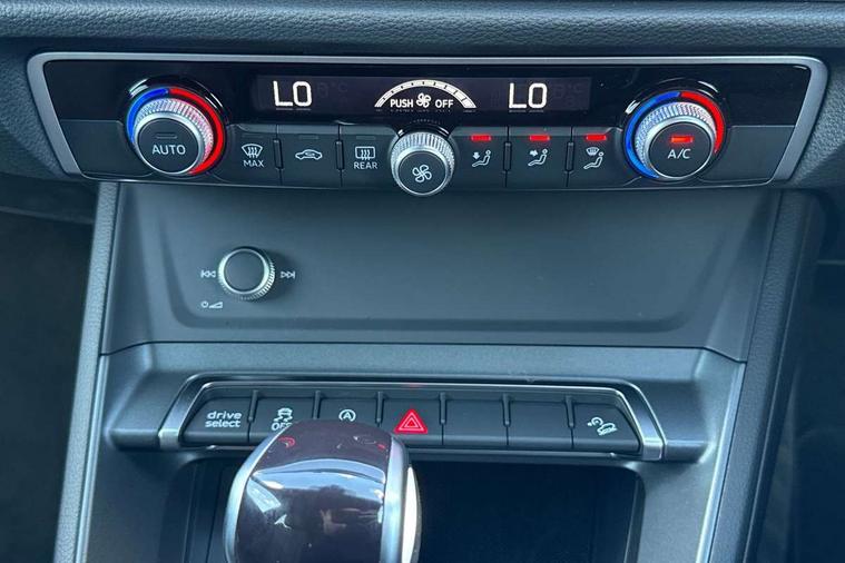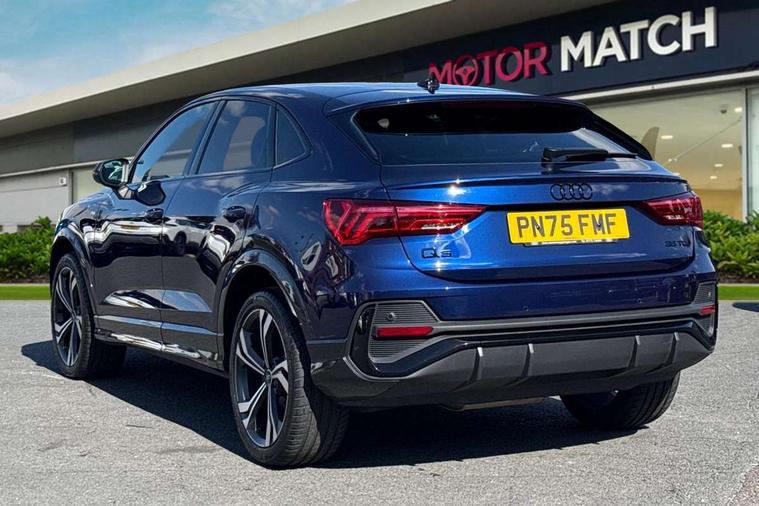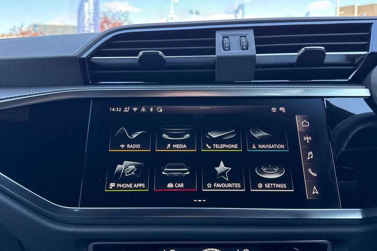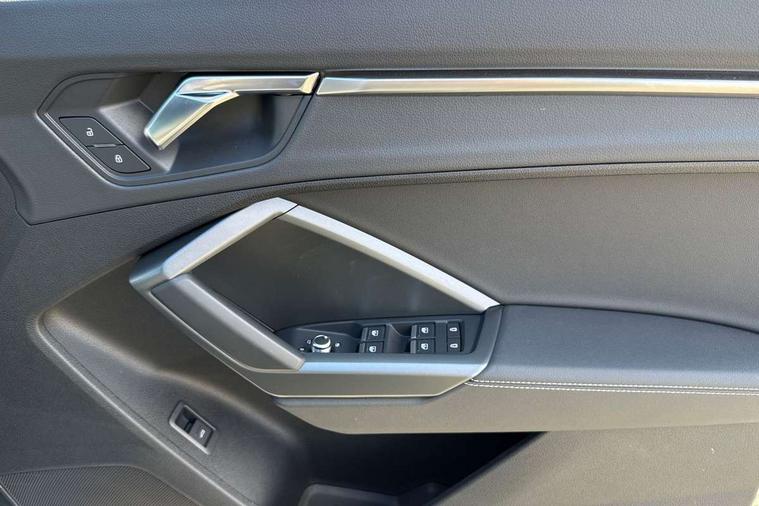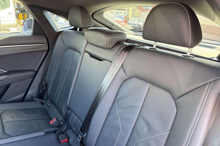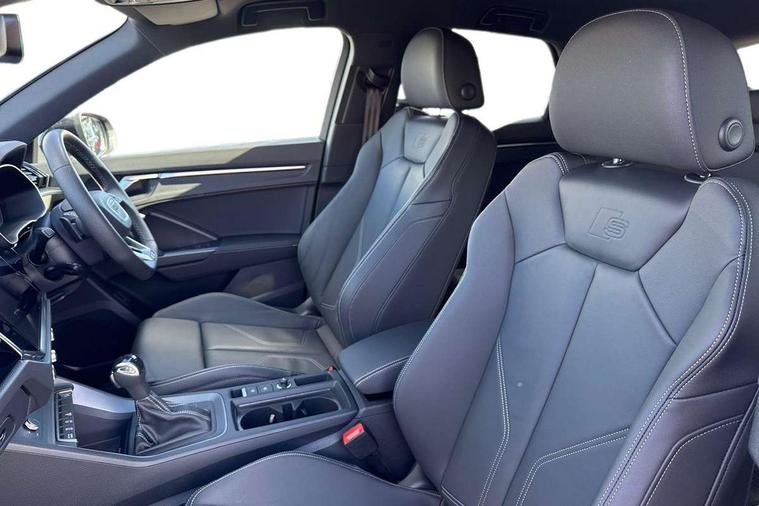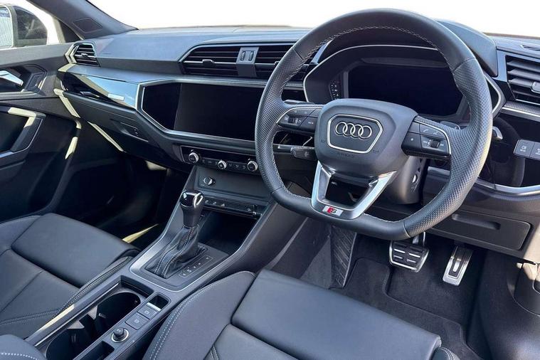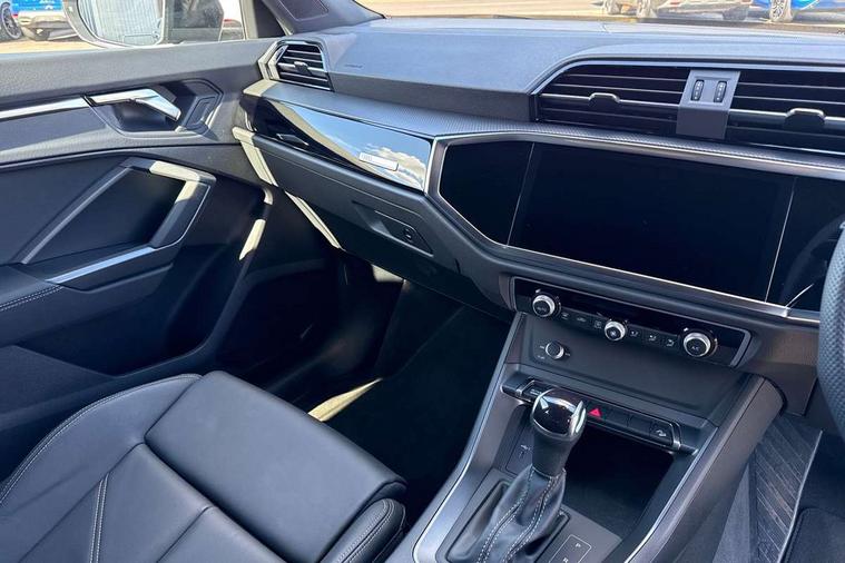 Audi connect safety and service, Audi drive select, Audi lane departure warning, Audi Virtual Cockpit - 10.25" display, Bluetooth interface, Camera based traffic sign recognition, Distraction and Fatigue warning, Legal emergency call, MMI Navigation Plus with high resolution 10.1 inch touchscreen colour display, Power operated tailgate, Progressive steering, Service interval indicator, Smartphone interface includes wireless Apple carplay/Android Auto, Start stop system with recuperation, Voice control system with natural language interaction, Diesel particulate filter, Sports suspension, 2 USB-C ports with charge and data functions, 6 passive loudspeakers, DAB digital radio module, Acoustic windscreen, Audi Beam uses LEDs to project the Audi logo onto the ground as you exit your Q3, Auto dimming door mirrors, Auto dimming frameless rear view mirror, Electrically folding, adjustable and heated door mirrors with integrated LED side indicators and kerb view function for passenger side, Front and rear electric windows, Front fog lights, Front underbody protection in manhattan grey paint finish, High gloss black finish B and C pillars, Honeycomb design radiator grille in matt anthracite black, LED Dynamic rear indicators, LED headlights with LED daytime running lights, LED rear lights, LED third brake light, Privacy glass dark tinted rear and rear-side windows (from B-pillar backwards), Rain and light sensors, Rear diffuser grille in grained matt black, Rear diffuser strip in matt anthracite black, Rear side wing doors, Rear underbody protection in matt black, Rear wiper, S line front and rear bumpers and side skirts in contrasting Manhattan grey paint finish, Variable front intermittent wipers, 12V socket in rear centre console, 3 seat bench in 2nd row, 40:20:40 folding with manual adjustment for 60:40 forwards/backwards position and backrest angle, Adjustable rear seat bench/backrest with centre armrest and cupholder, Black carpet mats, Black cloth headlining, Dual zone electronic climate control, Electric lumbar support, Front and rear black floor mats with contrast stitching in rock grey, Front and rear headrests, Front centre armrest, Height and reach adjustable steering wheel, Illuminated door sill trims with S logo, ISOFIX child seat mounting for front passenger with airbag deactivation and outer rear seat including top tether attachment point for outer rear seats, Luggage compartment sill protection in stainless steel, Manual front seats with height adjustment, Perforated leather gearknob, Single front passenger seat, Stainless steel pedals, Twin leather upholstery with front sport seats + S embossing, Black styling pack - Q3, Non smoking pack - Q3, 3x3 point rear seatbelts, 6 airbags - Driver, front passenger, curtain and side windows, Audi pre-sense front with pedestrain and cyclist recognition, Electrically operated child locks on rear doors, Electromechanical parking brake, Electronic stabilisation control including ABS, ASR and EDL, Front seatbelt reminder, Hill descent control, Hill hold assist, Pre sense basic, Seatbelt monitoring, Tyre pressure warning, Warning triangle and first aid kit, Anti theft wheel bolts, Immobiliser, Remote central locking, Thatcham approved category 1 anti theft alarm, Aluminium look interior elements, Detail dashboard around MMI touch colour display in glass look, black with surround in aluminium look, Leatherette door armrest, Piano black inlay,