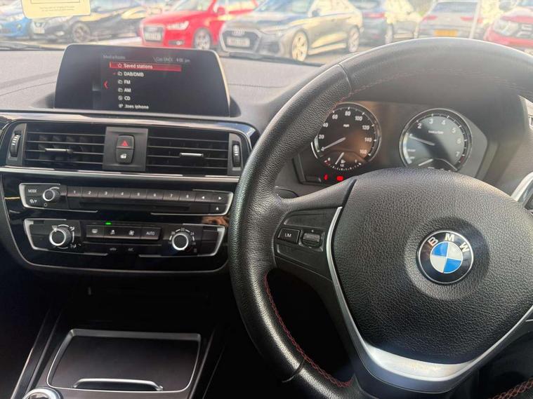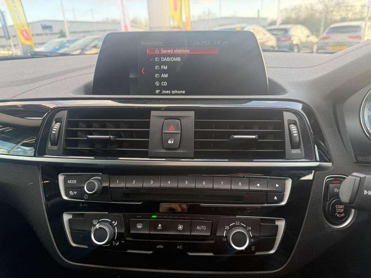 'Lights On' Reminder warning buzzer, BMW Online services, BMW Teleservices, Brake force display, Engine start/stop button, Oil level indicator, On board computer, On board diagnostics, Outside temperature display, Service interval indicator, Speed limiter, Drive Performance Control, Auxiliary point for auxiliary devices, BMW professional radio with CD player, DAB Digital radio, Body colour bumpers, Body colour door handles, Dark chrome exhaust tailpipe, Daytime running lights, Electric front windows + one touch + anti-pinch, Electrically adjustable door mirrors, Follow me home headlights, Green tinted heat insulating glass, Heated door mirrors, Heated windscreen washer jets, High gloss black kidney grille, Rain sensor including auto headlights activation, Rear wash/wipe, Welcome lighting, 12V power socket in centre console, 12V power socket in passenger footwell, 2 grab handles, 60/40 split rear seats, Anthracite Velour floor mats, Door armrests, Folding rear seat head rests, Front door sill finishers in Sport designation, Front folding/sliding centre armrest with storage, Front head restraints, Front sports seats with electric side bolster adjustment, Front/rear courtesy lights with soft on/off dimming, Glovebox, Isofix rear child seat preparation, Leather gear knob and handbrake grip, Load restraint lashing eyes, Multifunction steering wheel with audio controls, Reach + rake adjustable steering column, Storage compartments in doors, ABS/EBD, Automatic Stability Control (ASC), BMW emergency call, Child locks on rear doors, Cornering brake control (CBC), Crash sensor, Driver/Passenger airbags (Impact dependent), Drivers knee airbag, DSC+, Dynamic brake control, Dynamic Traction Control - DTC, Front passenger airbag deactivation, Front side airbags, Hill start assist, ITS head airbags for front/rear, Pyrotechnically pre-tensioned front seatbelts, Seat belt force limiter, Three 3 point rear seatbelts, Tyre pressure monitor, Warning triangle and first aid kit, Automatic drive away locking facility, Electronic immobiliser, Remote central locking, Thatcham Cat.1 alarm, Run flat tyres,
