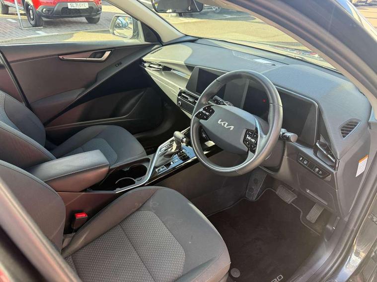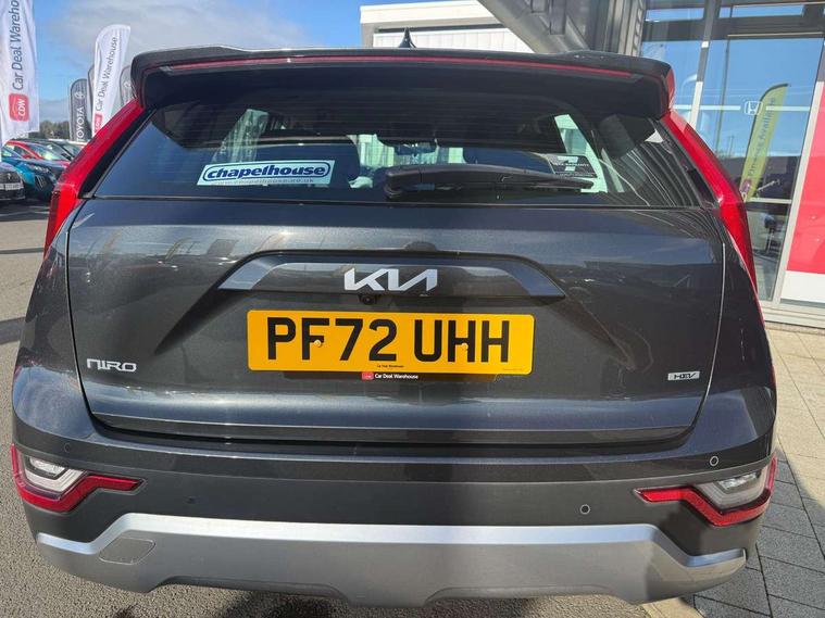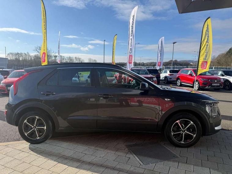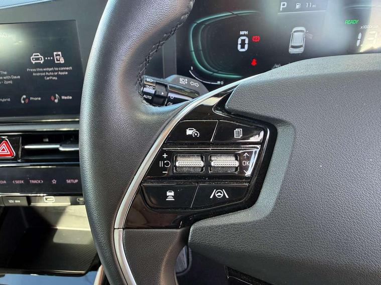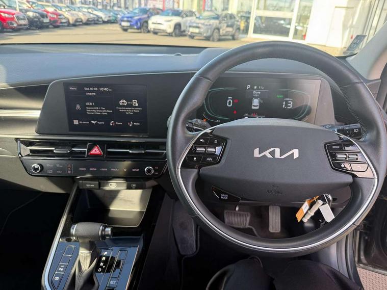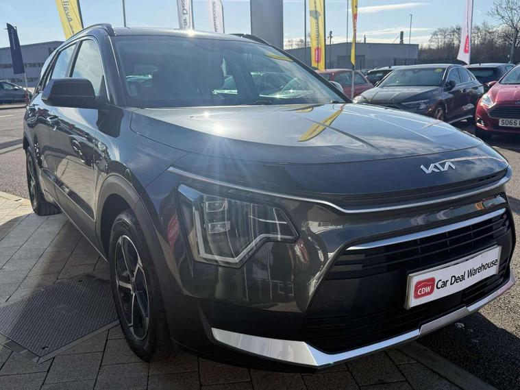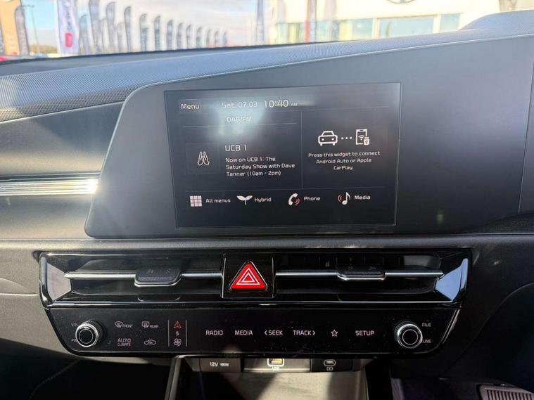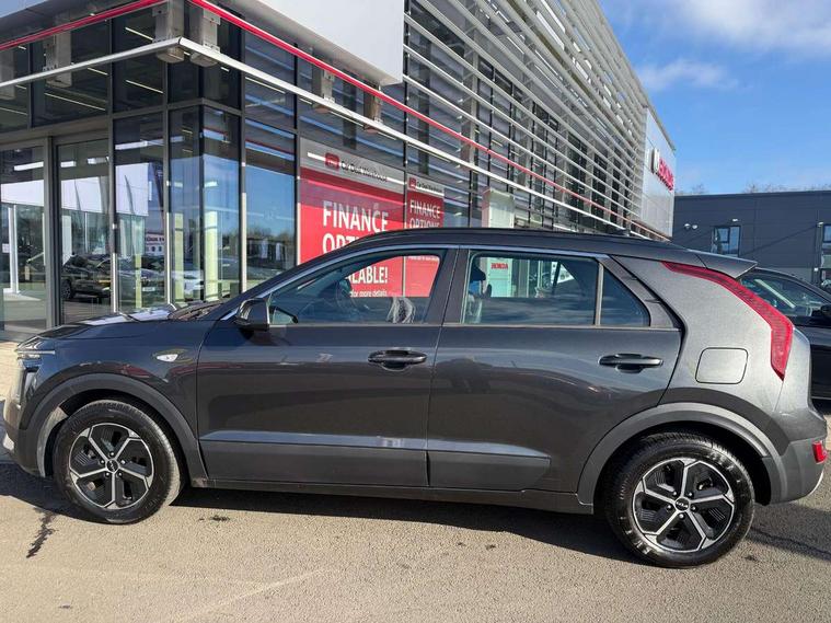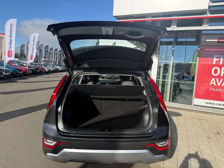 4.2" supervision colour cluster display, 8" touch screen, Adaptive smart cruise control function (SCC) with stop and go, Apple car play/Android Auto with voice control, Drive mode select (Eco, sport), E-call, Emergency stop signalling system, Forward Collision-Avoidance Assist (FCA) 1.5 - City/Pedestrian/Cyclist/Junction turning, Lane Following Assist (LFA), Lane keep assist, Motor driven power steering, Rear parking sensors, Reversing camera with dynamic guide lines, Speed limit assist, Tailgate, Trip computer with distance/fuel consumption/average speed, Sports H-Matic Automatic, 'Shark fin' mobile antenna, 2 type C USB ports on front seats, 2 USB ports in centre console including 1 type C, 6 speakers, Bluetooth with music streaming, DAB Digital radio, Steering wheel mounted controls, Acoustic windshield, All round electric windows with drivers auto up/down function, Auto dimming rear view mirror, Automatic defog system, Automatic headlight control system, Black embossed cladding, Body colour bumpers, Body colour door mirrors, Body colour exterior door handles, Dual LED headlights (low and high projection), Electric heated door mirrors, Front and rear silver skid plates, Heated rear window with timer, LED daytime running lights, LED rear combination lights, LED third brake light, Manual folding door mirrors, Rain sensor, Rear fog lights, Rear side wing doors, Rear spoiler, Rear wiper, Roof rails, Solar glass rear windows and tailgate, Solar glass windscreen, Welcome and follow-me home light functionality, Windscreen Washer Level Warning, 12V socket in front, 12V socket in luggage compartment, 3 seat bench in 2nd row, 60/40 split/folding 2nd row of seats, All-round height adjustable headrests, Artificial leather centre console storage box, Artificial leather steering wheel, Bulb overhead console, 2nd row and luggage lamp, Centre console cupholder, Cloth upholstery, Driver seat manual adjustment, Driver/passenger sunvisors with illuminated vanity mirrors, Dual zone automatic air conditioning, Front and rear door storage, H-Matic gear selection, Illuminated glovebox, Interior door lock/unlock function, ISOFIX Child seat top tethers and anchor fixings, Luggage area load cover, Luggage board, Metal paint interior door handles, Passenger seat height adjuster, Rear armrest, Single front passenger seat, Tilt/telescopic adjustable steering wheel, Towing pack - Niro, 3 point seatbelts on all seats, ABS, Automatic unlocking of doors in case of impact, Centre side front airbags, Curtain and side airbags, Drivers knee airbag, Dual shell horn, Electric parking brake with auto hold function, Electronic stability control, Front passenger airbag deactivation, Height adjustable front seatbelts, Hill start assist control (HAC), Manual rear child locks, Rear seat alert system, Traction control, Tyre pressure monitoring system, Alarm system and engine immobiliser, Deadlocks, Locking wheel nuts, Remote central door locking with fold away key, Visible vehicle identification number, Warranty - 7 Years/ 100, 000 miles, Graphite paint centre fascia, 16" alloy wheels, Tyre mobility kit,