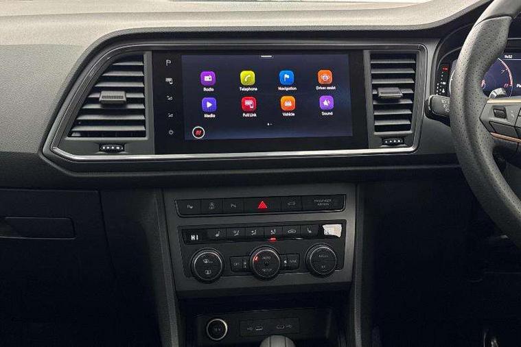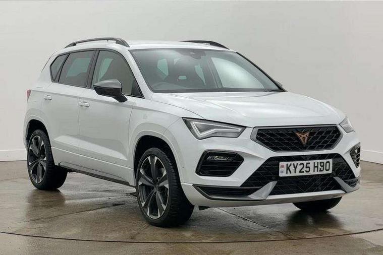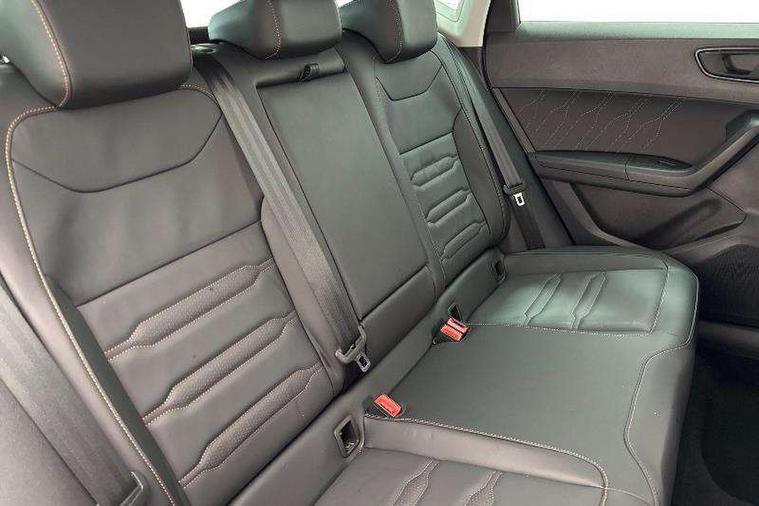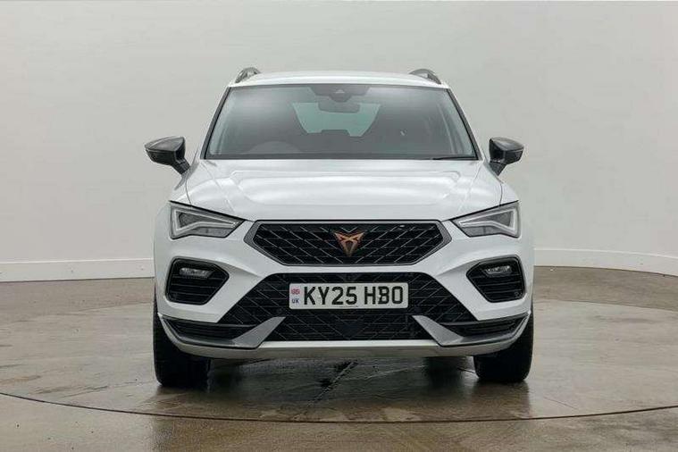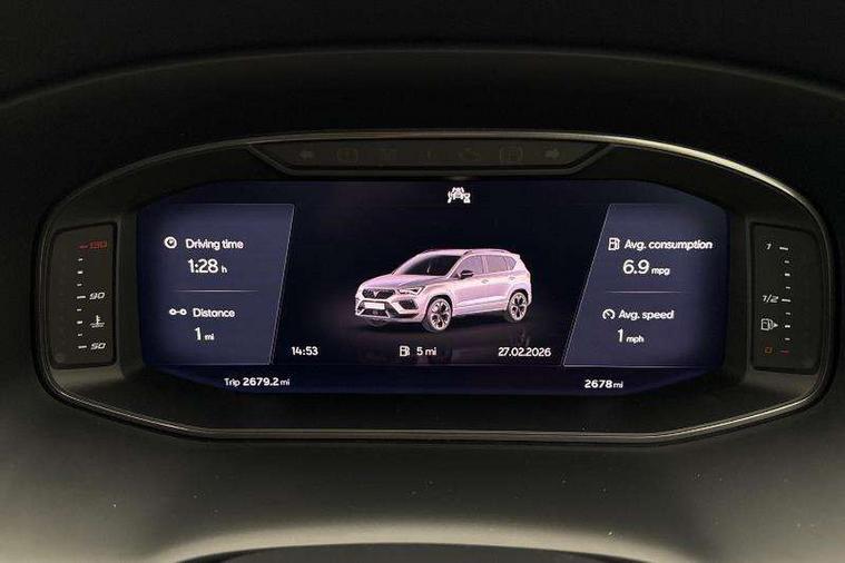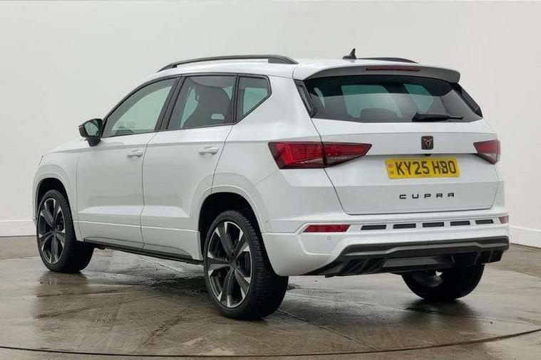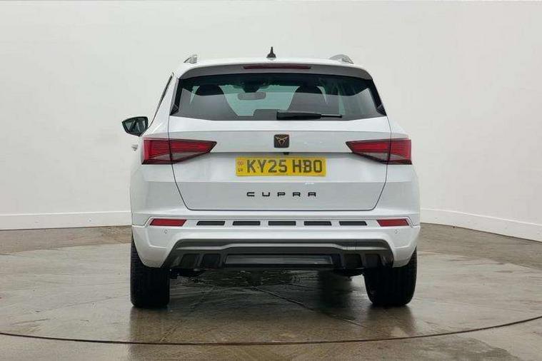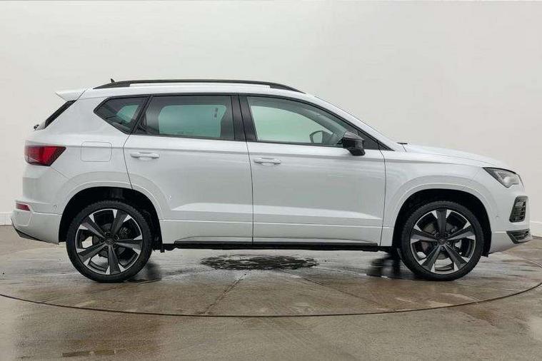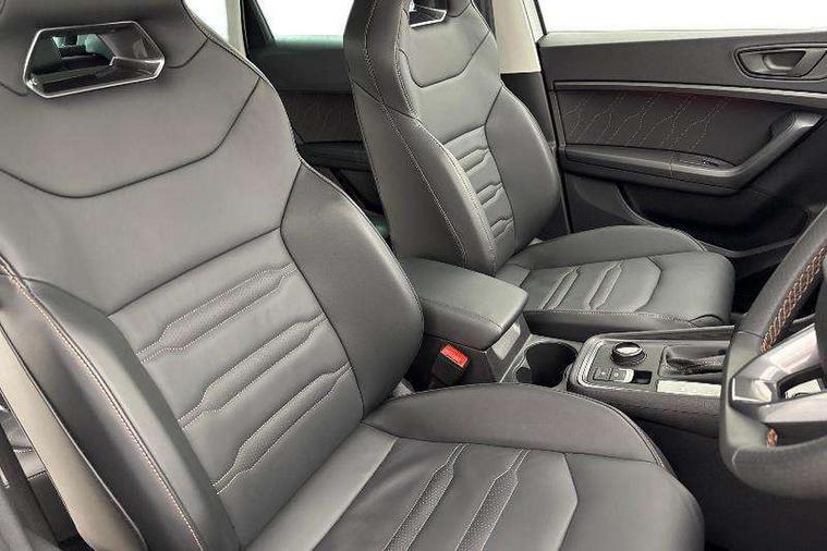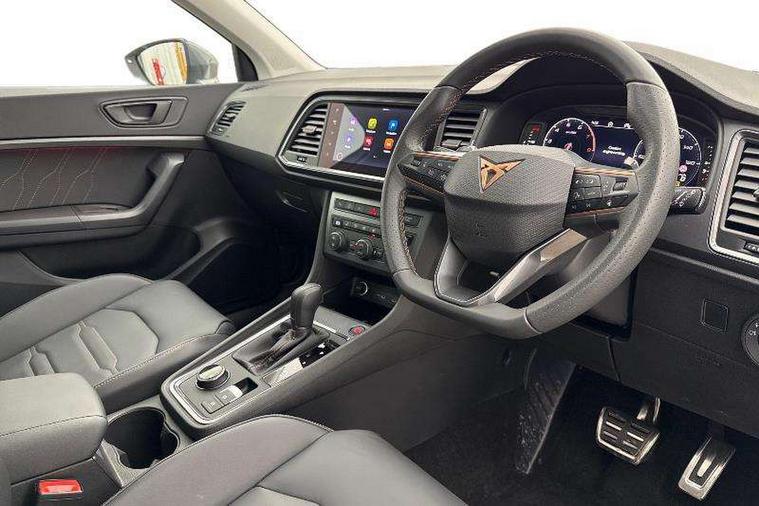 Cruise control system with speed limiter, Digital cockpit, Driving profile selection and conventional shock absorber, E-call, Electric tailgate with virtual pedal, Outside temperature gauge, Progressive power assisted steering, Rear view camera, Self parking functionality (includes front and rear parking sensors), Trip computer, wired and wireless full link smartphone integration, Wireless phone charger, Front and rear shock absorption, chassis with increased ride height, Steering wheel mounted audio/phone controls, Body colour bumpers with dark aluminium diffusor, Body coloured wheel arch surrounds, Dark tinted rear windows, Daytime running lights, Door mirrors with welcome CUPRA light silhouette, Dynamic headlight range control with self adjusting whilst driving, Electric adjustable/heated/folding door mirrors, Front and rear electric windows, Front grille frame in chrome, Full LED headlamps with lens and LED front fog lamps with cornering function, Gloss black door mirrors, Gloss black roof rails, Gloss black side mouldings, Gloss black side window trim, Illuminated aluminium front door sill, LED rear tail lights with dynamic indicators, Rear fog lights, Rear side wing doors, Rear spoiler, Rear wash/wipe, Specific CUPRA design front bumper, Standard rear exhaust tailpipes, Third brake light, 12V socket in front, 3 seat bench in 2nd row, 60/40 split folding rear seat, Aluminium pedals, Cupra steering wheel emblem, Dual zone climate control, Electric driver seat with memory function, Front and rear head restraints, Front centre armrest, Front seat back storage pockets, Grey roof lining, Heated front seats, Heated steering wheel, Height adjustable driver and passenger seat with lumbar adjustment, ISOFIX points in outer rear seats with top tether anchorage points, Leather sport bucket seats, Leather steering wheel and gear knob, Multicoloured ambient lighting with LED interior illumination, Pedal cluster, Rear armrest and easy back seat release mechanism from boot, Single front passenger seat, Sports steering wheel, Steering wheel mounted gearshift paddles, Storage compartment in roof console for sunglass, Storage compartment under driver's seat, Convenience pack - Ateca, Interior lighting pack - Ateca, Navigation system plus pack with DAB - Ateca, Safety and driving pack - Ateca, 3x3 point rear seatbelts, ABS, Traction control system (TCS), Electronic stability control (ESC) and Electronic differential lock system (XDS), Airbags - Driver and front passenger airbag with deactivation, front side, two curtain and driver's knee airbags, Black brake callipers with CUPRA logo, Electric parking brake with auto hold function, Front and rear seatbelt reminder, Front assist with autonomous emergency braking, Hill hold control, Manual rear child locks, Single tone horn, Tiredness recognition system, Tyre pressure monitoring system, Alarm, Keyless entry, Locking wheel bolts, 19" Sport machined alloy wheels 36/3 in black/silver,