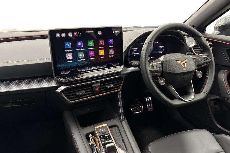 10.25" digital cockpit and configurable dashboard, Adaptive cruise control with follow-to-stop and speed limiter, Advanced driver alert system, Advanced lane assist with semi-automatic vehicle control in a medical emergency and traffic jam assist, Dynamic chassis control with driving profile selection (Comfort, Sport, CUPRA, Individual), Dynamic road sign display, Emergency steering support with turn assist, Forward collision warning with automatic braking, Front cross traffic assist, Full link phone integration, Intelligent park assist, RPM, trip computer, outside temp gauge, instrument light brightness, low fuel warning light, lights on reminder, gearshift indicator, Service interval indicator, Side and exit assist, Speed sensitive power steering, Start/stop system with regenerative braking, Top view camera, Virtual pedal and electric tailgate, Voice control system, Wired Android Auto, Wireless apple carplay, Wireless phone charger, Adaptive chassis control with continuous operation, CUPRA sport suspension, Electronic locking differential and dynamic traction support, 2 front and 2 rear USB type C sockets, Media system with navigation, 12.9" touchscreen display, voice control, DAB, steering wheel mounted controls, Auto dimming rear view mirror, Body colour door handles, Body coloured bumpers, Dark grey wing mirror, Daytime running light with automatic headlight control and coming home feature, Door panel ambient lighting, Dynamic headlight range control, Electric front/rear windows, Electrically adjustable heated and folding door mirrors with memory function, Gloss black roof rails and window surrounds, High beam assist, LED 3rd brake light, LED front fog lamps with cornering function, LED Taillights with dynamic indicator, Matrix Ultra HD headlights, Rain sensing wipers, Rear diffuser with twin exhaust pipe on each side, Rear fog lights, Rear side wing doors, Rear wash/wipe, Tinted rear windows, Welcome lights (within exterior mirror housing), 12V socket, 2 front and 2 rear reading lights, 3 seat bench in 2nd row, 60/40 split rear bench seat with armrest and mechanical seat release, Black headlining, Black interior roof lining, Cupra sports pedals, Dust/pollen filter, Electrically adjustable front seats with lumbar support and memory function, Front and rear head restraints, Front centre armrest, Heated front seats, Heated supersports multifunction leather steering wheel with satellite buttons and gear shift paddles, Height/reach adjust steering wheel, Illuminated aluminium doorsteps, Illuminated interior front door sills, Illuminated sunvisor with mirror, Isofix, Leather dashboard, door insert and side trim panel, LED smart wraparound lighting, PVC/Leather upholstery, Satellite steering wheel, Single front passenger seat, Storage pockets on rear of front seats, Three zone climate control with control panel in rear, Variable luggage/load compartment floor, 3 point seatbelts on all rear seats, ABS, Brake control system - ESC and brake booster, Child proof door locks, Driver and front passenger airbags with front passenger airbag de-activation, Electronic parking brake, Front and rear disc brakes, Front side curtain airbags, Hill hold control, Pre-crash front and rear seat belt tensioner, window closure and hazard lights, Public e-call, Seat belt reminder for front and rear seats, Tyre pressure monitoring system, Anti theft alarm system, KESSY Advanced - Keyless start, keyless entry with SAFELOCK, Locking wheel bolts, Warranty - 5 years/90, 000 miles, Copper and aluminium interior detailing, 19" Artic machined sport black and silver alloy wheels, Breakdown and tool kit,