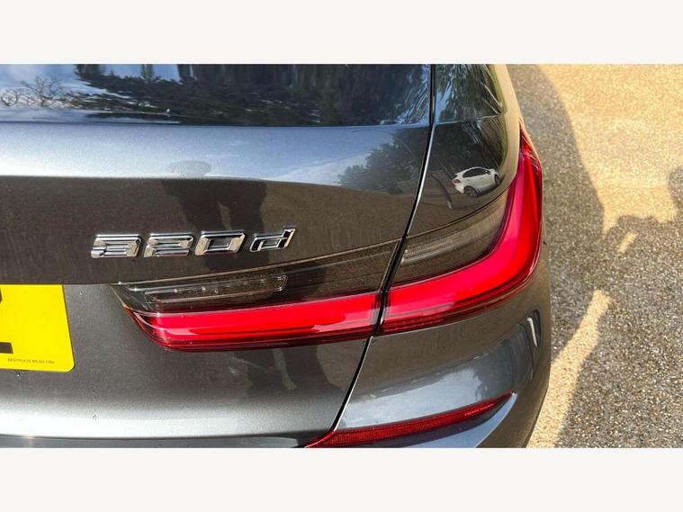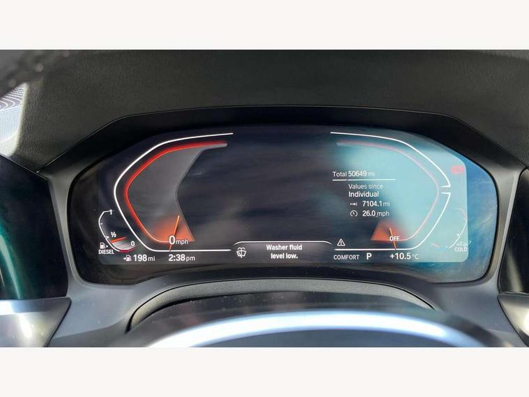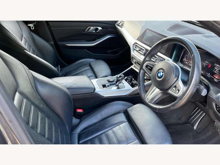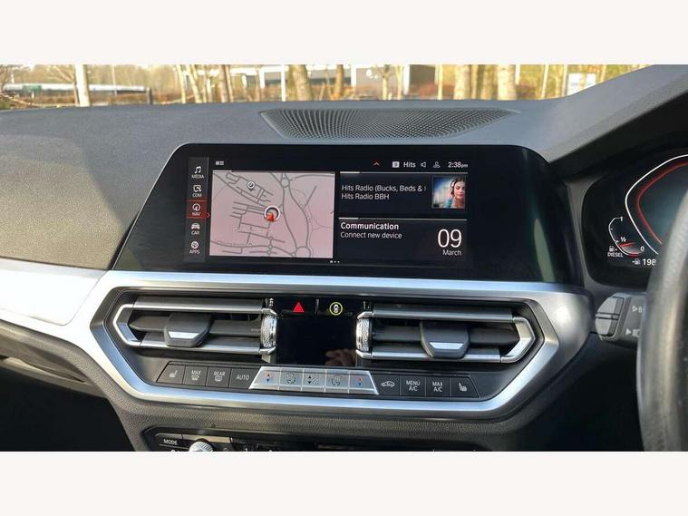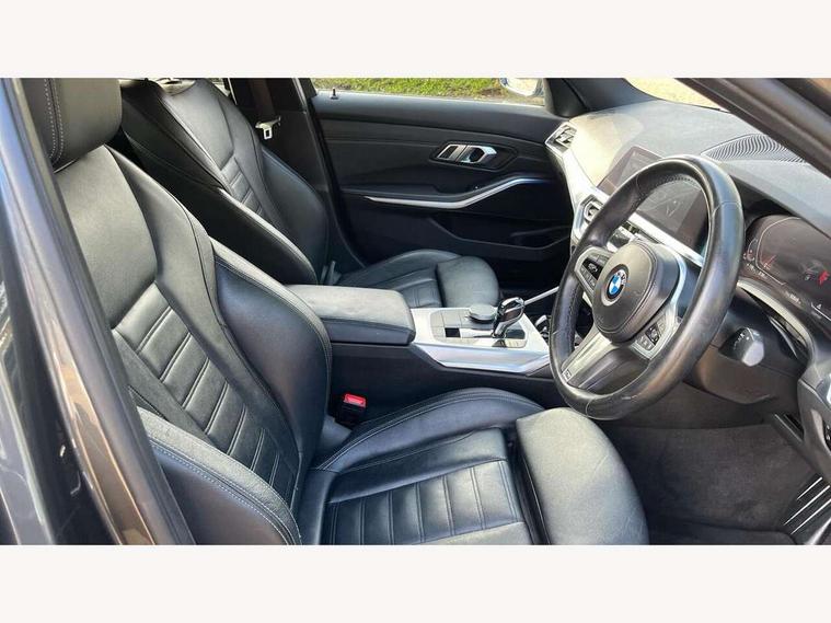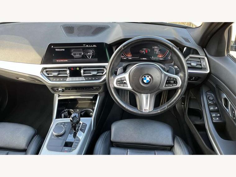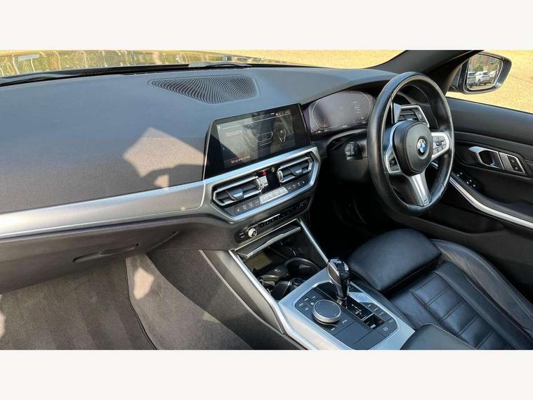 Active guard plus, Attentiveness assist, Bluetooth hands free facility with USB audio interface with audio streaming, BMW iDrive controller on centre console, BMW Live Cockpit Professional Nav with 12.3" instrument display + 10.25" display, Intelligent Voice Assist, BMW OS 7, HDD, 2USB, 4G LTE connect, BMW service history, BMW Teleservices, Brake pad wear indicator in front and rear, Check Control warning system for monitoring of lights and door/luggage compartment open warning, Condition based service, Cruise control with brake function + speed limiter, Electric power steering with Servotronic steering optimised at all speed ranges, Instrument cluster with speedometer with mph readout, tachometer, fuel gauge and oil temperature gauge, Integrated owners handbook, Oil sensor for level and grade, warning by check control system, On board computer - average speed+fuel consumption, service interval, clock/date, odometer/trip meter, outside temperature display and ice warning, Optimum shift indicator, Personal Profile - automatic lock when driving away selectable, Variable sport steering, 48V Mild hybrid technology, Balanced 50/50 weight distribution, Battery cut-out switch, Diesel particulate filter, Drive performance control - ECO PRO, comfort and sport modes, Electronic differential lock control (EDLC), Incorrect fuelling protection, Larger capacity fuel tank, M sport suspension, Stroke dependent dampers, DAB tuner, Electronic service booklet, Stereo speaker system with 2 mid range speakers in the front door trims and rear parcel shelf + 2 central bass speakers underneath the front seats, Acoustic glazing, Active airstream chrome frame kidney grille with 8 high gloss black vertical slats, Automatic headlight beam throw control with load dependent regulating reaction, dynamic compensation of braking dive and acceleration squat, Black roof mouldings, Body colour door handles, Body colour front and rear bumpers, Body colour fuel filler flap, Body colour mirror caps with bottom segment in matt black, Dynamic brake lights, Electric windows - front and rear, with open/close fingertip control, anti-trap facility and comfort closing, Exhaust tailpipe - split left and right, Exterior mirrors - electrically folding with anti-dazzle, Fading support, Front and rear bumper system with replaceable deformation elements, Front black door sill finishers with BMW designation, Green tinted heat protection glazing, High gloss shadow line exterior trim, Interior rear view electrochromatic mirror with automatic anti dazzle function, LED daytime running lights, LED front fog lights, Lightweight engineering, M designation on front side panels, left and right, Matt black exterior B pillar, Model designation on right side of tailgate, Rain sensor with automatic headlight activation, Shark fin antenna, Two part LED tailights in L-shape with components in smoked glass, brake light, LED turn indicator and rear fog light, Visible VIN plate, Welcome lights in interior and door handle area, Windscreen wipers with integrated washing jets, 12V power socket in front storage compartment, 2 front cupholder in centre console with clamping elements and matt black inlay, 3 rear seats with non folding headrests with 3 point seat belts, 3 zone automatic air conditioning, 4 pieces lashing eyelets in luggage compartment, 40:20:40 split folding rear seat with loading system, Ambient lighting with welcome carpet light, Anthracite headlining, Armrest integrated in front and rear door trim + front centre console armrest, Backrest width adjustment, Centred top Luggage compartment lights, Four grab handles integrated in roof lining, Front and rear door exit lighting (left / right), Front and rear door pockets, Front and rear reading lights, Front and rear velour floor mats, Front head restraints, Front sport seats, Heated front seats, Height adjustable mechanically and infinitely variable steering column, Illuminated armrest storage compartment, Illuminated glove compartment with separate small compartment, Interior lighting - front centre over interior mirror with soft light, rear centre and front and rear footwell lighting, M sport leather steering wheel, Make-up mirror lights, Rear centre armrest with 2 cupholders, Rear centre console with storage compartment and ventilation grille, Sunvisors with vanity mirrors and ticket pocket, Toolkit located in luggage compartment, Connected pack professional - 3 Series Saloon/Touring, M sport exterior styling pack - 3 Series Saloon/Touring, 2 tone horn, BMW emergency call, Brake energy regeneration, Braking pre-tensioning, Child proof locking system in rear door, Child seat ISOFIX attachment rear outer seats, Coasting in idle in ECO PRO mode, Crash sensor activating of airbags, Unlocking doors, hazard warning lights, interior light, safety battery terminal, Driver and front passenger side airbags, integrated in the door side seat backrest bolsters for all seat variants, Driver/Front Passenger airbags, Dry braking, Dynamic brake control, Dynamic stability control + (DSC+) - Anti-lock Braking System (ABS) with brake assist and cornering brake control + Automatic Stability Control (ASC), Dynamic Traction Control - DTC, Electric parking brake including automatic hold function and automatic release of the parking brake when driving off, Front passenger manual airbag deactivation, Head airbags for all 4 outer seats, Hill start assist, Seat belt security check for driver and front passenger, Side impact protection, Three 3 point seat belts on all seats including front belt stopper, pyrotechnic belt tensioners and belt force limiters, Tyre pressure monitoring with three level warning strategy, Ventilated front and rear disc brakes, Warning triangle and first aid kit, Alarm system (Thatcham 1) with remote control and electronic engine immobiliser, Central locking switch for all doors, fuel filler cap and luggage compartment, Remote control with integrated key one button open/close vehicle and windows, sol