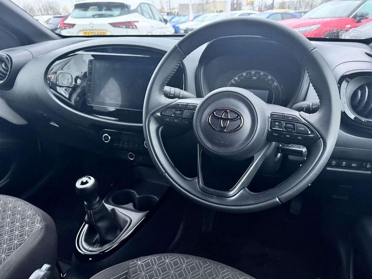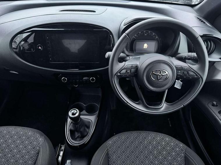 4.2" TFT colour screen, Adjustable speed limiter, Analogue speedometer, Bluetooth connectivity, Digital tachograph, Driver attention alert system, eCall emergency call system, Electric power steering, Intersection turn assist, Key reminder warning, Noise reduction kit, Pre collision system with emergency steering assist, Reversing camera with static guide lines, Smart phone integration with Apple car play/Android Auto, Speed limit display, Start and stop, Vehicle Stability Control (VSC), 4 speakers, 9" HD multimedia display touch screen with Toyota smart connect, DAB digital audio broadcast, USB connector, Auto headlights, Auto wipers, Automatic headlights cut-off, Bicycle towing hook, Black contrast roof, Black side protection mouldings, Black wheel arch mouldings, Body colour door handles, Body coloured front bumper, Boot door scuff plate, Eclipse black rear bumper, Electric heated door mirrors, Follow me home headlights, Front fog lights, Front power windows, Gloss black door mirrors, Gloss black upper front grille, Headlight cut-off reminder, LED daytime running lights, LED front light guide, LED High mounted stop lamp, Manual day/night rear view mirror, Manual headlight levelling, Pagoda roof, Power adjustable door mirrors, Power back door, Privacy glass, Projector halogen headlights, Rain sensor, Rear combination lights LED bulb type, Rear side wing doors, Rear windscreen defogger, Rear windscreen wiper, Short antenna, Variable intermittent windscreen wipers, 12v power outlet - front, 2 seat bench in 2nd row, 3 spoke leather steering wheel, 50/50 split folding rear seat, Adhesive roof headlining, Adjustable speed limiter switch on steering wheel, Audio and telephone switches on steering wheel, Auto air conditioning, Black insert on steering wheel, Black roof lining, Boot light, Centre room light, Chrome interior door handles, Chrome surround on air conditioning buttons, Clean air filter, Console box storage in body color, Fabric upholstery, Floor mats, Front and rear cup holders, Front head rest deco art, Front head restraints, Height adjustable driver seat, Intelligent adaptive cruise control switch on steering wheel, ISOFIX child restraint system on rear seats, Lane departure alert switch on steering wheel, Leather gearshift knob, Manual tilt steering wheel, Manually reclining and sliding driver seat, Manually reclining and sliding front passenger seat, Multimedia switches on steering wheel, Pollen filter, Rear door pockets, Rear head restraints, Satin silver insert on gear shift knob, Single compartment glovebox with lights, Single front passenger seat, Soft tonneau cover, Sun visors with mirror on driver and passenger side, Voice recognition switch on steering wheel, Toyota safety sense pack - Aygo X, Anti lock braking system + Electronic brake force distribution, Child safety door lock, Emergency brake light signal (EBS), Hill start assist control (HAC), Passenger airbag on/off switch, Seat belt reminder for front and rear seats, Supplement restraints system (SRS) - 6 airbags, Traction control, Tyre pressure warning system, Immobiliser, Remote power door locks, Black wheel centre caps, Tyre repair kit,