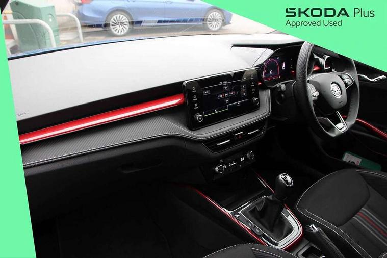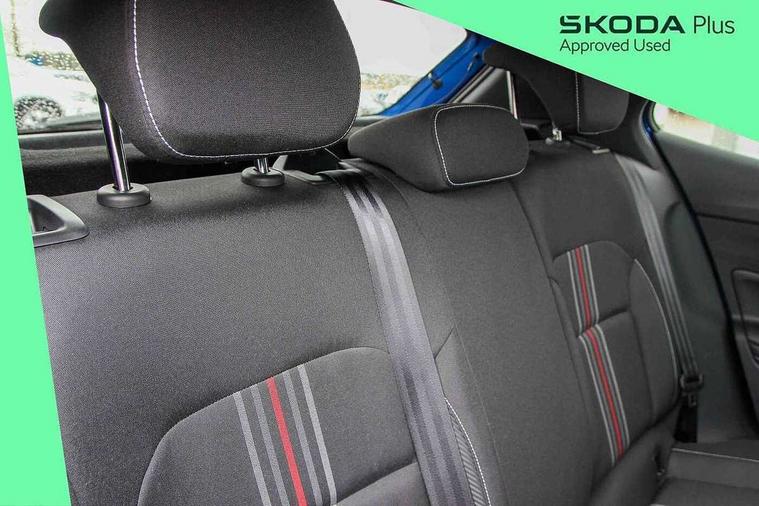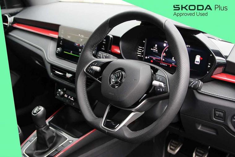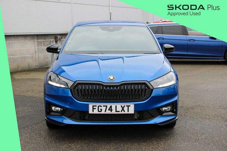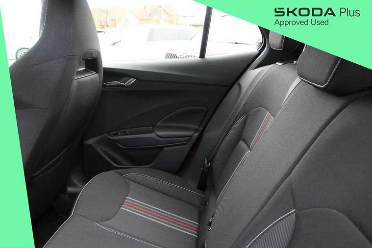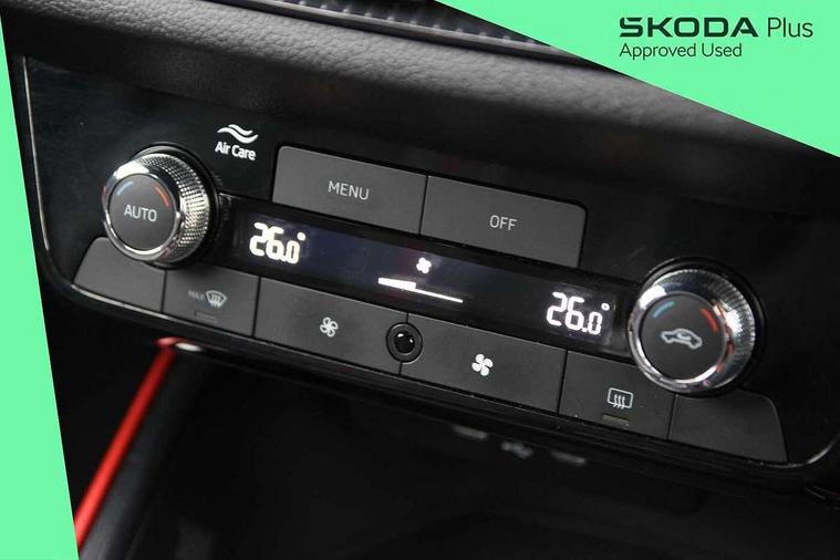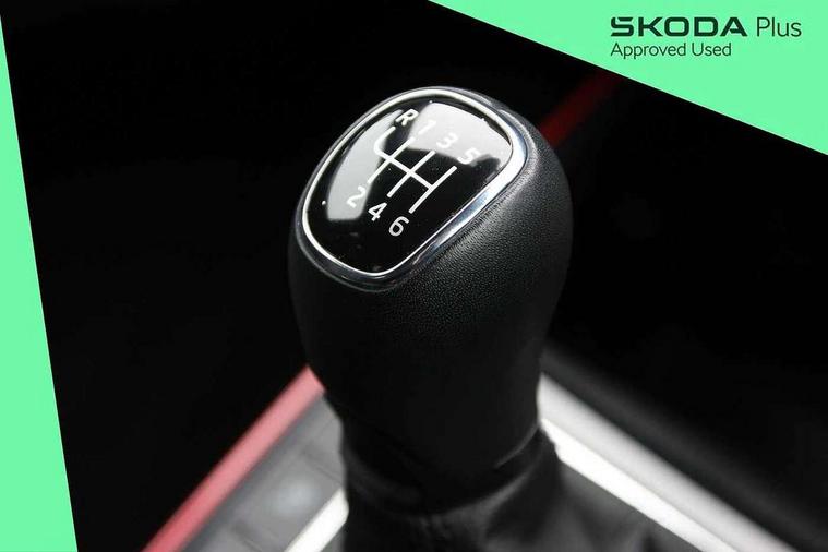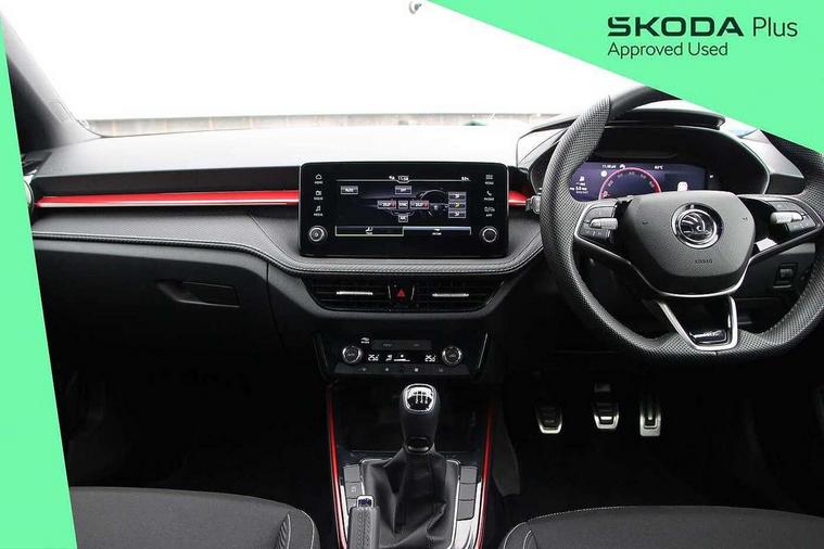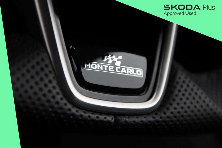 Advanced driver attention and drowsiness monitor, Bluetooth connection, Electromechanical power steering, Exterior temperature gauge, Service interval indicator, Traffic sign recognition, Virtual cockpit with 10.25" colour display, Wireless SmartLink for Apple CarPlay and Android Auto, 6 Speakers (4 in front and 2 in rear), Auxiliary socket for external MP3 player, DAB digital radio reception, Auto dimming rear view mirror, Black radiator grille, Body coloured bumpers, Door mirror integrated indicators, Front and rear electric windows, Front window wiper intermittent control, Headlight range control - Automatic, Ice scraper in fuel cap, LED daytime running lights with coming and leaving home feature, LED rear lights, Monte Carlo badging, Privacy glass, Rear LED fog light, Rear side wing doors, Rear window wiper with washing nozzles, Roof mounted spoiler, SKODA tailgate lettering in black, Sports bumpers, Third brake light, 2 reading lights in front and 2 reading lights in rear, 3 rear headrests, Aluminium pedals, Backrest split and folding, Black headlining, Central console with removable cup holder and storage box, Chrome handbrake release button, Door sills with fabia badging, Dual zone air conditioning with climatronic electronic control, Fabric/artificial leather upholstery, Front centre armrest, Front sports seats, Gearshift knob/handle in leather, Hand brake lever handle in leather, Height adjustable front headrests, Height adjustable front seats, Height adjustable steering wheel, ISOFIX and TopTether anchorage points to the outer rear seats, ISOFIX and TopTether on the front passenger seat, Luggage compartment lighting, Manually adjustable lumbar support in front seats, Metallic painted red central console cover, Metallic red interior door handles, Pollen filter, Rear seat bench unsplit, Single front passenger seat, Sun visors with mirror and airbag label on passenger side, Textile floor mats, Ticket holder, Umbrella in drivers door, 3-point height adjustable front seats belts with pretensioner and force limiter, Automatic warning lights in case of crash, Driver and passengers airbag with switch off function, e-Call+, ESC including ABS, MSR, ASR, EDS, HBA and XDS, Front and rear seat belt warning, FRONT ASSIST (AEB City and AEB Inter Urban), Front side airbags, Head airbags, One tone horn, Pedestrian protection, Three rear 3-points safety seat belts with pretensioner and force limiter including stop function for outer rear seat belts, Tyre pressure monitoring system, Anti-theft alarm system including immobiliser, interior monitoring, backup horn, and towing protection, Central locking with radio remote control, interior controls, SAFE function and 2 foldable keys, Carbon effect door and side trim panels, Carbon effect lower decorative trim with white stitching, Monte carlo air vents, Red metallic upper decorative trim, Anti-theft wheel bolts protection, Super-low rolling resistance tyres,