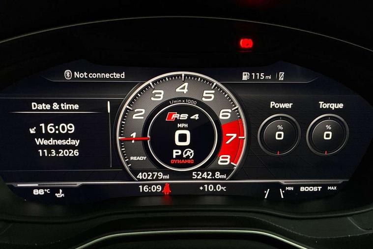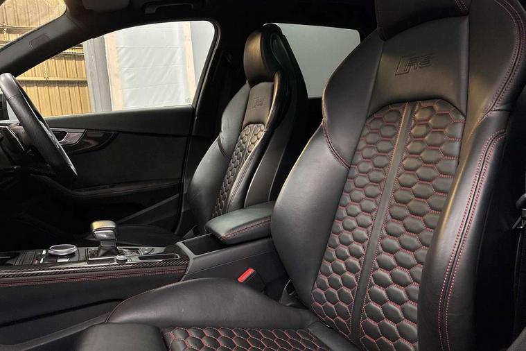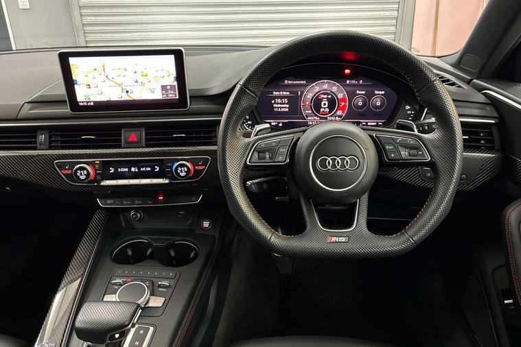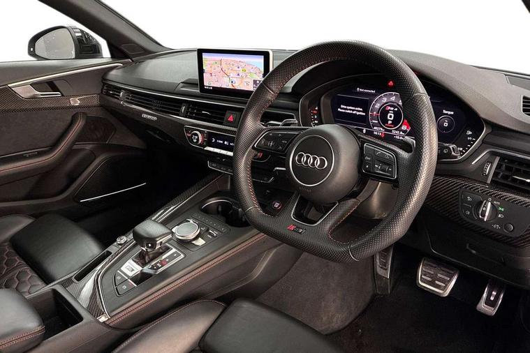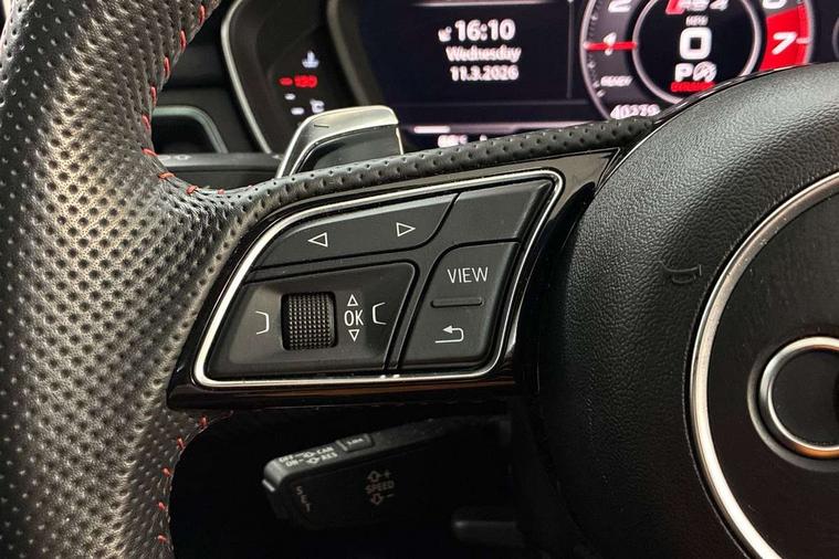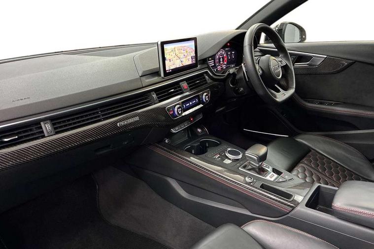 Audi drive select, Audi smartphone interface, Audi virtual cockpit - 12.3" high-resolution LCD display with fully customisable instrument cluster, Colour driver's information system display, Electro-mechanical PAS, MMI navigation plus with HDD and jukebox storage + 2 SD card readers + single CD/DVD player, Mobile telephone preparation - bluetooth interface, Power boot opening and closing, Service interval indicator, Stop/start button, Voice control system, Quattro sports differential, 2 USB ports, Aux input, DAB digital radio module, Acoustic windscreen, Air inlets in titan black with chrome inlays, Aluminium window trim, Auto dimming rear view mirror, Automatic headlights + automatic windscreen wipers, Body colour bumpers, Body colour door handles, Electric adjustable heated door mirrors, Electric front windows, Electric rear windows, Headlight range control, Headlight washer jets, High beam assistant, High gloss black triangular aperture at rear door, Honeycomb radiator grille - black, LED daytime running lights, LED indicators in door mirrors, Rain and light sensors, Rear diffuser in Twilight grey matt, Rear wiper, Twin oval exhaust tailpipes with chrome finish, 3 zone climate control, 4 way electric lumbar support for driver and front passenger, Black cloth headlining, Door armrest in leather, Fine Nappa leather upholstery, Front centre armrest with 12v socket, Front headrests, Front/rear floor mats, Gearshift paddles, Illuminated door sill finishers, Isofix child seat preparation for front passenger/outer rear seats inc passenger airbag deactivation, Jack and tool kit, Luggage compartment carpet, Lumbar support with massage function, Massage function for front and rear seats, Perforated leather gearknob, Reach + rake adjustable steering column, Rear centre armrest, Rear headrests, Retractable load area cover, RS Super sports front seats, Split folding rear seats, Sunvisors with vanity mirrors, Top tether anchor plate for isofix child seat, Non Smokers pack, 3 point seatbelts on all rear seats, ABS/EBD, Active bonnet, Adaptive driver and front passenger airbags, Electromechanical parking brake, Enhanced braking system, ESP, First aid kit, Front head airbags, Front seatbelt pretensioners + load limiters, Front side airbags, Hill hold assist, Pre-sense city emergency braking system, Seatbelt warning, Traction control, Warning triangle, Anti theft alarm, Keyless Start, Locking wheel bolts, Remote central locking, Thatcham category 1 alarm + immobiliser, Space saver spare wheel,