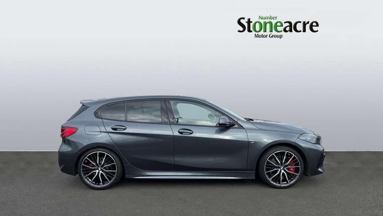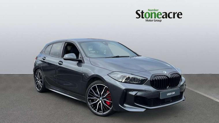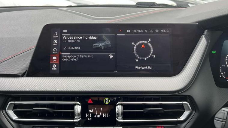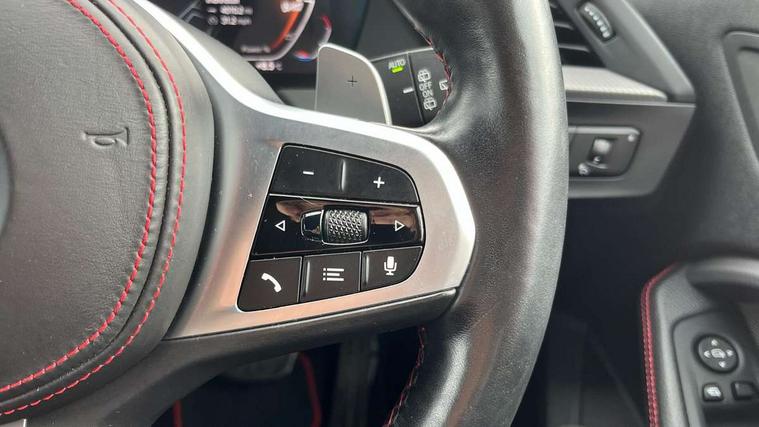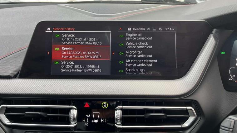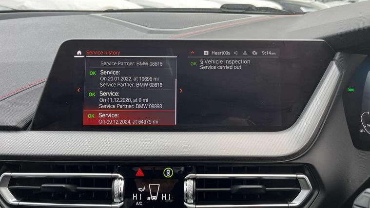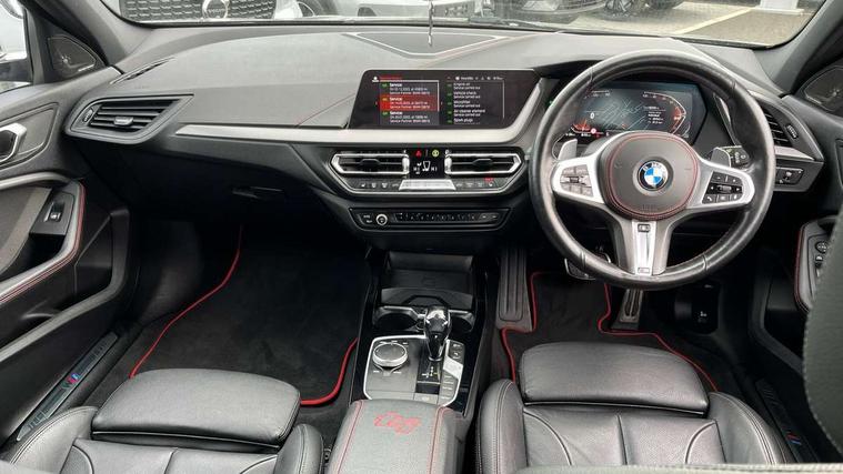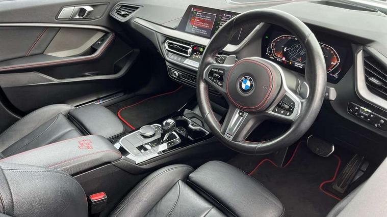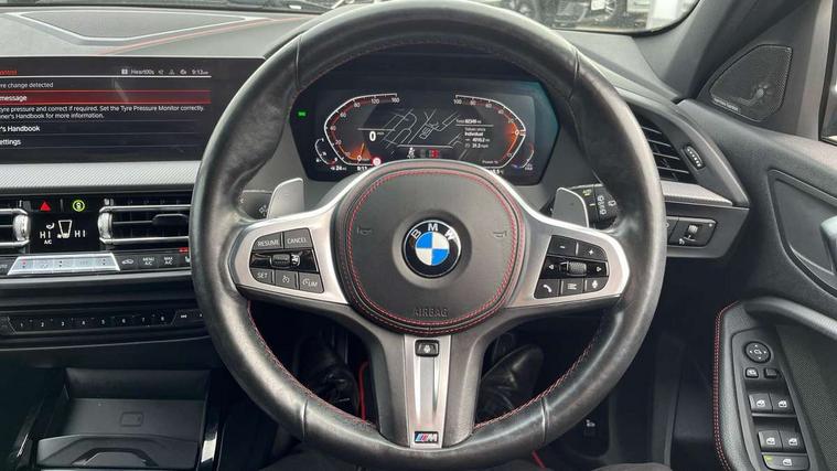 Active guard plus, Attentiveness assist, BMW Online services, BMW Teleservices, Check Control warning system for monitoring of lights and door/luggage compartment open warning, Connected eDrive Services, Eco pro mode, Electric power steering with Servotronic steering optimised at all speed ranges, Integrated owners handbook, Oil sensor for level and grade, On board computer, Optimum shift indicator, Personal Profile, Pull away assistant, Speed limiter, Aluminium lightweight construction, Anti roll bar front and rear, Balancer shaft, Double VANOS, Drive Performance Control, Eight speed sport automatic transmission with electronic selector lever, Electronic differential lock, High precision injection, M sports suspension + self levelling, Petrol Particulate Filter, VALVETRONIC engine management, Bluetooth audio streaming, DAB Digital radio, Air inlets in front left and right with highlight clasp in red, Auto dimming rear view mirror, Automatic headlight beam throw control, Black chrome tailpipe finishers, BMW individual lights shadow line, Body colour door handles, Body colour mirror caps, Chrome 'M' logo side designation, Chrome kidney grille frame with Satin Aluminium struts, Direction indicator side lights in exterior mirrors, Electric folding and anti dazzle exterior mirrors, Fading support, Follow me home headlights, Front and rear electric windows with open and close fingertip control, anti trap facility and comfort closing, Front door sill finishers in black plastic with BMW designation, Green tinted heat protection glazing, Heated, electrically adjustable exterior mirror aspheric on driver side, convex on passenger side, High gloss shadowline window frame, Recess cover mirror frames and B/C pillar embelisher trim, High level third brake light, LED daytime running lights, LED eyebrow turn indicators, Lightweight engineering, Matt black air guide grilles, Model designation on right side of tailgate, Nearside reverse light in rear light cluster, Preparation for high beam assistant, Rain sensor including auto headlights activation, Rear fog lights, Rear window wiper, Shark fin antenna, Visible VIN plate, Welcome lighting, Windscreen wipers with integrated washing jets, 12V power socket in centre console, 3 rear seat head restraints, Anthracite headlining, Centre armrest in black/red highlight including embroidered 'ti' designation in red, Child seat ISOFIX attachment for two outer rear seats and front passenger seat with anchorage points, Conditioned based service, Driver and front passenger seat heating, Floor mats with red binding, Folding rear clothes hook, Folding rear seats, Four grab handles integrated in roof lining, Front and rear door pockets, Front and rear side armrest integrated into door trim, Front armrest foldable with integrated storage compartment, Front sports seats with electric side bolster adjustment, Glove compartment, Height adjustable front head restraints, Instrument panel top section , door armrests and door panels in black/red highlight, Manual adjust steering wheel, Multi-function controls for steering wheel, Rear seat backrest with manual 60:40 split folding with 3 top tether clips integrated on rear of seat panels, Storage compartment in centre console, Sun visors with vanity mirrors and insert tab, Three spoke M sport design multi function leather steering wheel in unique red stitching, Two zone automatic air conditioning, Connected pack professional - 1 Series, Extended Lighting pack - 1 Series, Extended storage pack - 1 Series, Interior lights pack - 1 Series, Luggage compartment pack - 1 Series, M Sport exterior styling aerodynamics pack - 1 Series, 2 tone horn, 3 point seatbelts on all seats, front pyrotechnic belt tensioners, stopper and belt force limiters, rear coded belt buckles, Airbags - Front driver and passenger, front and rear head, front side, curtain head protection, Anti lock braking system (ABS) with brake assist, BMW emergency call, Brake drying, Braking readiness, Crash sensor activating central locking release, hazard warning lights, fuel cut off, interior lighting + activation of safety battery terminal clamp, Driver and front passenger seat belt security check, Dynamic stability control + (DSC+), Dynamic Traction Control - DTC, Electrically operated hand brake, Front and rear disc brakes, Front passenger manual airbag deactivation, M Sport braking system with red calipers, M sport seatbelt, Rear child proof door locks, Seatbelt warning, Side impact protection, Tyre pressure monitoring system, Warning triangle and first aid kit, Automatic drive away locking facility, Central locking switch for all doors, fuel filler cap and luggage compartment, Deadlocking function system to all doors, Locking wheel bolts, Remote control with integrated key with High-gloss Black inlay and M designation and 1 button for open/ close lock, window, open luggage compartment, Start/stop button with comfort go keyless engine start and auto start stop deactivation button, Thatcham Cat.1 alarm and immobiliser, Reduced rolling resistance tyres,