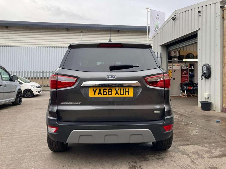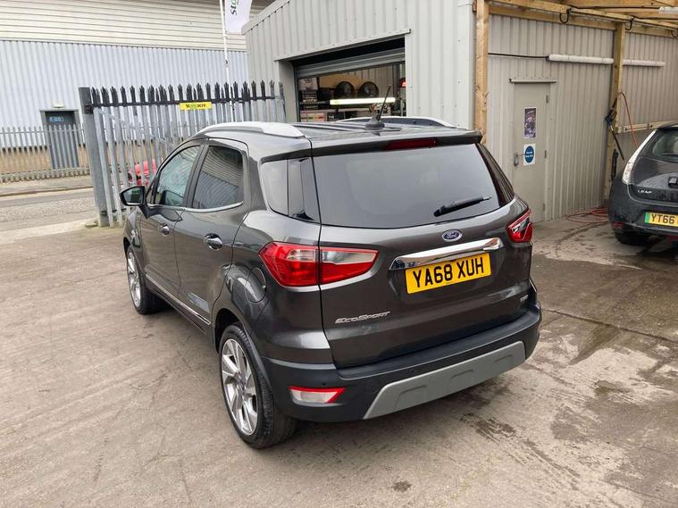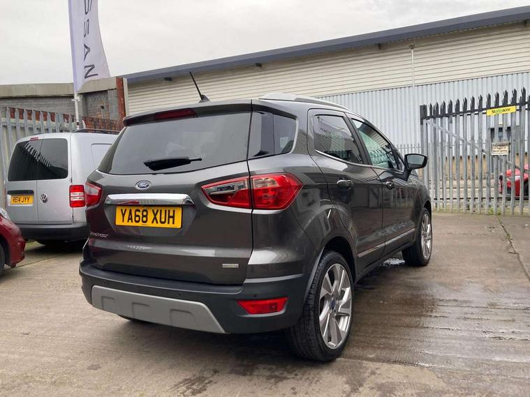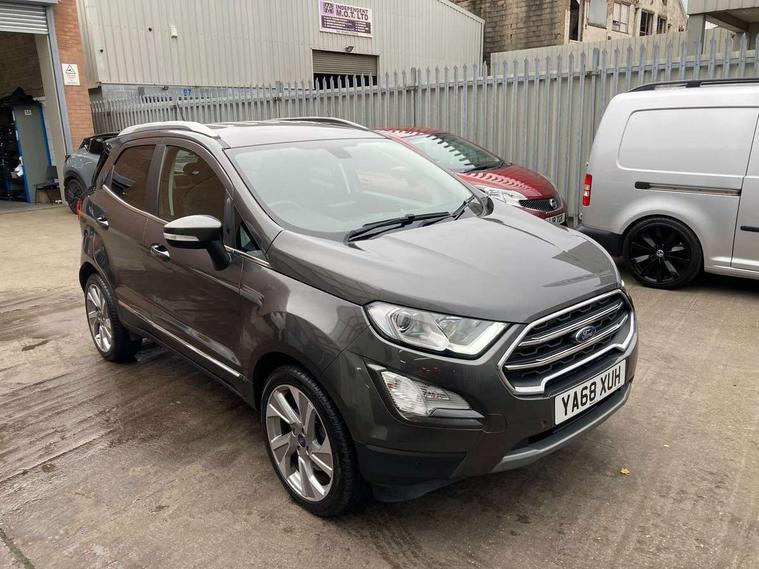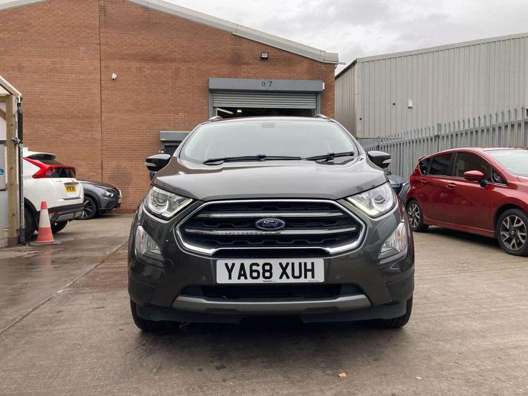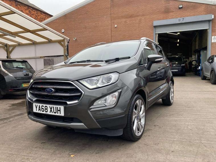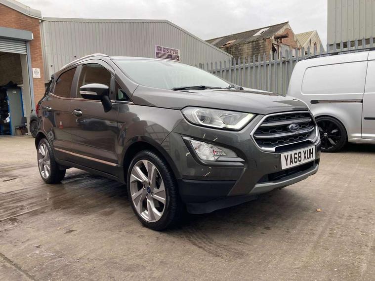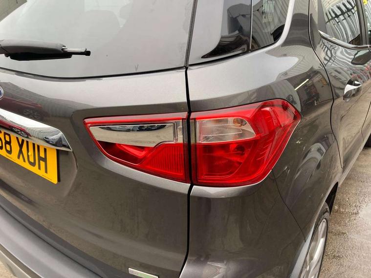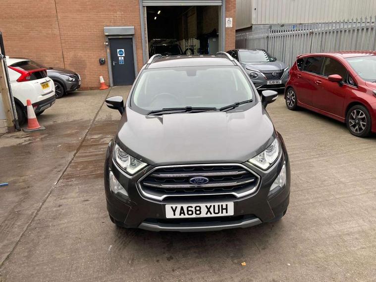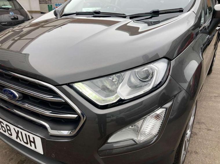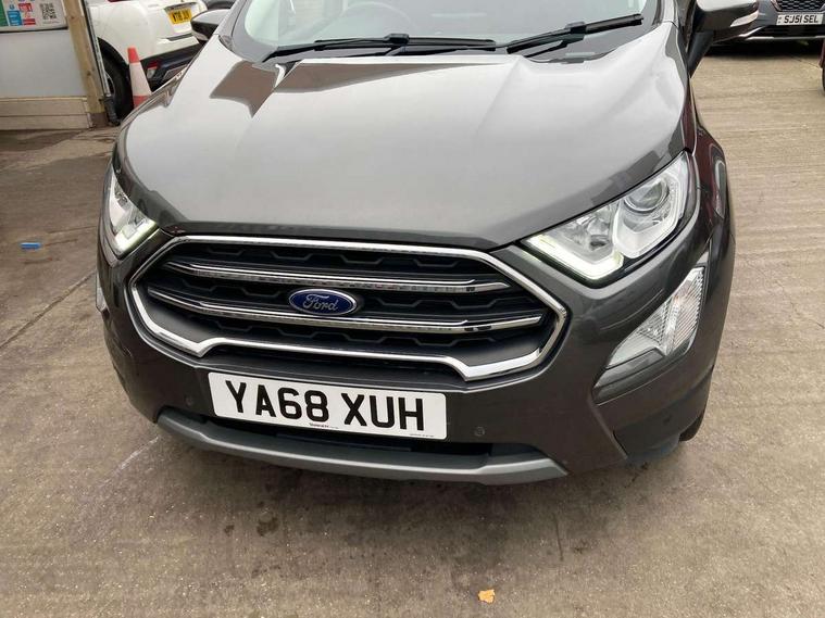 Cruise control, Easy fuel capless refuelling system, PAS, SYNC 3 nav system with DAB radio, 8" screen, voice control, emergency assistance, Apple car play/Android auto, 2x USB, Ford pass connect, Trip computer, 'Quickclear' heated windscreen/heated washer jets, Auto dimming rear view mirror, Automatic headlights, Body colour door handles, Body coloured bumpers, Electrically adjustable and heated door mirrors, Front door threshold plates, Front fog lights, Front grille with chrome trim surround, Headlamps with LED day running lights, Headlight levelling control, Power foldable door mirrors with puddle lights, Power front and rear windows with global opening/closing, Rain sensing front wipers, Rear wiper, 12V socket in front and rear, 60/40 split rear seats, 7 shade adjustable ambient lighting, Centre console with sliding front armrest, Cooled glovebox, Courtesy lights with map reading light, Driver seat height/lumbar adjust, Driver's side glovebox, Driver/passenger sunvisors and lidded vanity mirrors, EATC - Electronic Auto Temperature control, Folding grab handles, Footwell ambient lighting, Front head restraints, Front seat back map pockets, Front/rear floor mats, Groove cloth/leather upholstery, Illuminated glovebox, Illuminated luggage compartment, Isofix system on outer rear seats, Leather gear knob and handbrake grip, Leather steering wheel with audio controls, Luggage compartment carpet, Overhead console with sunglasses holder, Rake adjustable rear seats, Reach + rake adjustable steering column, Rear headrests, Steering wheel with chrome inserts, Storage drawers under front seats, Tie down hooks, Variable boot floor, Rear view camera pack - Ecosport, 3x3 point rear seatbelts, ABS, Child locks on rear doors, Curtain airbags, Driver airbag, Drivers knee airbag, Electronic Stability Programme with hill launch assist, Emergency brake assist, Front passenger airbag deactivation, Front side airbags, Passenger airbag, Seatbelt reminder for driver and front passenger, Traction control, Tyre pressure monitoring system, Immobiliser, MyKey system, Remote central locking, Thatcham 1 volume sensing alarm, Tyre inflation kit,
