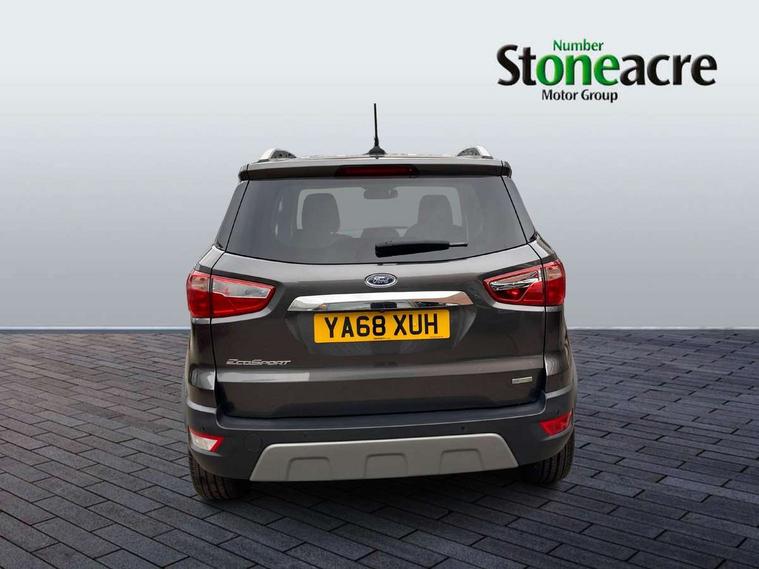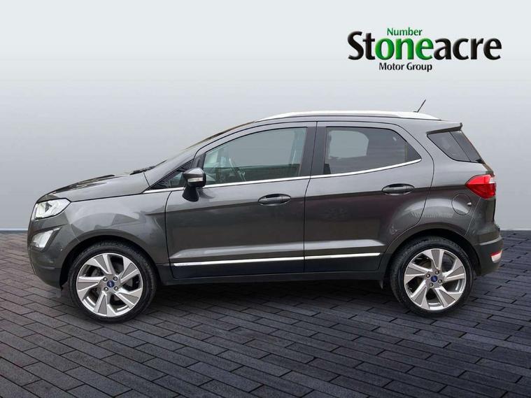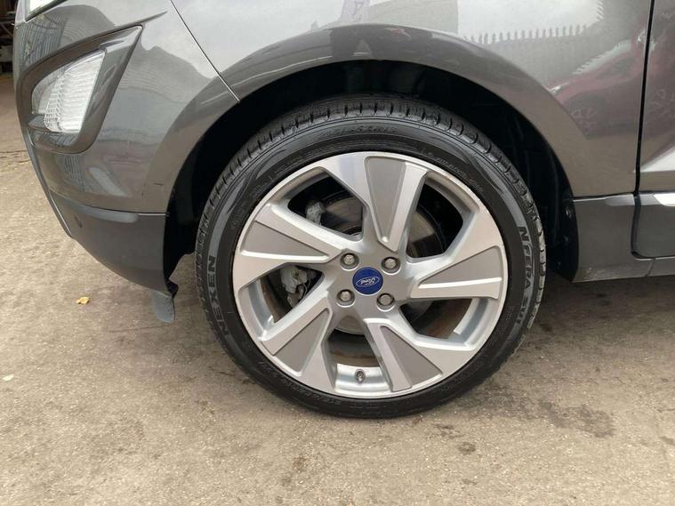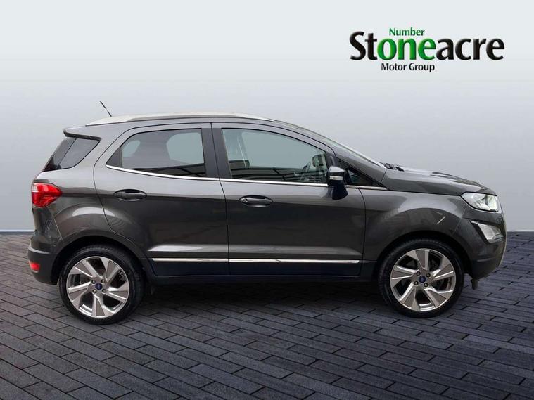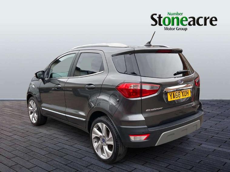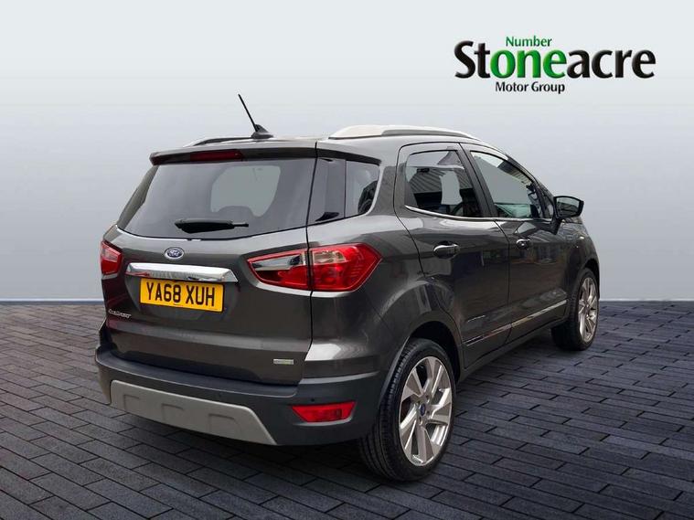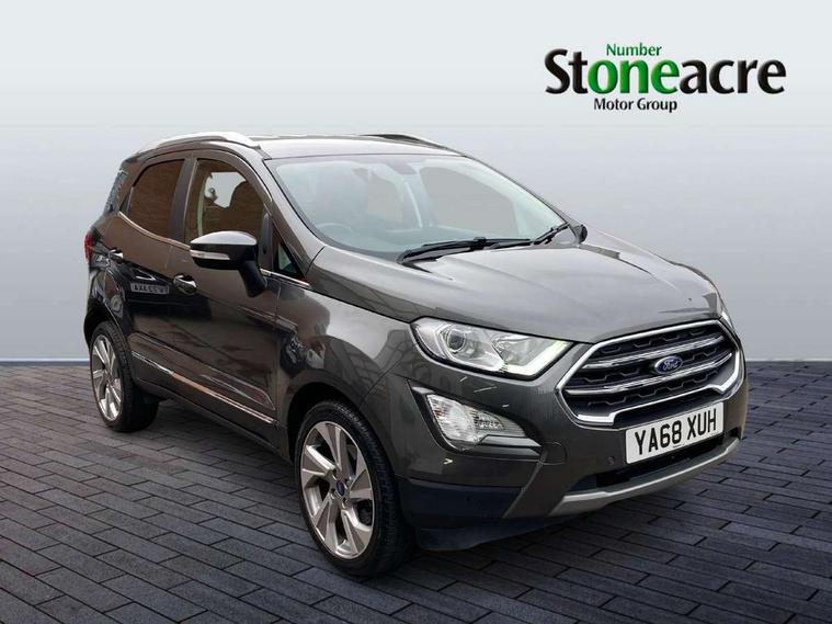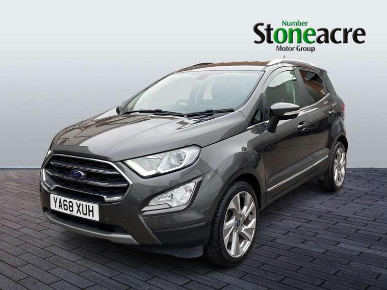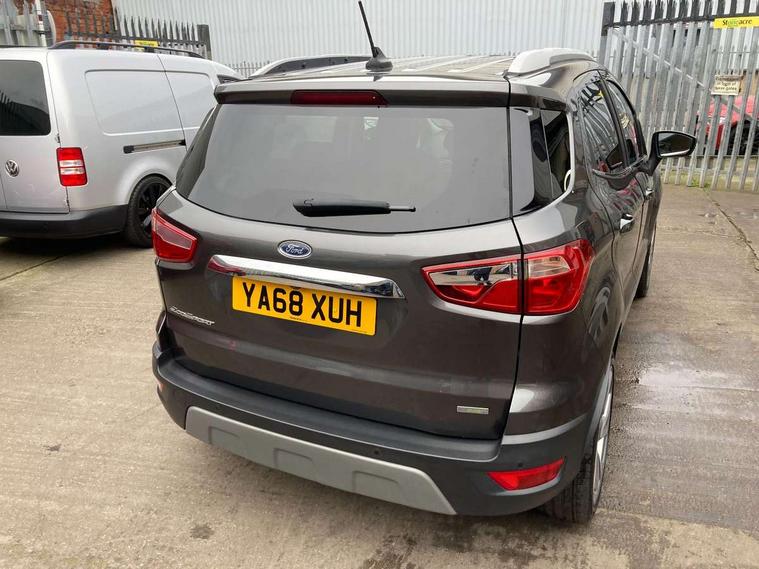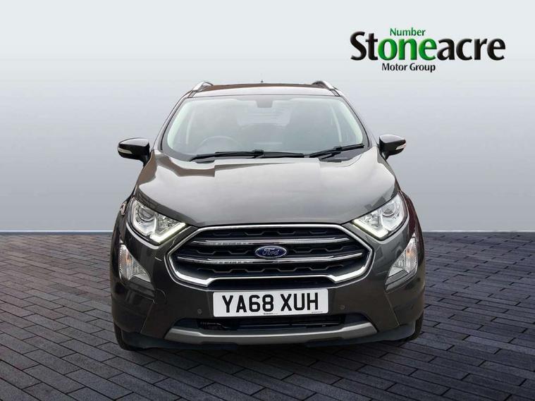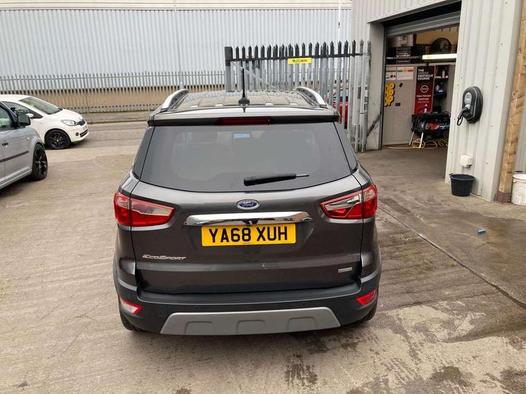 Cruise control, Easy fuel capless refuelling system, PAS, SYNC 3 nav system with DAB radio, 8" screen, voice control, emergency assistance, Apple car play/Android auto, 2x USB, Ford pass connect, Trip computer, 'Quickclear' heated windscreen/heated washer jets, Auto dimming rear view mirror, Automatic headlights, Body colour door handles, Body coloured bumpers, Electrically adjustable and heated door mirrors, Front door threshold plates, Front fog lights, Front grille with chrome trim surround, Headlamps with LED day running lights, Headlight levelling control, Power foldable door mirrors with puddle lights, Power front and rear windows with global opening/closing, Rain sensing front wipers, Rear wiper, 12V socket in front and rear, 60/40 split rear seats, 7 shade adjustable ambient lighting, Centre console with sliding front armrest, Cooled glovebox, Courtesy lights with map reading light, Driver seat height/lumbar adjust, Driver's side glovebox, Driver/passenger sunvisors and lidded vanity mirrors, EATC - Electronic Auto Temperature control, Folding grab handles, Footwell ambient lighting, Front head restraints, Front seat back map pockets, Front/rear floor mats, Groove cloth/leather upholstery, Illuminated glovebox, Illuminated luggage compartment, Isofix system on outer rear seats, Leather gear knob and handbrake grip, Leather steering wheel with audio controls, Luggage compartment carpet, Overhead console with sunglasses holder, Rake adjustable rear seats, Reach + rake adjustable steering column, Rear headrests, Steering wheel with chrome inserts, Storage drawers under front seats, Tie down hooks, Variable boot floor, Rear view camera pack - Ecosport, 3x3 point rear seatbelts, ABS, Child locks on rear doors, Curtain airbags, Driver airbag, Drivers knee airbag, Electronic Stability Programme with hill launch assist, Emergency brake assist, Front passenger airbag deactivation, Front side airbags, Passenger airbag, Seatbelt reminder for driver and front passenger, Traction control, Tyre pressure monitoring system, Immobiliser, MyKey system, Remote central locking, Thatcham 1 volume sensing alarm, Tyre inflation kit,