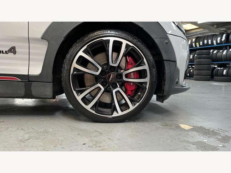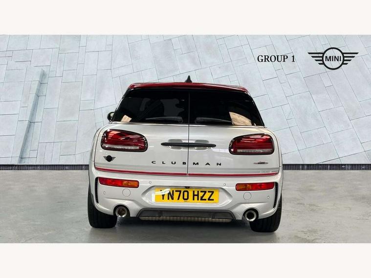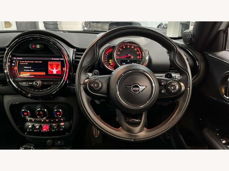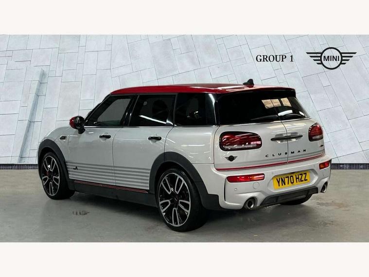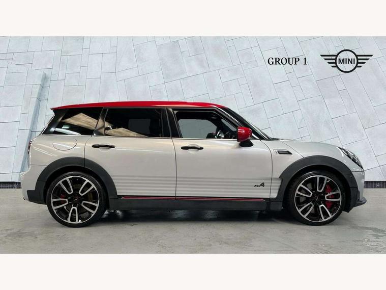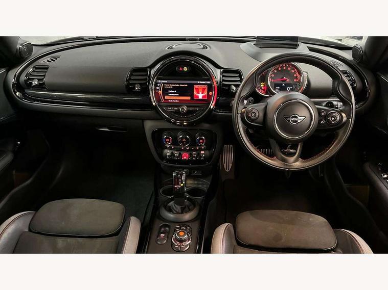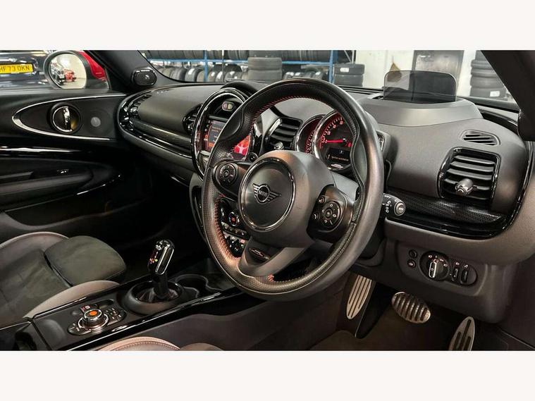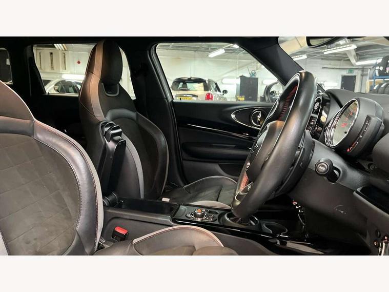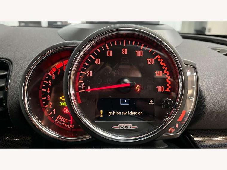 Active Guard incl speed limiting and lane departure functions with auto steering, and front collision warning with brake intervention, Automatic start/stop function with brake energy recuperation, Compatible mobile phone bluetooth with audio streaming, Digital cockpit, Electro-mechanical speed dependant steering assistance, Instrument cluster, Mini E-call, MINI TeleServices, On board computer, 8 Speed steptronic sport transmission including steering wheel paddles, All Wheel Drive (AWD), Double Vanos system, Fully variable valve control, High precision injection, Performance Control, FM tuner and DAB digital radio, Bonnet scoop, Chrome fuel filler cap, Dynamic brake lights, Electric windows, Heated rear window, Heated windscreen washer jets, John Cooper Works - aerodynamic kit (front and rear apron, spoiler), front and rear sport bumpers and part-painted side sills with door sill finishers, John Cooper Works rear spoiler, LED rear light with union jack design, Metal door sill strips with Cooper S imprint, Model logo, Model logo on rear doors, Piano black exterior, Radiator grille piano black border with honeycomb structure in matt black with John Cooper Works logo above an individual grille struct in chilli red, Rain sensor with auto headlights, Rear fog lights, Rear window wiper, Side scuttle with MINI John Cooper Works logo in high gloss black with red border, Split rear doors, Sun/heat protection glass, Twin exhaust tailpipe, White indicator lenses, 12V Accessory socket in centre console, 360L luggage compartment capacity, 4 lashing eyes in luggage compartment, 60/40 split folding rear seat, Anthracite headlining with grab handles and clothes hooks, Chrome interior highlights, Cupholders, English handbook, Glove compartment, Height and length steering column adjustment, Interior lighting with 12 basic colours selectable via toggle switch in roof, Isofix rear child seat preparation, John Cooper Works perforated leather steering wheel with contrast stitching in chilli red and John Cooper Works logo, John Cooper Works sports seat with integrated headrest, adjustable thigh support and John Cooper Works logo, Leather gearshift lever and handbrake gaiters, LED reading lights, vanity mirror lights, front foot well light and spotlight on front seats, Multifunction steering wheel, Rubberised stainless steel pedals, Storage compartments in doors, Sunvisors with vanity mirrors, Toolkit, Comfort plus pack - Mini Clubman, Excitement pack - Clubman, Navigation pack - Clubman, 17" front sport brake with 4 piston fixed calliper, 2 tone horn, 3 point seatbelts on all seats, 6 Airbags - front, side, head and seat belt tensioners, Anti-lock braking system (ABS), DSC - Dynamic Stability Control, Electronic handbrake, Front and rear disc brakes, Red brake callipers with John Cooper Works logo, Torsen mechanical limited slip differential, Tyre pressure monitoring system, Alarm system with tilt sensor, monitoring doors, bonnet interior and tailgate, Auto drive away locking, Comfort access system, Deadlocking function, Electronic vehicle immobiliser, Locking wheel bolts, Start/stop toggle with keyless go,