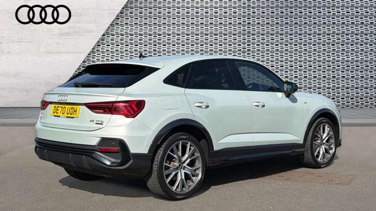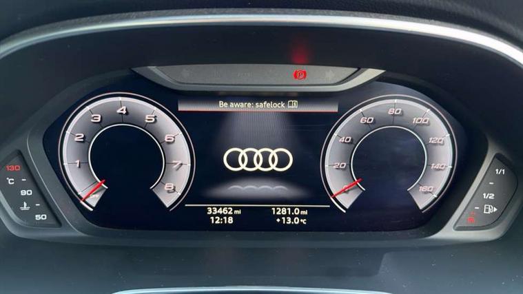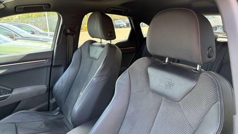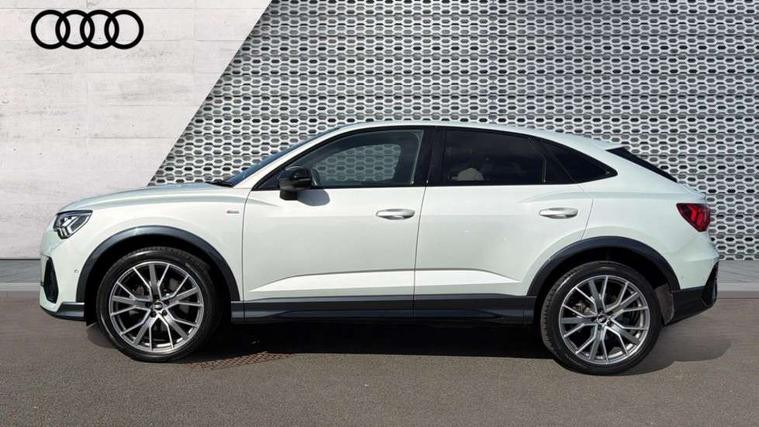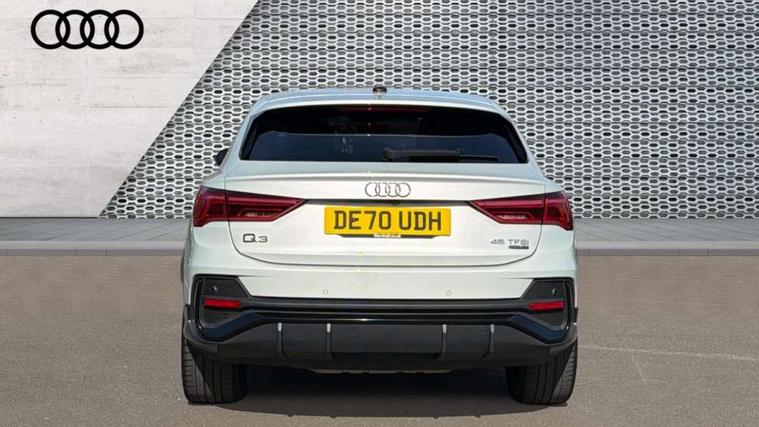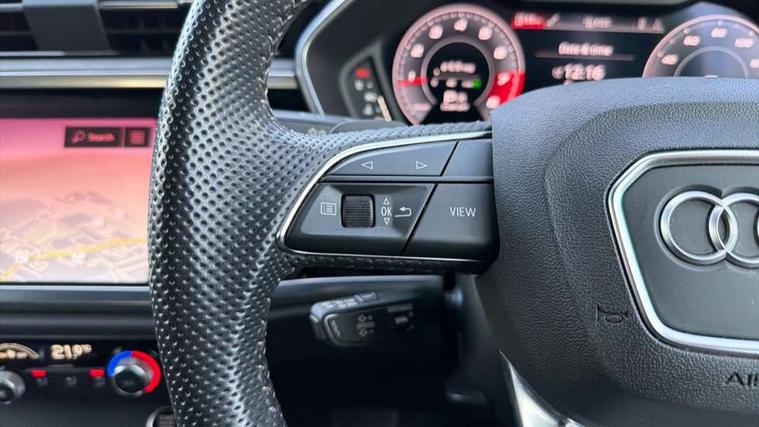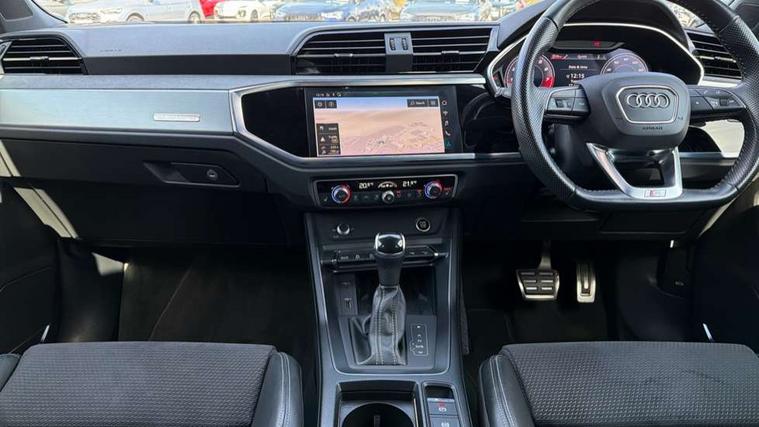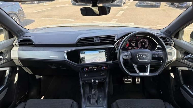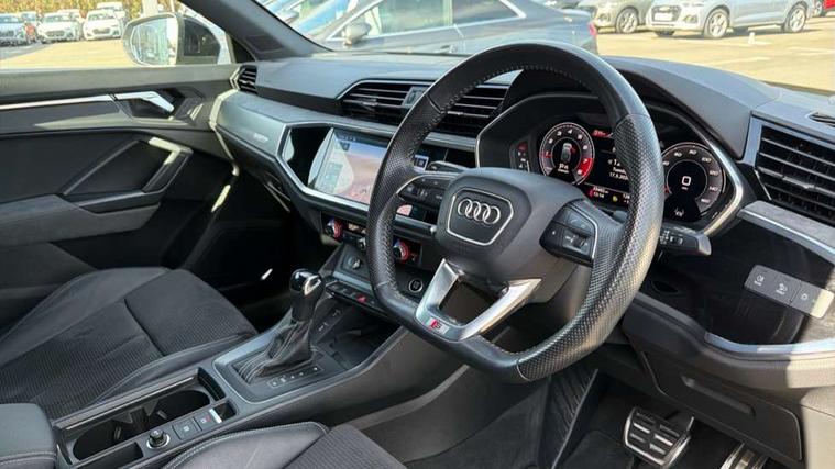 360 degree parking camera, Audi connect safety and service (e-call), Audi drive select, Audi lane departure warning, Audi phone box with wireless charging, Audi side assist, Audi virtual cockpit plus, Bluetooth interface, Camera based traffic sign recognition, MMI Navigation Plus with high resolution 10.1 inch touchscreen colour display, Power operated tailgate, Progressive steering, Rear cross traffic alert, Service interval indicator, Smartphone interface includes wireless Apple carplay/Android Auto, Start stop system with recuperation, Voice control system with natural language interaction, Adaptive suspension with damping control, 1 x USB type C and 1 USB type A charging points, Bang + Olufsen 3D sound system, DAB digital radio module, Acoustic windscreen, Audi Beam uses LEDs to project Vorsprung logo, Auto dimming door mirrors, Auto dimming frameless rear view mirror, Bumpers and underbody protection in contrasting manhattan grey paint finish, Diffuser grille in grained matt black, Diffuser trim in selenite silver, Electrically folding, adjustable and heated door mirrors with integrated LED side indicators and kerb view function for passenger side, Front and rear electric windows, Front fog lights, Front side air inlets in selenite silver, Headlight washers, High gloss black finish B and C pillars, LED daytime running lights, Matrix LED headlights with LED rear lights and dynamic front and rear indicator, Panoramic opening glass sunroof, Privacy glass dark tinted rear and rear-side windows (from B-pillar backwards), Rain and light sensors, Rear underbody protection in matt black, 12V socket in rear centre console, 3 spoke flat bottomed high multi-function leather sport steering wheel with gearshift paddles, 4 way electric lumbar support for driver and front passenger, 40:20:40 folding with manual adjustment for 60:40 forwards/backwards position and backrest angle, Adjustable rear seat bench/backrest with centre armrest and cupholder, Black cloth headlining, Dual zone electronic climate control, Electrically adjustable front seats, Front and rear black floor mats with contrast stitching, Front and rear headrests, Front and rear roof module including reading lights, Front centre armrest, Glove compartment lighting, Heated front seats, Height and reach adjustable steering wheel, Illuminated door sill trims with S logo, ISOFIX child seat mounting for front passenger with airbag deactivation and outer rear seat including top tether attachment point for outer rear seats, Luggage compartment light, Perforated leather gearknob, Stainless steel luggage compartment sill finisher, Stainless steel pedals, Black styling pack - Q3, Driver Assistance Pack - Q3, Multi coloured extended ambient interior lighting pack - Q3, Non smoking pack - Q3, 3x3 point rear seatbelts, 6 airbags - Driver, front passenger, curtain and side windows, Audi pre-sense front with pedestrain and cyclist recognition, Electrically operated child locks on rear doors, Electromechanical parking brake, Electronic stabilisation control including ABS, ASR and EDL, Hill descent control, Hill hold assist, Pre sense basic, Seatbelt monitoring, Tyre pressure warning, Warning triangle and first aid kit, Advanced key, Anti theft alarm, Anti theft wheel bolts, Remote central locking, Black dashboard, Detail dashboard around MMI touch colour display in glass look, black with surround in aluminium look, Leatherette door armrest,