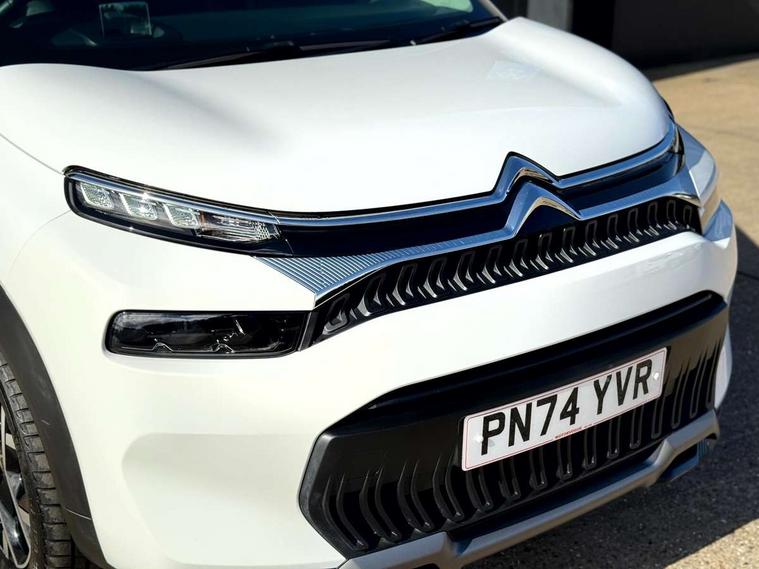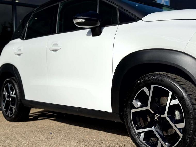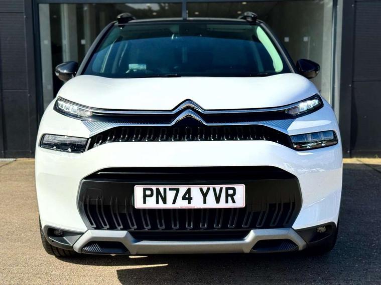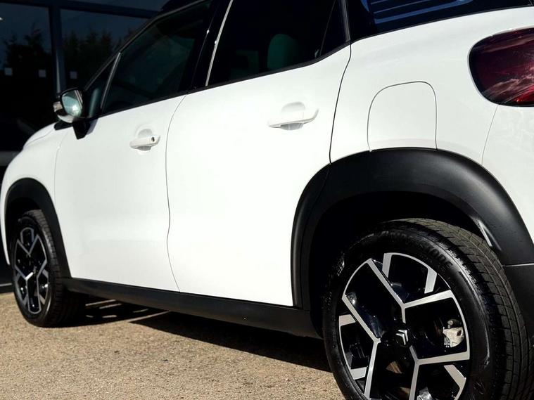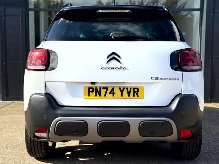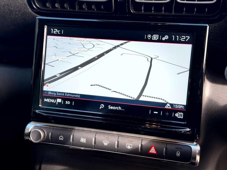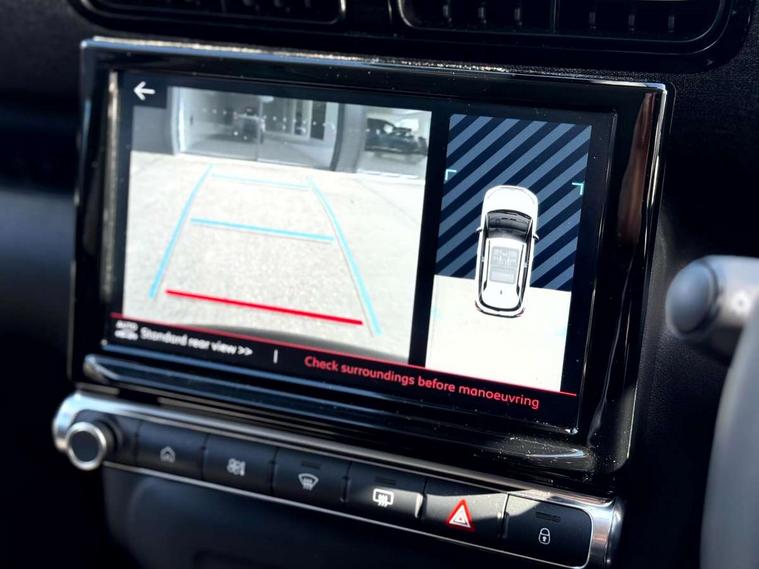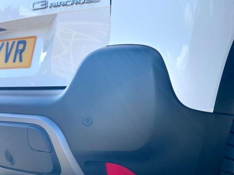 3.5" head up display, 9" Touchscreen display, Citroen connect box emergency and assistance system, Citroen Connect Nav with 3D navigation, Coffee Break Alert, Cruise control with speed limiter, Driver instrument cluster including trip computer and rev counter with white text LCD display and white needles and chrome decor, eCall emergency call system, Engine start button, Lane departure warning system, Mirror screen with Apple CarPlay and Android auto, Outside temperature sensor, Rear parking sensors, Tailgate, Top rear vision reversing camera, Traffic signs and speed limit recognition and recommendation, Variable assistance power steering, Voice recognition for radio, navigation and telephone features, Bluetooth hands free and media streaming with USB socket, Citroen connected DAB radio with 6 speakers, Steering wheel mounted controls for stereo and telephone, 3D effect LED rear lights, Automatic Eco LED headlights, Automatic lights and windscreen wipers, Black roof bars, Body colour painted door handles, Chrome chevrons front grille, Electric front windows + one touch + anti-pinch, Electric rear windows with one touch/anti-pinch, Electrically adjustable door mirrors, Electrically folding door mirrors, Electrochrome rear view mirror, Fog lights integrated into front bumper, Front and rear body coloured bumpers, Heated door mirrors, Integrated roof spoiler, LED daytime running lights, LED third brake light, Rear side wing doors, Rear wiper, Roof aerial, Tinted rear windows and rear quarterpanel glass, Variable front intermittent wipers, 12V socket in front, 12V socket in rear of vehicle, 60/40 split folding rear seats with sliding rear bench, centre armrest and ski flap, Automatic air conditioning, Boot light, Brasilia leather effect and flecked cloth upholstery with metropolitan graphite ambience, advanced comfort seats and wrapped dashboard, Central adjustable armrest on drivers seat, Centre console with closed storage and chrome insert, Driver and front passenger cup holders, Driver and passenger sunvisor with courtesy mirror, Flex load/Pull out boot floor, Front and rear courtesy reading lights, Front and rear door storage, Front head restraints, Front passengers seat flat folding, Glovebox with closable lid, Height adjustable driver's seat, Height and reach adjustable steering wheel, Leather steering wheel with satin chrome inserts and radio controls, Manual handbrake with chrome insert, Passenger compartment headlight adjustment, Rear isofix mounting points (outside seats) with top tether, Row 2 - Three seats with individually adjustable head rests, Satin chrome interior door handles, Single front passenger seat, Gloss black colour pack - C3 Aircross Max, 3 point, height adjustable, pre tensioned front seatbelts, ABS with Electronic brakeforce distribution and Emergency braking assistance, Active safety brake including Forward collision warning, Automatic illumination of hazard warning lights, Curtain airbags, Driver airbag, Drivers/passengers and rear seats unfastened seat belt warning, ESC (Electronic Stability Control), Front lateral airbags, Front passenger airbag, Front passenger airbag deactivation switch, Hill start assist function, Mono-tone horn, Rear door child safety locks, Three 3 point rear seatbelts, Tyre pressure monitor, Automatic door and boot locking when moving off with automatic unlocking in case of impact, Automatic locking of the vehicle (after 30 seconds if door or boot unopened), Immobiliser, Keyless entry and keyless start, Perimetric and volumetric anti theft alarm, Remote central locking + deadlocks, Vehicle locater function (headlights illuminate when button on key pressed), Gloss black centre console, Satin chrome air vent decors,