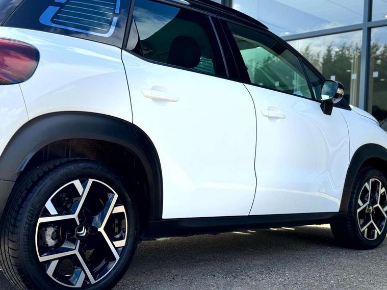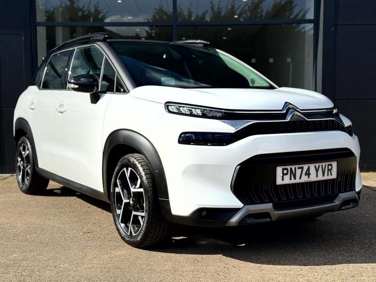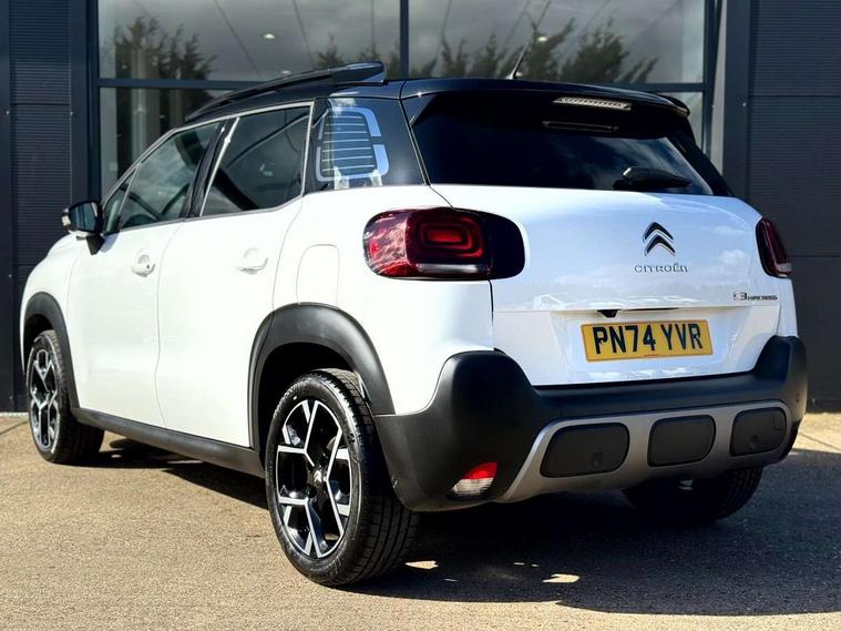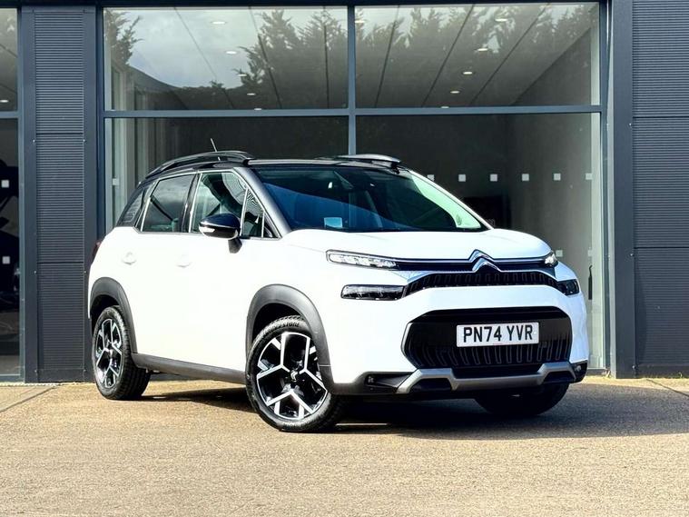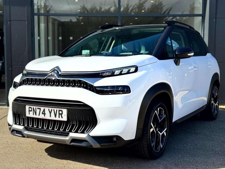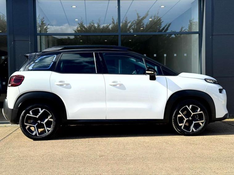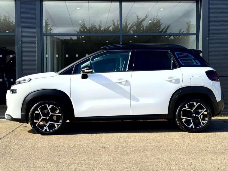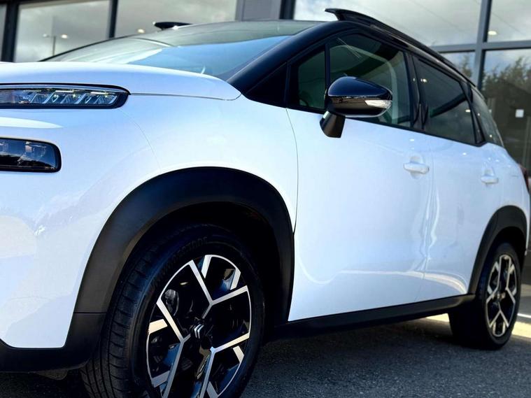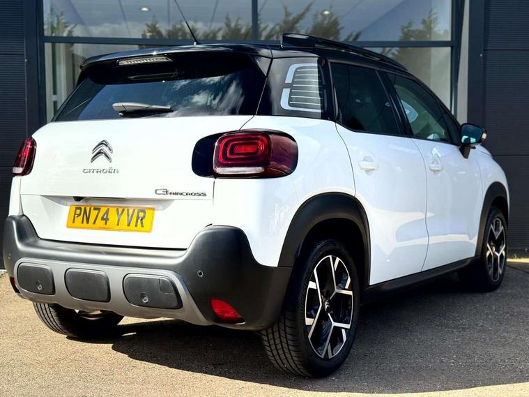 3.5" head up display, 9" Touchscreen display, Citroen connect box emergency and assistance system, Citroen Connect Nav with 3D navigation, Coffee Break Alert, Cruise control with speed limiter, Driver instrument cluster including trip computer and rev counter with white text LCD display and white needles and chrome decor, eCall emergency call system, Engine start button, Lane departure warning system, Mirror screen with Apple CarPlay and Android auto, Outside temperature sensor, Rear parking sensors, Tailgate, Top rear vision reversing camera, Traffic signs and speed limit recognition and recommendation, Variable assistance power steering, Voice recognition for radio, navigation and telephone features, Bluetooth hands free and media streaming with USB socket, Citroen connected DAB radio with 6 speakers, Steering wheel mounted controls for stereo and telephone, 3D effect LED rear lights, Automatic Eco LED headlights, Automatic lights and windscreen wipers, Black roof bars, Body colour painted door handles, Chrome chevrons front grille, Electric front windows + one touch + anti-pinch, Electric rear windows with one touch/anti-pinch, Electrically adjustable door mirrors, Electrically folding door mirrors, Electrochrome rear view mirror, Fog lights integrated into front bumper, Front and rear body coloured bumpers, Heated door mirrors, Integrated roof spoiler, LED daytime running lights, LED third brake light, Rear side wing doors, Rear wiper, Roof aerial, Tinted rear windows and rear quarterpanel glass, Variable front intermittent wipers, 12V socket in front, 12V socket in rear of vehicle, 60/40 split folding rear seats with sliding rear bench, centre armrest and ski flap, Automatic air conditioning, Boot light, Brasilia leather effect and flecked cloth upholstery with metropolitan graphite ambience, advanced comfort seats and wrapped dashboard, Central adjustable armrest on drivers seat, Centre console with closed storage and chrome insert, Driver and front passenger cup holders, Driver and passenger sunvisor with courtesy mirror, Flex load/Pull out boot floor, Front and rear courtesy reading lights, Front and rear door storage, Front head restraints, Front passengers seat flat folding, Glovebox with closable lid, Height adjustable driver's seat, Height and reach adjustable steering wheel, Leather steering wheel with satin chrome inserts and radio controls, Manual handbrake with chrome insert, Passenger compartment headlight adjustment, Rear isofix mounting points (outside seats) with top tether, Row 2 - Three seats with individually adjustable head rests, Satin chrome interior door handles, Single front passenger seat, Gloss black colour pack - C3 Aircross Max, 3 point, height adjustable, pre tensioned front seatbelts, ABS with Electronic brakeforce distribution and Emergency braking assistance, Active safety brake including Forward collision warning, Automatic illumination of hazard warning lights, Curtain airbags, Driver airbag, Drivers/passengers and rear seats unfastened seat belt warning, ESC (Electronic Stability Control), Front lateral airbags, Front passenger airbag, Front passenger airbag deactivation switch, Hill start assist function, Mono-tone horn, Rear door child safety locks, Three 3 point rear seatbelts, Tyre pressure monitor, Automatic door and boot locking when moving off with automatic unlocking in case of impact, Automatic locking of the vehicle (after 30 seconds if door or boot unopened), Immobiliser, Keyless entry and keyless start, Perimetric and volumetric anti theft alarm, Remote central locking + deadlocks, Vehicle locater function (headlights illuminate when button on key pressed), Gloss black centre console, Satin chrome air vent decors,