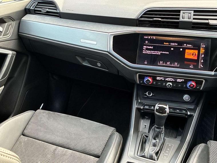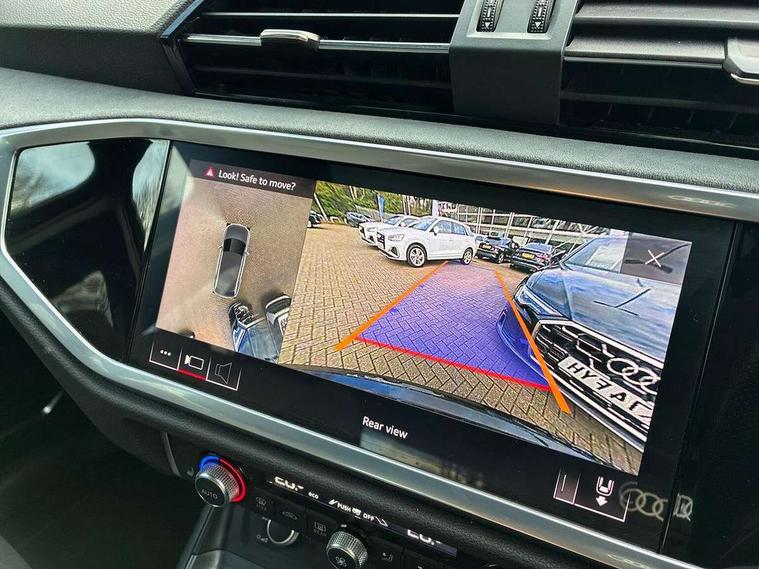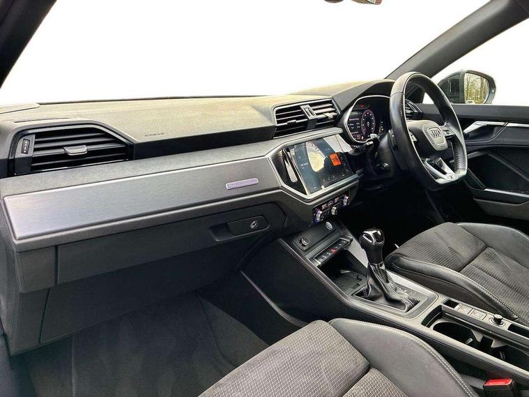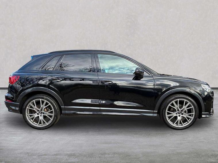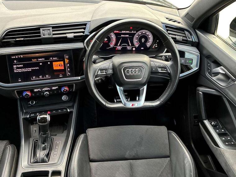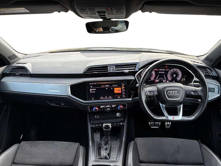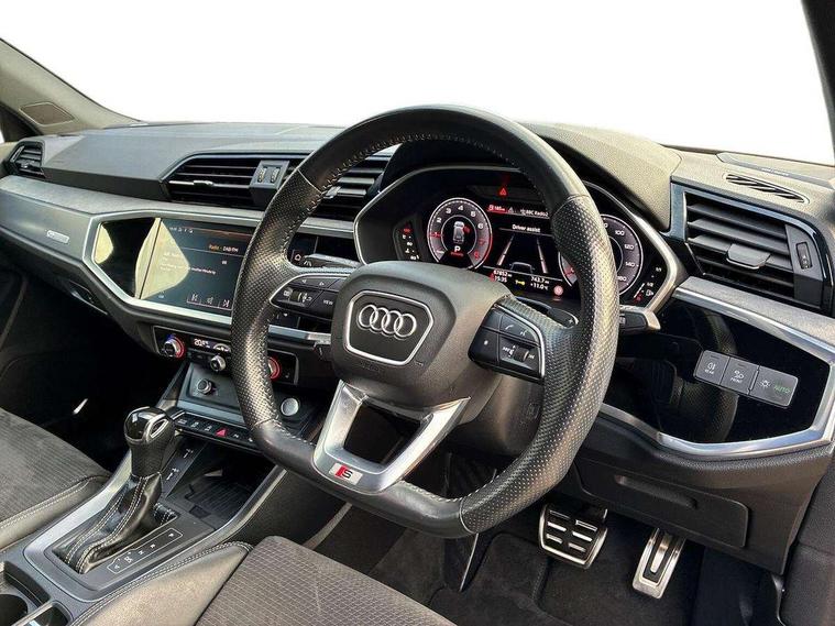 360 degree parking camera, Audi connect safety and service (e-call), Audi drive select, Audi lane departure warning, Audi phone box with wireless charging, Audi side assist, Audi smartphone interface includes wireless Apple carplay/Android Auto, Audi virtual cockpit plus, Bluetooth interface, Camera based traffic sign recognition, MMI Navigation Plus with high resolution 10.1 inch touchscreen colour display, Power operated tailgate, Progressive steering, Rear cross traffic alert, Service interval indicator, Start stop system with recuperation, Voice control system with natural language interaction, 48V Mild hybrid technology, Adaptive suspension with damping control, 1 x USB type C and 1 USB type A charging points, Bang + Olufsen 3D sound system, DAB digital radio module, Acoustic windscreen, Audi Beam uses LEDs to project the Audi Sport logo, Auto dimming door mirrors, Auto dimming frameless rear view mirror, Black roof rails, Electrically folding, adjustable and heated door mirrors with integrated LED side indicators and kerb view function for passenger side, Front and rear electric windows, Front fog lights, Front spoiler blade in matt platinum grey, Headlight washers, High gloss black finish B and C pillars, Matrix LED headlights with LED rear lights and dynamic front and rear indicator, Panoramic opening glass sunroof, Privacy glass dark tinted rear and rear-side windows (from B-pillar backwards), Rain and light sensors, Rear diffuser strip in matt titanium black, S line bumpers in contrasting Manhattan grey, 12V socket in rear centre console, 3 spoke flat bottomed high multi-function leather sport steering wheel with gearshift paddles, 4 way electric lumbar support for driver and front passenger, 40:20:40 folding with manual adjustment for 60:40 forwards/backwards position and backrest angle, Adjustable rear seat bench/backrest with centre armrest and cupholder, Black cloth headlining, Dual zone electronic climate control, Electrically adjustable front seats, Front and rear black floor mats with contrast stitching in rock grey, Front and rear headrests, Front and rear roof module including reading lights, Front centre armrest, Glove compartment lighting, Heated front seats, Height and reach adjustable steering wheel, Illuminated door sill trims with S logo, ISOFIX child seat mounting for front passenger with airbag deactivation and outer rear seat including top tether attachment point for outer rear seats, Luggage compartment light, Perforated leather gearknob, Stainless steel luggage compartment sill finisher, Stainless steel pedals, Tool kit, Black styling pack - Q3, Driver Assistance Pack - Q3, Multi coloured extended ambient interior lighting pack - Q3, Non smoking pack - Q3, 3x3 point rear seatbelts, 6 airbags - Driver, front passenger, curtain and side windows, Electrically operated child locks on rear doors, Electromechanical parking brake, Electronic stabilisation control including ABS, ASR and EDL, Hill descent control, Hill hold assist, Pre sense basic, Seatbelt monitoring, Tyre pressure warning, Warning triangle and first aid kit, Advanced key, Anti theft alarm, Anti theft wheel bolts, Audi pre-sense front with pedestrain and cyclist recognition, Remote central locking, Leatherette door armrest, MMI touch colour display in glass look, black with surround in aluminium look, Tyre repair kit,