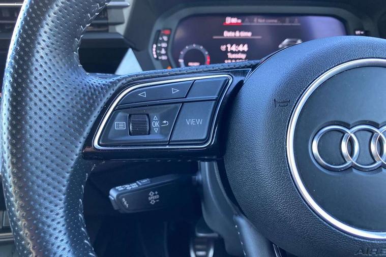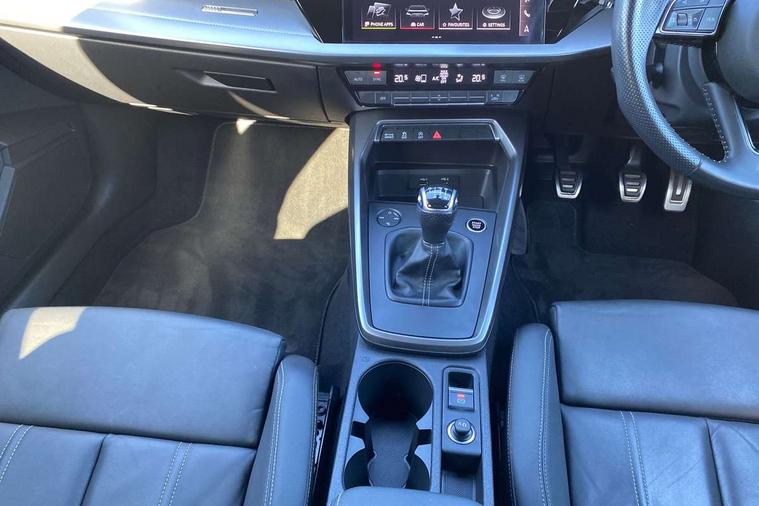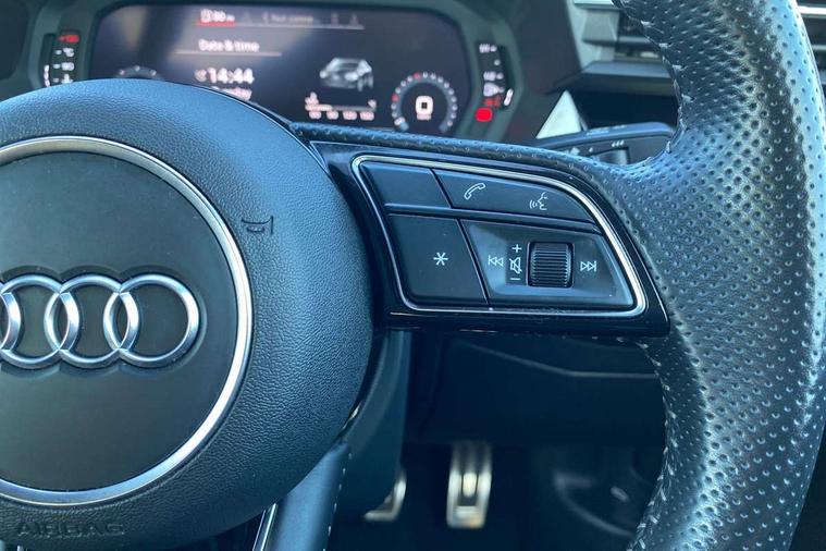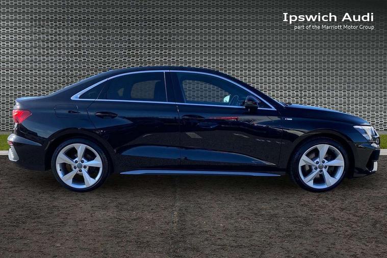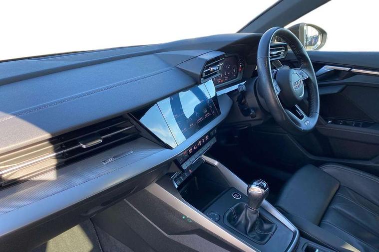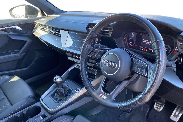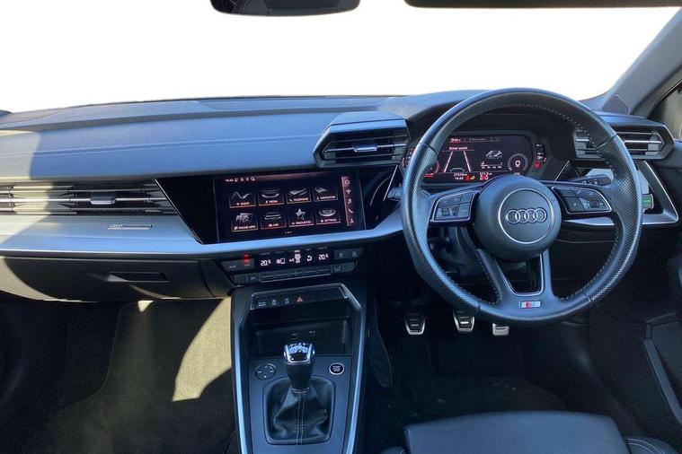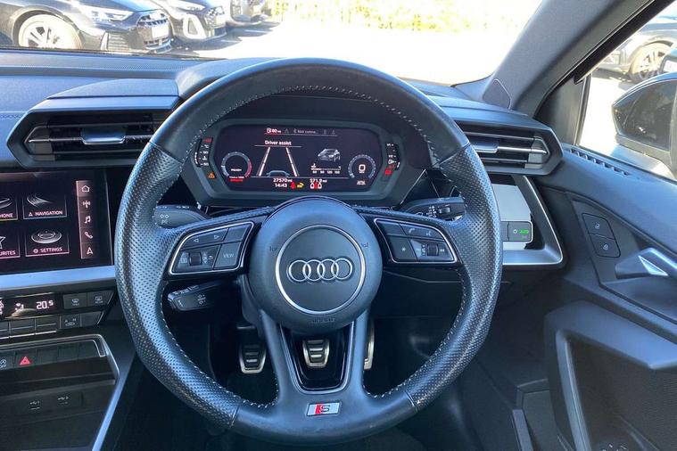 Audi connect emergency call and service, Audi drive select (Auto, Comfort, Dynamic, Efficiency and Individual), Audi smartphone interface, Audi Virtual Cockpit - 10.25" digital and colour instrument cluster, Automatic start/stop system with recuperation, Bluetooth interface, Collision avoidance assistant, Cruise control + speed limiter, Electromechanical power speed sensitive steering, Lane departure warning system, MMI Navigation Plus with high resolution 10.1" colour touch screen display, Rear parking sensors, Service indicator, Voice control system with natural language interaction, 1xUSB-A and 1xUSB-C connection, 6 passive loudspeakers, CD player, DAB Digital radio, Acoustic glass windscreen, Aluminium window trim, Auto dimming frameless rear view mirror, Body colour exterior mirrors, Electrically adjustable/heated/folding/auto dimming door mirrors with integrated LED indications + kerb view function for passenger side, Front electric windows, Illuminated door sills with aluminium inserts at the front with S logo, LED daytime running lights, Light and rain sensors, Model and engine designation badges at rear, Privacy glass - dark tinted rear window, rear door and side windows, Rear electric windows, S line bumpers, S roof spoiler, 12V socket and storage compartment in front centre console, 40/20/40 split folding rear seat bench with cupholder, Black cloth headlining, Dual zone electronic climate control, Front and rear centre armrest in leather, Front and rear headrests, Front/rear floor mats, Height and reach adjustable steering wheel, Interior lighting - glove compartment light and right hand side, Luggage compartment floor covering, Manual boot compartment lid, Manually adjustable front seats, Seat side bolsters, Stainless steel pedals and front footrest, Twin leather upholstery with front sports seats S embossed logo, Aluminium interior elements pack - A3, S line styling pack - A3 Saloon, 3x3 point rear seat belts, Driver and front passenger airbag with passenger airbag deactivation, Electronic Stabilisation Control (ESC) including ABS, ASR and EDL, First aid kit with warning triangle and 2 safety vests, Hill hold assist, Pre-sense front with pedestrian and cyclist detection, Seatbelt monitoring, Tyre pressure loss indicator, Anti theft alarm, Anti-theft wheel bolts, Electronically operated child lock, Immobiliser, Remote control central locking, Aluminium air vent surrounds, Aluminium trim elements, Dark spectrum aluminium inlays, accent surfaces in the dashboard and centre console in platinum grey silk effect paint finish,