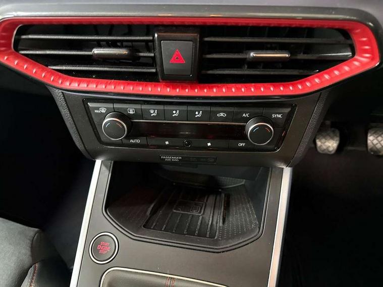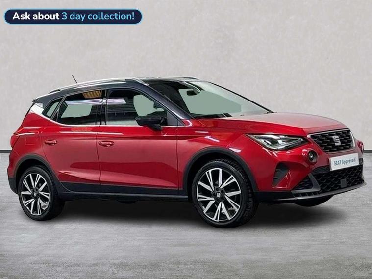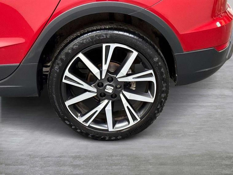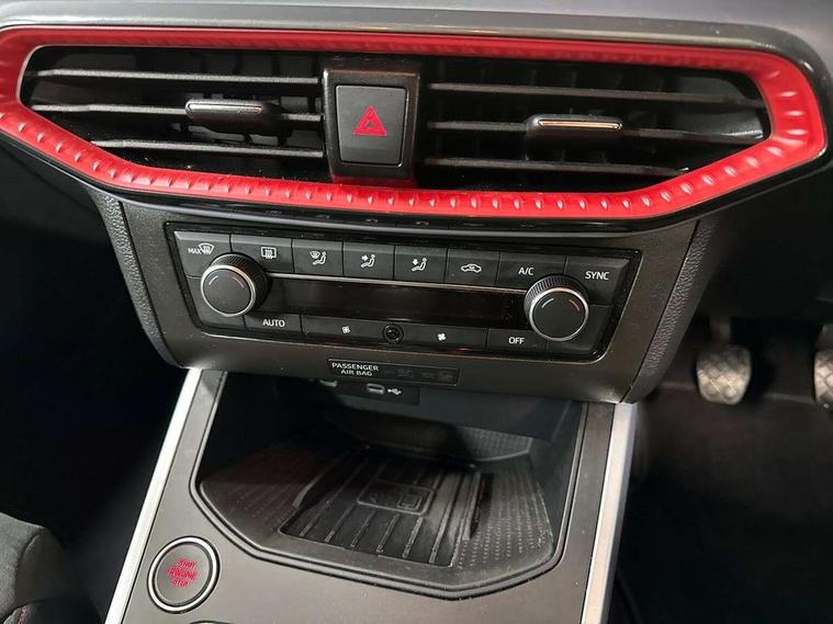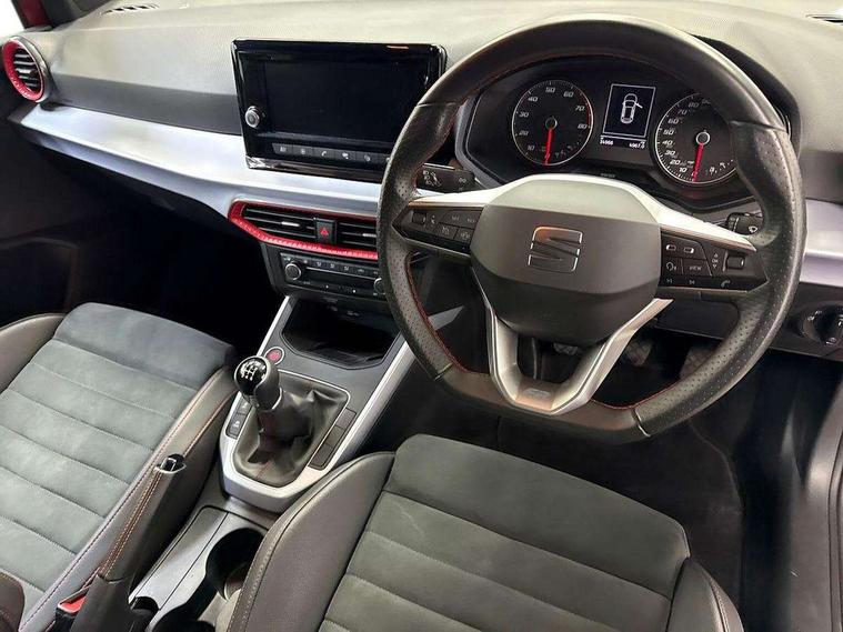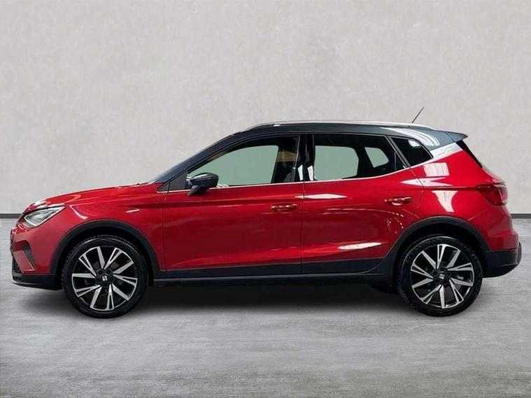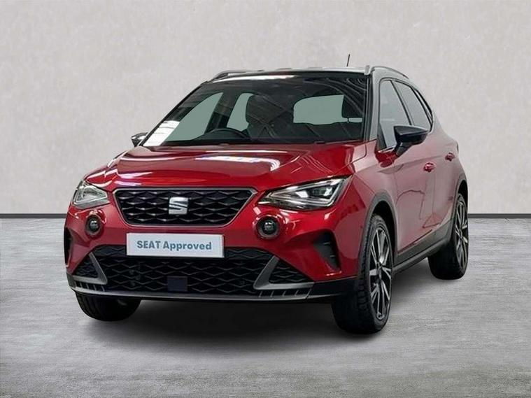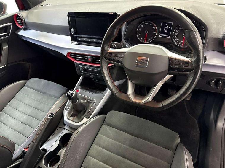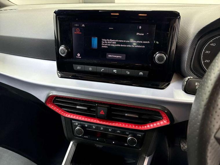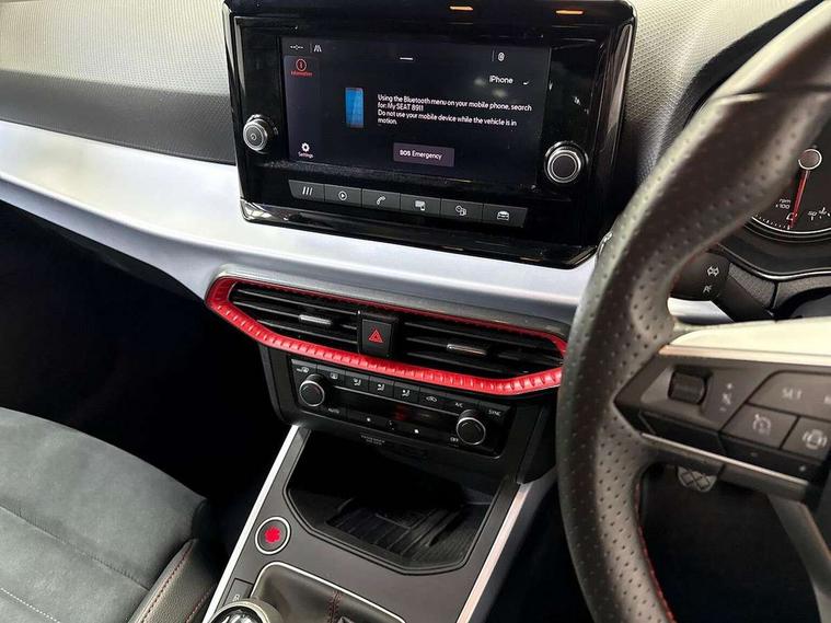 'Lights On' Reminder warning buzzer, Analogue cockpit with physical dials, Digital clock, E-call, Electric speed sensitive power steering, Full Link Smartphone Integration with Mirror Link, Apple Car Play, Google Android Auto with USB Type C cable for Apple and Android compatibility, Lane keeping system, Low fuel warning light, Outside temperature display, Rear parking sensor, RPM counter, Seat connect with safety, service and remote, SEAT Drive profile - Four different models normal-sport-eco-individual, steering response, throttle response, Trip computer, Wireless phone charger, Bluetooth interface for hands free and audio streaming, DAB digital radio and AM/FM radio, Media system with 8.25" colour touchscreen with USB port (type c), Steering wheel mounted audio controls, Anti theft roof antenna, Automatic activation of hazard warning lights, Body coloured bumpers, Body coloured door handle inserts, Chrome roof rails and window surrounds, Dark tinted rear windows, Dimming rear view mirror, Electric front/rear windows, Electrically adjustable and heated door mirrors, Front fog lights with cornering function and rear fog light, FULL LED automatic headlights with dynamic headlight range control, coming and leaving home, LED daytime running lights, LED rear tail lights and licence plate lights, Protective side mouldings, Rear side wing doors, Rear spoiler, Rear window wash/wipe, Roof colour door mirrors, Third brake light, Twin exhaust pipe styling hidden exhaust pipe, Visible VIN plate, Windshield wiper with intermittent control and potentiometer, 2 cupholders, 3 seat bench in 2nd row, 60/40 split folding rear seat, Aircare filter, Black interior roof, Double boot floor, Driver sunvisor with covered mirror + card holder, Dual zone climate control, Front comfort seats, Front courtesy light with 2x front and 2x rear reading lights, Gear shift indicator, Height adjustable front seats, Height/reach adjustable steering column, Illuminated boot, Instrument lighting with brightness control, Interior ambient lighting, Interior light in footwell, central console and door panel, ISOFIX points in outer rear seats with top tether anchorage points, Microsuede cloth upholstery, Passenger sunvisor with vanity mirror, Perforated flat bottomed leather steering wheel/gear knob/handbrake with red stitching and FR logo, Single front passenger seat, Two front and three rear height adjustable headrests, Interior chrome pack - Arona, 3 point seatbelts on all rear seats, ABS, Active front headrests, Child locks on rear doors, Driver and front passenger airbags with front passenger airbag de activation, front side and curtain airbags, Electronic stability control, Emergency Brake Assist (EBA) and front assist, Front and rear seatbelt reminder, Hill hold control, Multi-Collision braking, Tiredness recognition system, Traction control, Tyre pressure monitoring system, Alarm with back-up horn, Electronic engine immobiliser, KESSY Keyless entry and go, Locking wheel bolts, Remote central locking + deadlocks, Tow away protection, Titan black dashboard,